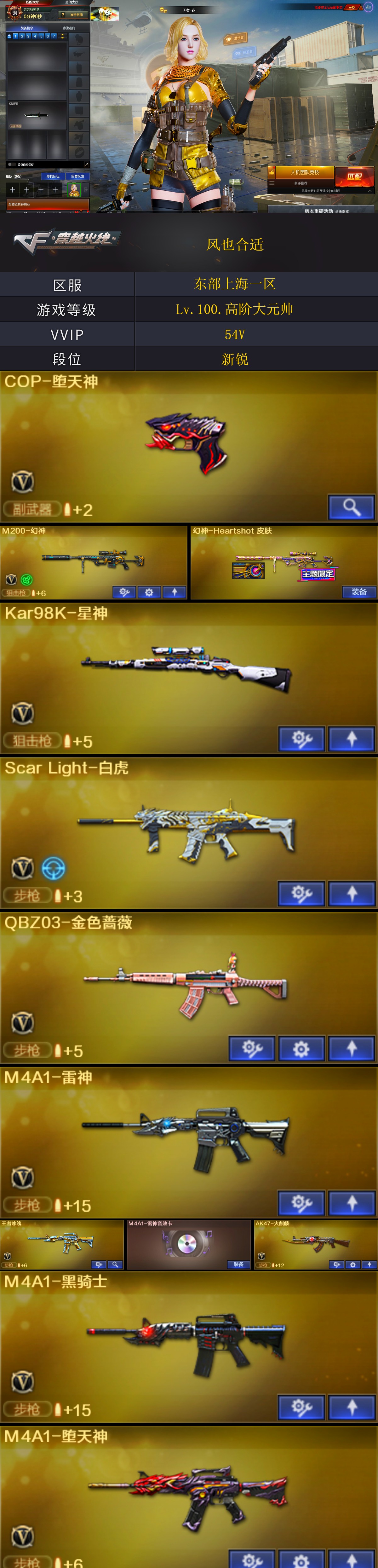 【★找回包赔★东部170】:东部上海一区-54v-可二次实名-【lv.100.高阶大元帅】-【段位:新锐】m200-幻神/幻神-heartshot皮肤/kar98k-星神/scarlight-白虎/q03-金色蔷薇/cop-堕天神/m4a1-黑骑士/毁灭-荣耀之怒/barrett-毁灭音效卡/王者春(截图展示段位不代表实际段位,如赛季更新等不可抗拒因素发生变化,其余道具看截图或咨询客服)
