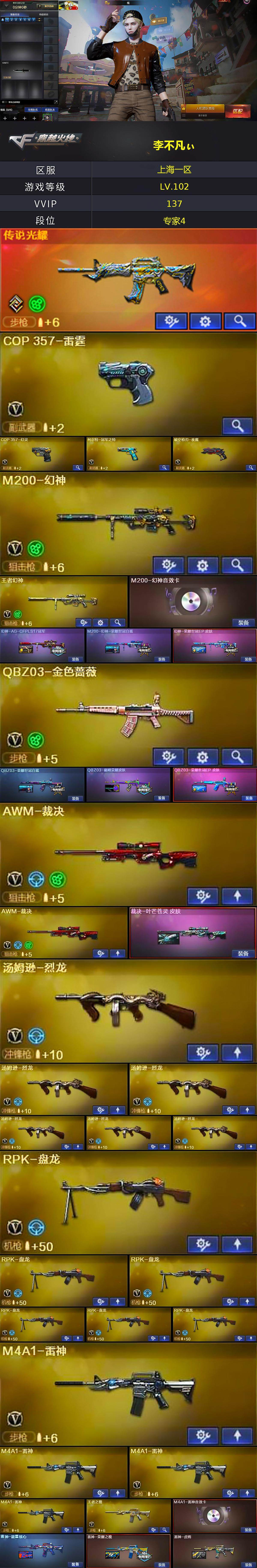 上海一区-136v-17王者-4炫金 【传说武器】:传说光耀 【热门武器】:传说光耀,q03-金色蔷薇,hk417-朱雀,m4a1-青龙,m200-幻神,死亡之眼,柯尔特-冠军之特,c.a.t,m4a1-黑骑士4,汤姆逊-烈龙6,rpk-盘龙6,加特林-炼狱3,羊驼玩偶,火麒麟-绝迹,cop-白鲨,cop 357-幻灵,沙鹰-修罗4 【王者炫金武器】:超新星-悦享,王者之怒,王者