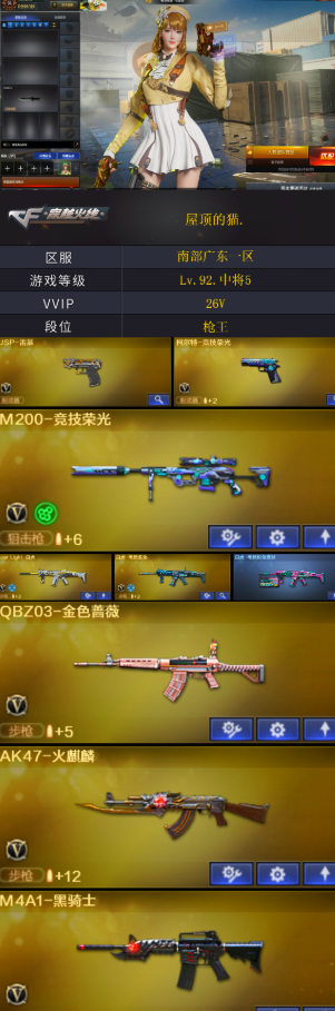 【★找回包赔★南部2006】:南部广东一区-26v-可二次实名-【lv.92.中将5】-【段位:呛王】m200-竞技荣光/scarlight-白虎/白虎-电玩蓝兔/白虎-电玩粉兔皮肤/q03-金色蔷薇/usp-雷暴/柯尔特-竞技荣光/m4a1-黑骑士(截图展示段位不代表实际段位,如赛季更新等不可抗拒因素发生变化,其余道具看截图或咨询客服)