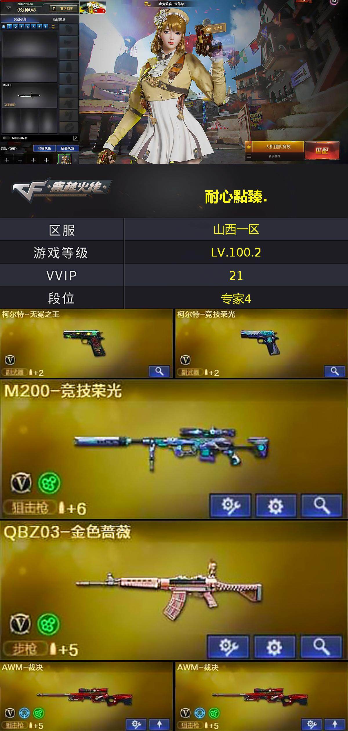 【hxd28】17v/100级/元帅/5王者/1英雄/q03-金色蔷薇/m200-竞技荣光/m4a1-黑骑士/沙鹰-修罗/王者之武/电竞教官-云悠悠/北极狐-x/初恋灵狐/嘉年华灵狐/娟娟/灵狐者-黄金海岸/潘多拉-x/樱-战斗天使/awm-灵狐-15周年嘉年华/生化手蕾-机甲核心/神圣爆裂者iii/无影神兵利器/王者火魄-觉醒版/awm-裁决/王者之光-觉醒版/沙鹰-天神/柯尔特-无冕之