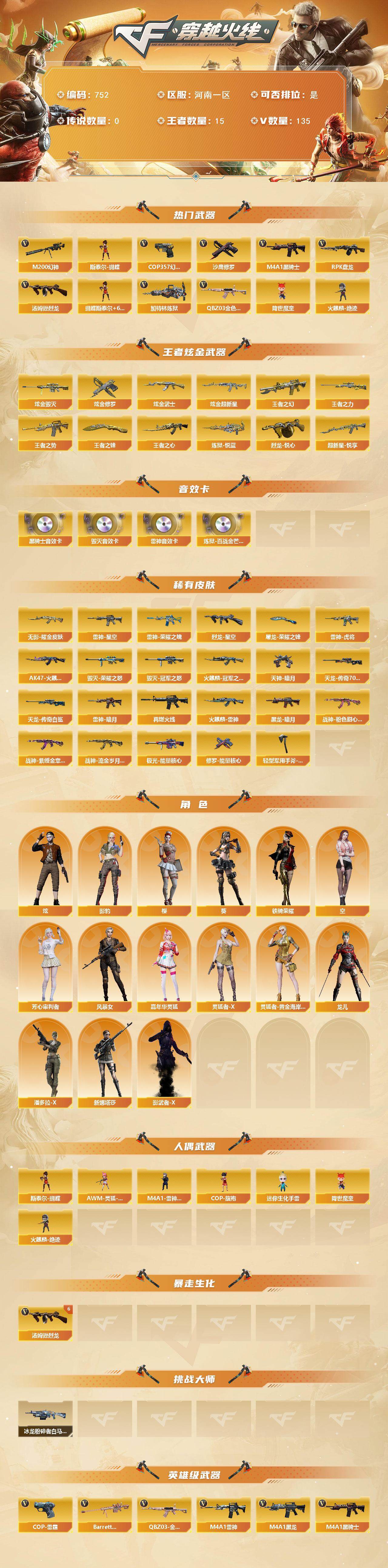 [14764060]河南一区-135v-15王者-5炫金 【热门武器】:q03-金色蔷薇,m200-幻神,m4a1-黑骑士3,汤姆逊-烈龙8,rpk-盘龙4,加特林-炼狱4,斯泰尔-蝴蝶,降世魔童,火麒麟-绝迹,cop 357-幻灵,沙鹰-修罗5 【王者炫金武器】:超新星-悦享,王者之幻,王者之势,王者之心,王者之力,炼狱-悦蓝,烈龙-悦心,王者之锋2,炫金武士,炫金超新星,炫金毁灭,炫金修罗2 【音效卡】:m4a1-雷神音效卡,m4a1-黑骑士音效卡,barrett-毁灭音效卡,炼狱-百战金芒-庆典舞曲音效卡 【皮肤】:烈龙-星空,雷神-暗月,雷神-荣耀之魄2,雷神-星空3,雷神-虎将,m4a1-再燃火线,火麒麟-雷神,火麒麟-冠军之心,ak47-火麒麟-传奇even,毁灭-荣耀之怒,毁灭-冠军之怒,黑龙-暗月,无影耀金皮肤,战神-粉色甜心皮肤2,战神-紫绶金章皮肤,战神-流金岁月皮肤,awm-天龙-传奇70kg,awm-天龙-传奇白鲨,极光-能量核心,修罗-能量核心2,天神-暗月,屠龙-荣耀之锋,轻型军用手斧-再燃火线 【角色】:葵,樱,炫,影豹,空,芳心审判者,风暴女,嘉年华灵狐,灵狐者-x,灵狐者-黄金海岸,龙儿,潘多拉-x,铁骑荣耀,新娜塔莎,影武者-x 【人偶武器】:火麒麟-绝迹,m4a1-雷神-精英刀锋,斯泰尔-蝴蝶,awm-灵狐-15周年嘉年华2,cop-旗袍,迷你生化手蕾,降世魔童 【挑战大师】:冰龙粉碎者-白马银呛 【英雄级武器】:ak47-火麒麟2,m4a1-黑龙3,m4a1-雷神7,m4a1-黑骑士3,ak47-无影2,m4a1-死神,ak47-黑武士2,ak12-天启,an94-超新星2,ak47-黑鲨,m4a1-龙血3,m4a1-雷霆,无影-神兵利器,q03-金色蔷薇,m4a1-猎神,王者之影-觉醒版,王者之魄-觉醒版,ak-47-猩红传说3,ak47-b-战神,awm-天龙2,barrett-毁灭4,barrett-极光4,awm-裁决2,m200-幻神,barrett-朱雀,barrett-金色蔷薇2,王者之怒-觉醒版,rpk-盘龙4,加特林-炼狱4,炼狱-百战金芒,汤姆逊-烈龙8,aa-12-雷霆,沙鹰-修罗5,沙鹰-天神,cop-雷霆,cop 357-幻灵,王者之魂-觉醒版,屠龙