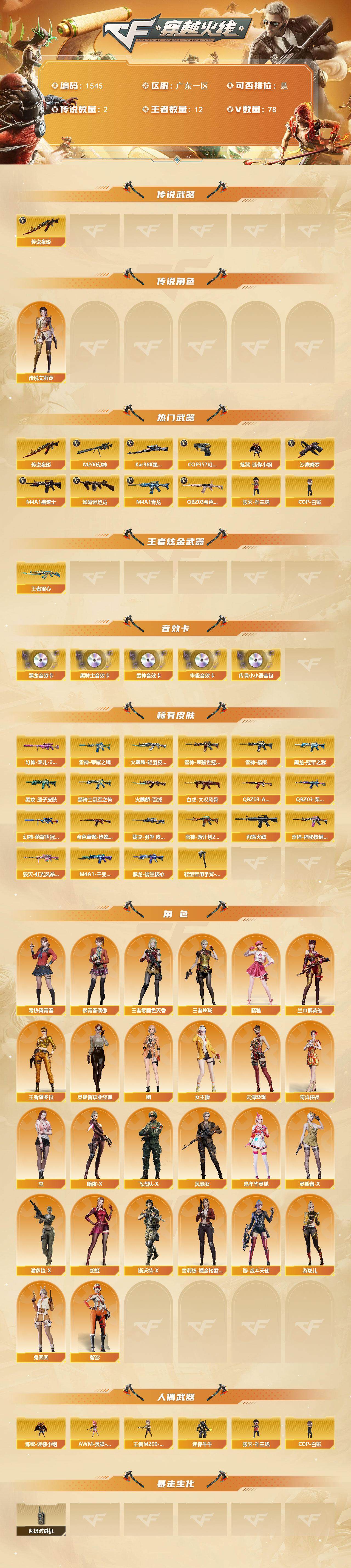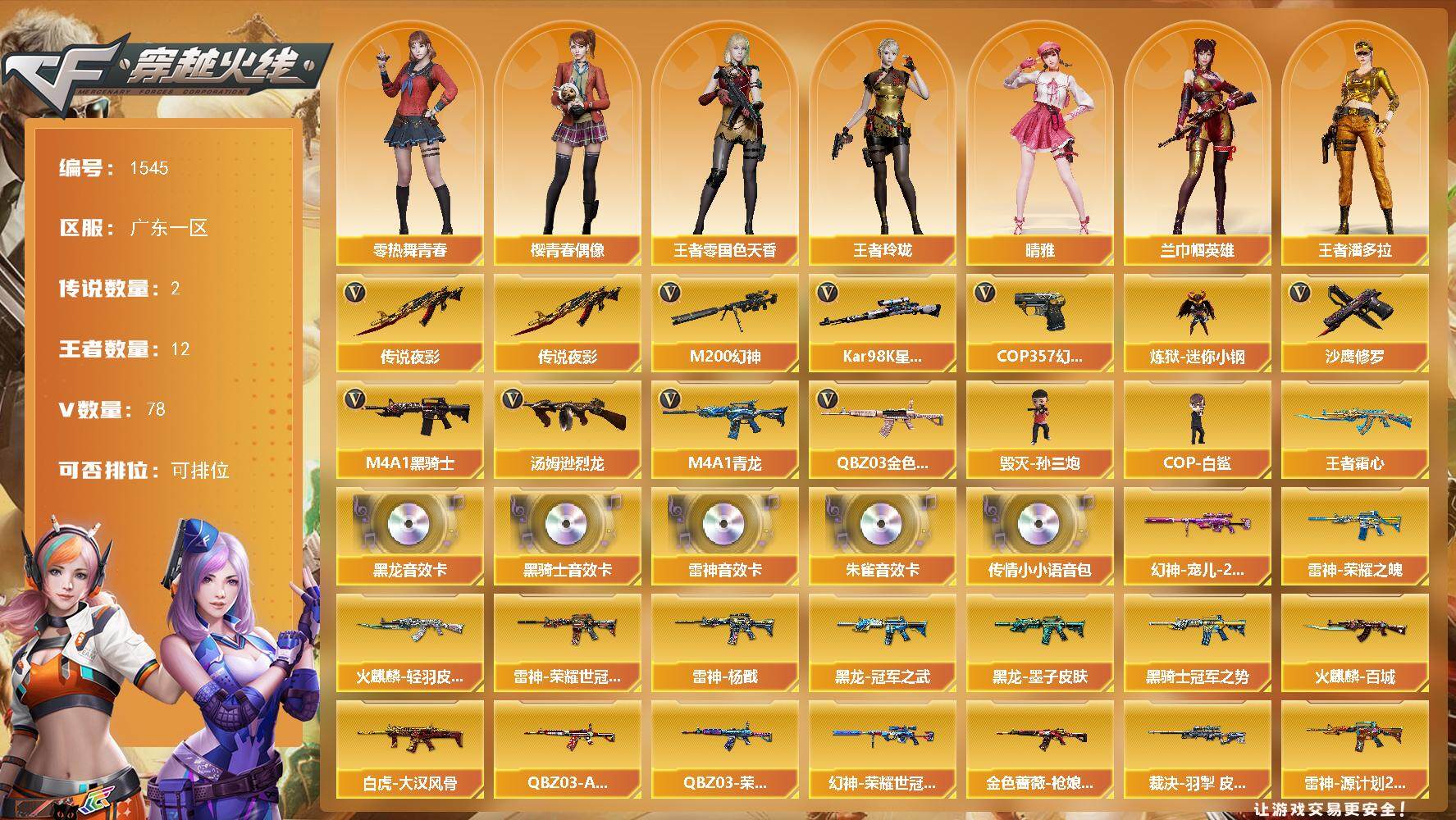 【1545】贝15989可排位-可二次【广东一区/88v/vip6/2传说】【纯白无封号/四防传说艾莉莎/传说夜影幻神2皮肤/裁决带皮/神工天巧套/6修罗/角色都开四防/16吧手呛拉满/9套雷】【cop357-幻灵3/usp-神工天巧4/cop 357-云龙】【m200-幻神/幻神-宠儿/m200-幻神-荣耀世冠白鲨】【kar98k-星神】【awm-裁决/裁决-羽掣皮】【王者风神】【q03-金色蔷薇/q03-金色蔷薇音效卡/q03-荣耀世冠白鲨/金色蔷薇-呛娘阿敏皮/q03-ag-cfpls19冠军】【白虎之魄/q03-天罚/m4a1-神工天巧/m4a1-青龙/m4a1-龙血】【m4a1-雷神2/m4a1-雷神音效卡/雷神-荣耀之魄/雷神-荣耀世冠ag/雷神-杨戬】【王者霜心/王者芳薇/王者风势/王者之势/王者之力】【barrett-毁灭/毁灭-墨兰/毁灭-虹光风暴皮】【ak47-火麒麟/火麒麟-百城/火麒麟-cfstar2/火麒麟-轻羽皮肤】【m4a1-黑骑士/m4a1-黑骑士音效卡/黑骑士-冠军之势】【m4a1-黑龙/黑龙-冠军之武/黑龙-墨子皮肤/黑龙-能量核心】【hk417-朱雀音效卡】【ak47-黑武士2】【天龙-cfstar】【m4a1-千变/m4a1-千变-孔明皮肤】【汤姆逊-烈龙】【沙鹰-修罗6/修罗-cfstar2】【擎天】【屠龙】【龙啸-烈火龙威】【晴雅/女主播/王者潘多拉/王者玲珑/王者-零-国色天香/暗夜-x/零-热舞青春/樱-青春偶像/兰-巾帼英雄/幽/木兰/奇洋探员/云海玲珑/兔囡囡/妲己/潘多拉-x/斯沃特-x/幻影】【an94-超新星/超新星-热带奇洋】【colt1911-小故障/cop 357-青龙/新usp-呛王排位奖励2】【龙啸-热带奇洋/唐刀-神工天巧2】【神圣爆裂者-末日iii/冰龙粉碎者-白马银呛】【炼狱-迷你小钢】【猫猫手套/cop-白鲨/毁灭-孙三炮/王者m200-无畏金戈】【闪光丹-云龙/盐雾蛋-云龙】【闪光丹-雷霆王者】【高爆手蕾-神工天巧7/闪光丹-神工天巧7/盐雾蛋-神工天巧8】【高爆手蕾-幻灵5/闪光丹-幻灵】【手蕾-热带奇洋】【传情小小语音包/语音特效-机器人】【超级护目镜/透明护目镜/烟雾保护头盔/闪光护目镜/超级对讲机/超级背包/炫彩背包/防弹头盔4/防弹衣4/c4工具钳4/手蕾包4/防化服3】截图展示段位不代表实际段位,如赛季更新等不/拒因素发生变化、时限道具不保证所剩时间。标题未写送点卷默认不送