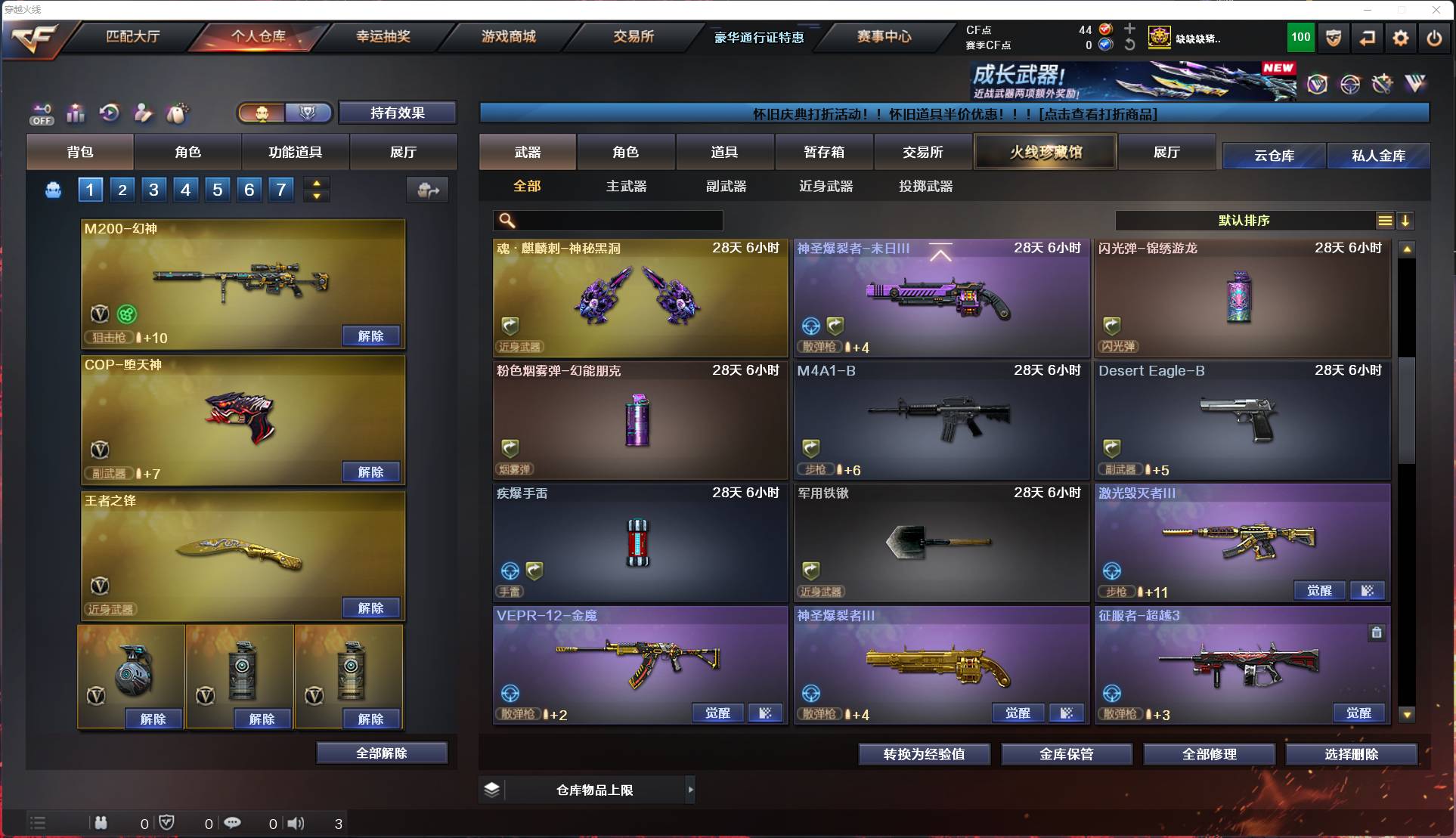 001fq: s3357广西一区cf;【精品爆破生化号】m200-幻神hk417-朱雀barrett-极光vepr-12-金魔擎天awm-裁决9a91-烈火ak12-天启barrett-金色蔷薇ak47-无影aa-12-雷霆激光毁灭者iii高爆手蕾-雷霆王者之灵cop-堕天神炫金毁灭m4a1-龙血ak47-b-战神神圣爆裂者iiim4a1-夜魔盐雾蛋-雷霆龙啸ak47-黑鲨炫金骑士ak47-黑武士炼狱-悦蓝-觉醒版迷你深渊冰龙ak-47-猩红传说闪光丹-雷霆烈龙-悦心-觉醒版炫金雷神盐雾蛋-夜魔屠龙barrett-毁灭m4a1-雷神ak47-b-战士rpk-盘龙炫金修罗王者之锋-觉醒版死亡之眼ak47-火麒麟王者之击-觉醒版破空呛刃-夜魔m4a1-黑骑士;详细看图手慢无!!!!