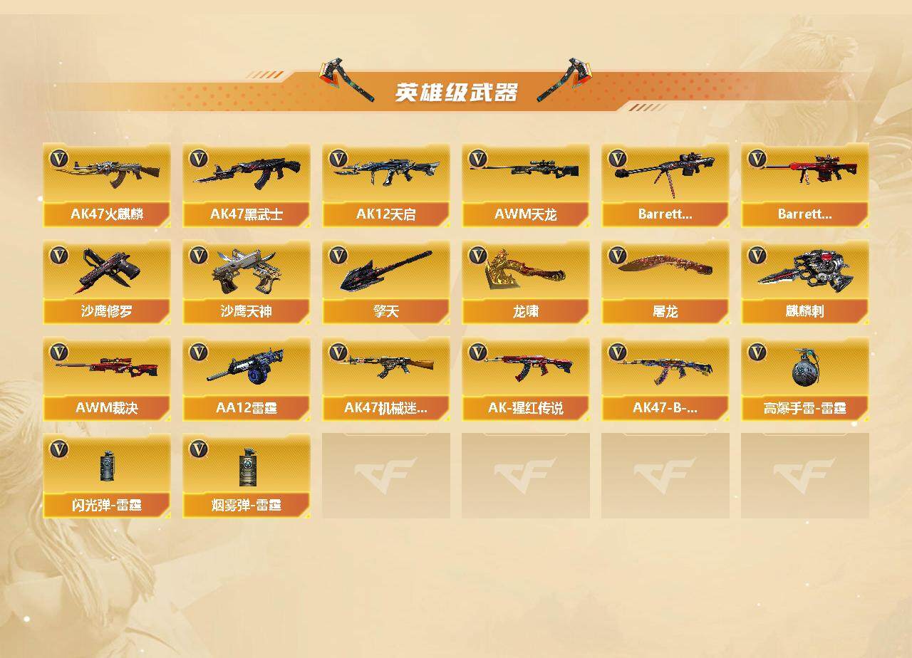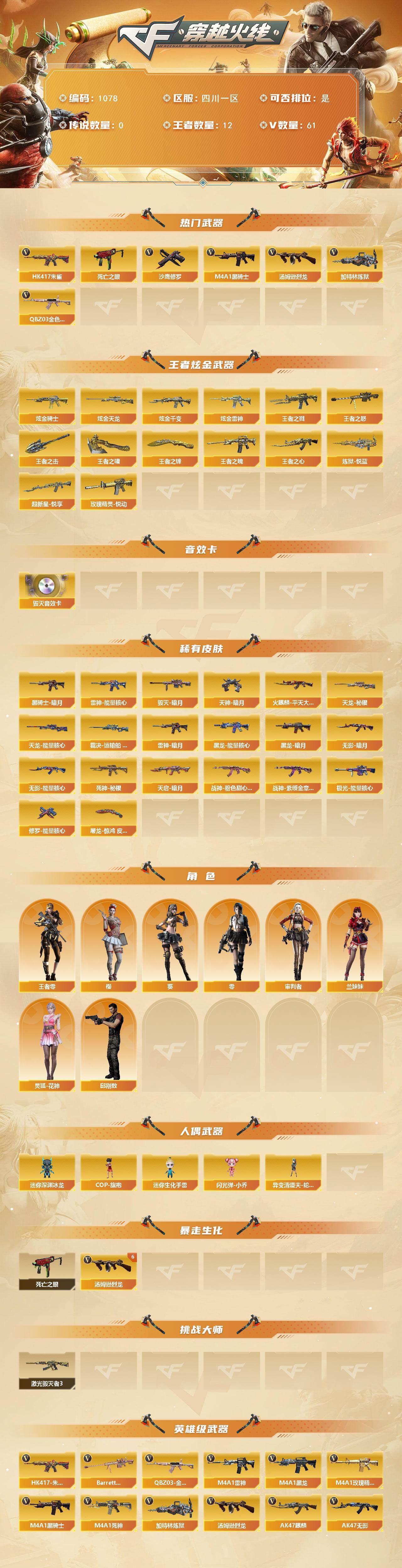 [14785901]四川一区-61v-12王者-4炫金 【热门武器】:q03-金色蔷薇,hk417-朱雀,死亡之眼,m4a1-黑骑士,汤姆逊-烈龙6,加特林-炼狱,沙鹰-修罗4 【王者炫金武器】:王者之戮,超新星-悦享,玫瑰精灵-悦动,王者之魄,王者之心,王者之怒,炼狱-悦蓝2,王者之啸,王者之击,王者之锋,炫金骑士,炫金千变,炫金雷神,炫金天龙 【音效卡】:barrett-毁灭音效卡 【皮肤】:裁决-运输船 皮肤,雷神-暗月,雷神-能量核心,火麒麟-平天大圣,毁灭-暗月3,黑龙-能量核心,黑龙-暗月,黑骑士-暗月3,无影-暗月,无影-能量核心,死神-秘银,天启-暗月,战神-粉色甜心皮肤,战神-紫绶金章皮肤3,天龙-秘银2,天龙-能量核心,极光-能量核心2,修罗-能量核心4,天神-暗月2,屠龙-惊鸿 皮肤 【角色】:零,葵,樱,审判者,王者-零,兰妹妹,灵狐-花神,邱刚敖 【人偶武器】:异变清道夫-蛇影双骄,cop-旗袍,迷你深渊冰龙2,迷你生化手蕾,闪光丹-小乔 【暴走生化】:死亡之眼 【挑战大师】:激光毁灭者iii 【英雄级武器】:ak47-火麒麟2,ak47-麒麟,m4a1-黑龙,m4a1-雷神2,m4a1-黑骑士,ak47-无影,m4a1-死神,ak47-黑武士,ak12-天启,ak47-机械迷城,hk417-朱雀,m4a1-玫瑰精灵,q03-金色蔷薇,ak-47-猩红传说2,ak47-b-战神,awm-天龙,barrett-毁灭,barrett-极光,awm-裁决,barrett-金色蔷薇,加特林-炼狱,汤姆逊-烈龙6,aa-12-雷霆,沙鹰-修罗4,沙鹰-天神3,屠龙6,龙啸2,擎天4,麒麟刺,高爆手蕾-雷霆,闪光丹-雷霆,盐雾蛋-雷霆 【道具】:战舰背包,炫彩背包,超级背包2,女皇终结者-魔龙之吻,绿色巨人,灵魂忍者,变异宝贝,迷雾幽灵,夺命之镰,防化服2,金色流光-呛王排位2,星辰流光-呛王排位,流光-鎏金之域,呛王排位28赛季金色流光,防弹头盔2,防弹衣3,c4工具钳3,手蕾包2 【特殊呛械】:1黑骑士,6烈龙,1炼狱