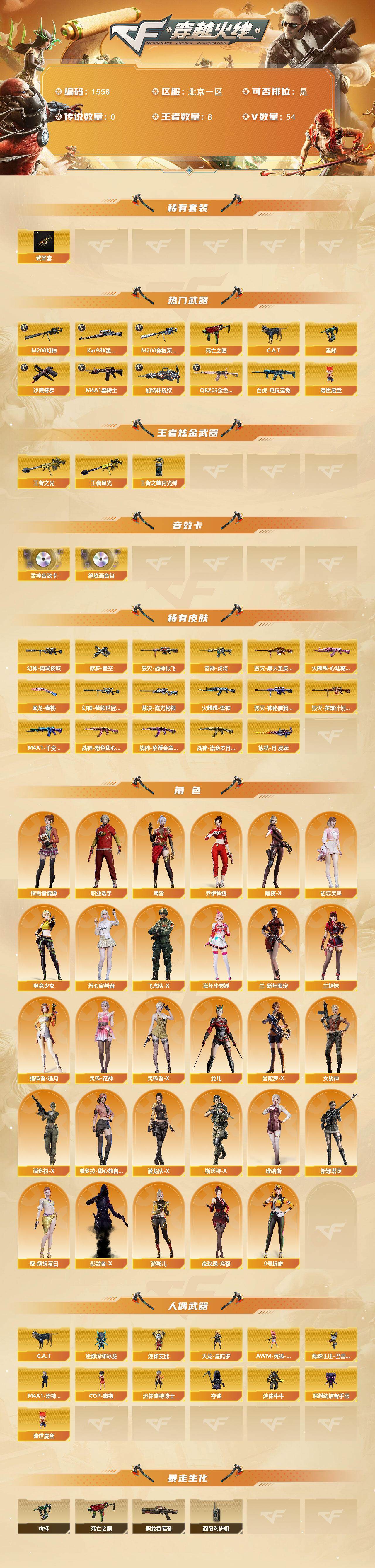 【1558】贝84096北部北京一区可排位可二次【北京一区/54v/vip5】【幻神2皮肤/裁决带皮肤/武圣套/5手呛/雷神三件套】【m200-幻神/幻神-周瑜皮肤/幻神-荣耀世冠白鲨2023,皮肤】【m200-竞技荣光】【kar98k-星神】【awm-裁决/裁决-流光秘银】【q-03-王者蔷薇/q03-金色蔷薇】【白虎-电玩蓝兔】【m4a1-雷神/m4a1-雷神音效卡/雷神-虎将】【glock18-武圣/雷霆之契】【barrett-毁灭4/毁灭-战神张飞】【ak47-火麒麟2/火麒麟-cfstar/火麒麟-心动糖果/火麒麟-雷神】【m4a1-黑骑士】【m4a1-黑龙2】【无影-神兵利器】【ak47-黑武士/黑武士-锦绣游龙】【m4a1-千变/m4a1-千变-孔明皮肤】【加特林-炼狱/炼狱-月,皮肤】【死亡之眼】【沙鹰-修罗/修罗-星空】【沙鹰-天神/天神-动感闪耀】【麒麟刺】【擎天】【屠龙/屠龙-动感闪耀/屠龙-春桃,皮肤】【职业选手/龙儿/暗夜-x/樱-青春偶像/樱-缤纷夏日/女战神/木兰/乔伊教练/兰-新年限定/灵狐-花神/蜀雪/潘多拉-x/斯沃特-x/影武者-x/新娜塔莎/堕天使/复仇者】【m4a1-雷霆王者/m4a1-龙血2/m4a1-武圣】【ak47-b-战士/ak47-b-战神/ak-47-猩红传说2】【barrett-朱雀/barrett-暗月传说】【colt1911-小故障2/colt,1911-大黄蜂2/柯尔特-萌杀/cop,357-青龙4/新usp-呛王排位奖励4】【斩神刀/迷你深渊冰龙4】【神圣爆裂者iii/激光毁灭者iii-白马银呛/激光毁灭者iii/ak47-冰龙粉碎者/冰龙粉碎者-白马银呛】【黑龙吞噬者/轻型军用手斧-镜】【猫猫手套/c.a.t/m4a1-雷神-精英刀锋/cop-旗袍/天龙-曼陀罗/海滩汪汪-芭蕾特/夺魂】【王者之心/王者之光】【高爆手蕾-竞技荣光2/闪光丹-竞技荣光2/盐雾蛋-竞技荣光】【高爆手蕾-雷霆/闪光丹-雷霆/盐雾蛋-雷霆】【闪光丹-雷霆王者/盐雾蛋-雷霆王者】【绝迹语音包】【超级护目镜/透明头盔/烟雾保护头盔/闪光护目镜/超级对讲机/超级背包/炫彩背包/防弹头盔7/防弹衣7/c4工具钳4/手蕾包5/防化服2】截图展示段位不代表实际段位,如赛季更新等不/拒因素发生变化、时限道具不保证所剩时间。标题未写送点卷默认不送 【稀有套装】:雷神三件套,武圣套