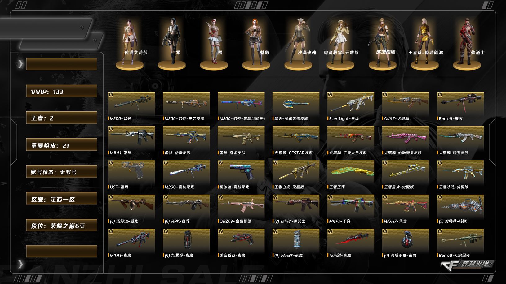 7669/南部/江西一区/可排位/133v/2传说【四防传说角色/传说艾莉莎/】/传说夜影/【幻神三件套/幻神/幻神黄忠/幻神荣耀世冠白鲨/幻神音效卡/】/王者白虎/觉醒版/王者星神/觉醒版/6盘龙/6炼狱/6烈龙【竞技荣光套/m200竞技荣光/柯尔特竞技荣光/擎天竞技荣光/】/【白虎三件套/白