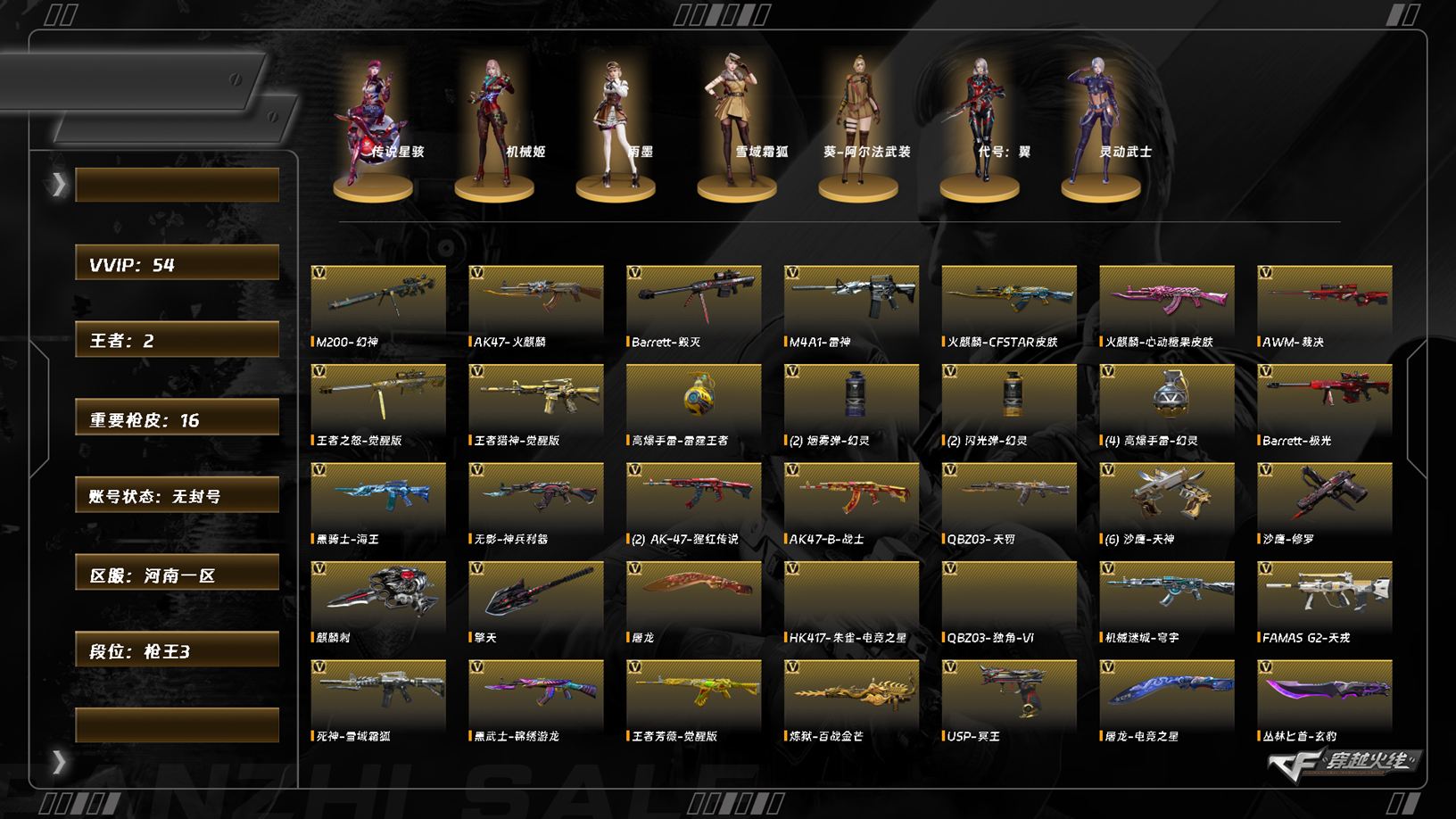 7671/北部/河南一区/可排位/53v/【四防传说角色/传说星骇/】/幻神/q天罚/q独角vl/【裁决三件套/裁决/裁决运输船/裁决凤灵/裁决音效卡/】/朱雀电竞之星/死神雪域霜狐/死神雪域霜狐怀旧音效卡/usp冥王/【角色】/机械姬/雨墨/幻面灵狐/葵阿尔法武装/雪域霜狐/【音效卡/