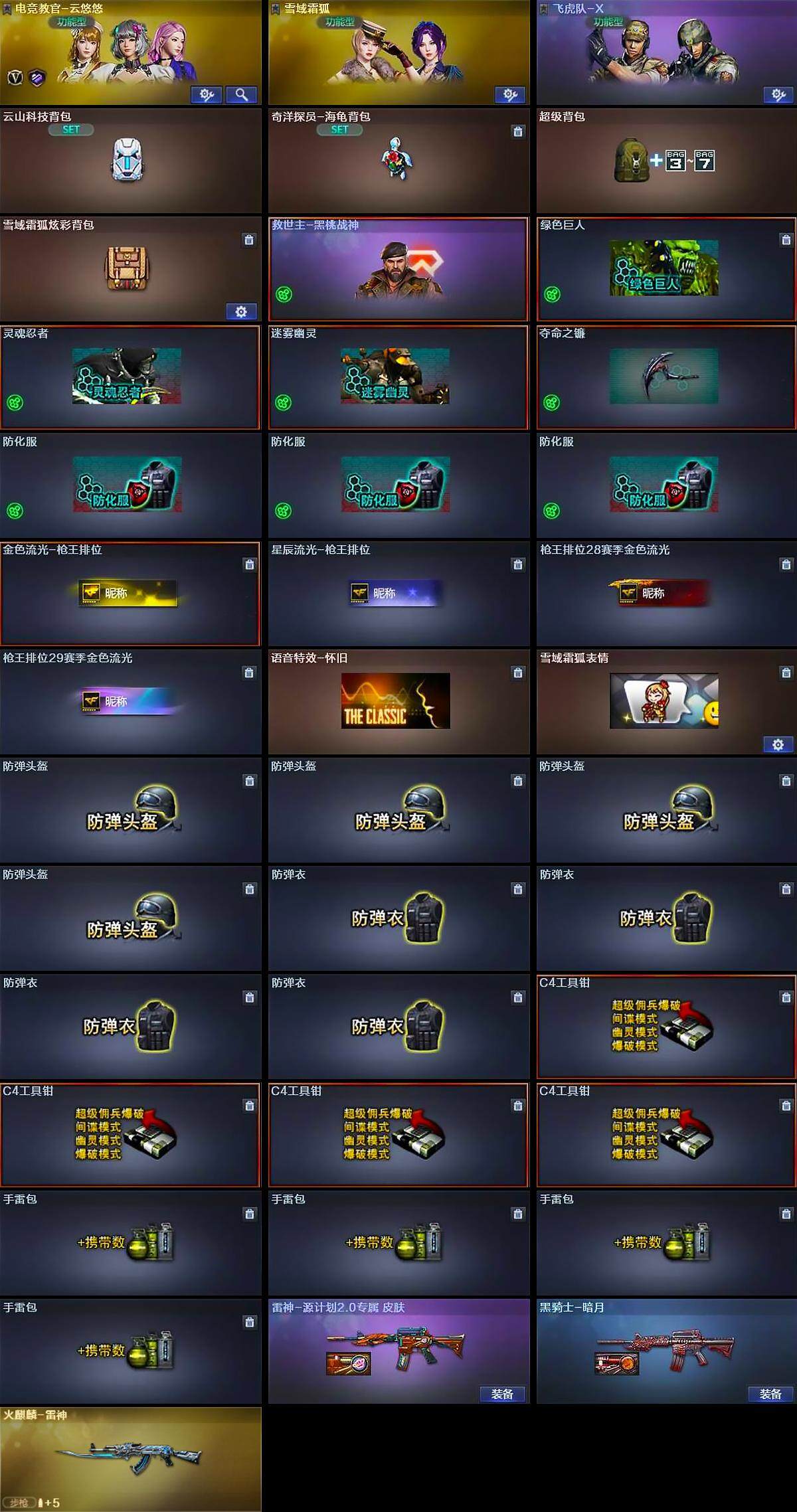 重庆一区-9v-1王者-0炫金 【道具】:云山科技背包2,奇洋探员-海龟背包2,超级背包2,雪域霜狐炫彩背包2,救世主-黑桃战神2,绿色巨人2,灵魂忍者2,迷雾幽灵2,夺命之镰2,防化服6,金色流光-呛王排位2,星辰流光-呛王排位2,呛王排位28赛季金色流光2,呛王排位29赛季金色流光2,语音特效-怀旧2,雪域霜狐表情2,防弹头盔8,防弹衣8,c4工具钳8,手蕾包8 【热门武器】:m200-竞技荣光 【皮肤】:雷神-源计划2.0专属 皮肤,火麒麟-雷神,黑骑士-暗月 【角色】:电竞教官-云悠悠,雪域霜狐,飞虎队-x 【人偶武器】:深渊终结者手蕾 【挑战大师】:冰龙粉碎者-白马银呛 【英雄级武器】:m4a1-雷神,an94-超新星2,m200-竞技荣光,柯尔特-竞技荣光3,擎天-竞技荣光,m4a1-赤狱骑士 【特殊呛械】: