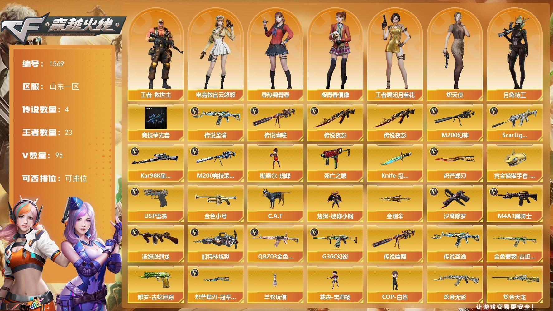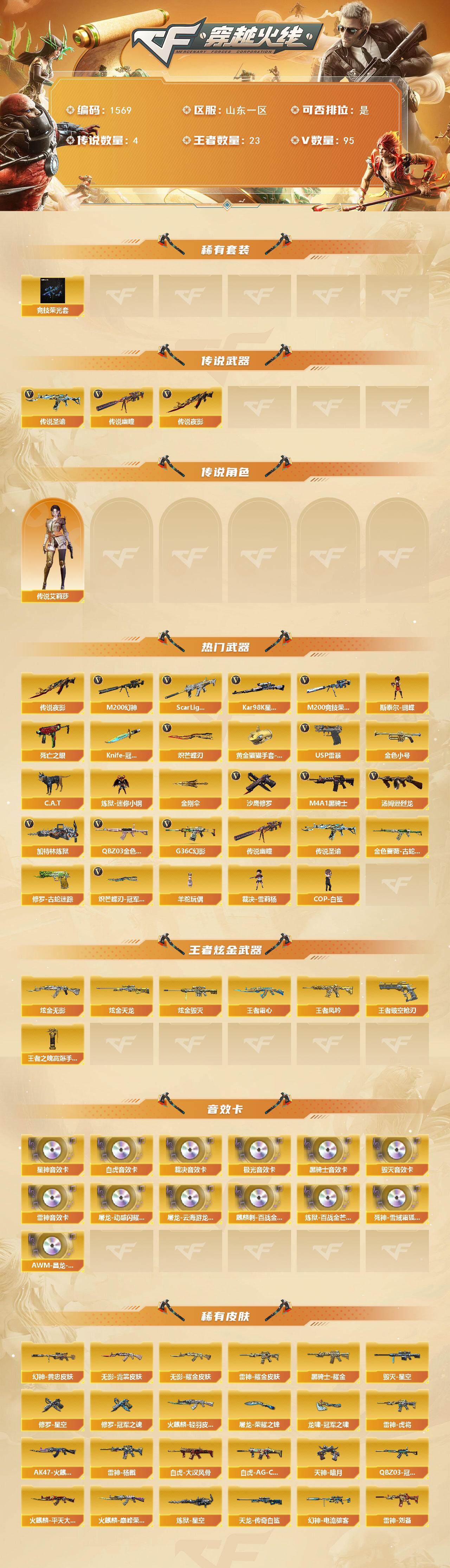 【1569】贝33402北部山东一区可排位可二次【山东一区/110v/vip6/4传说】【三角洲满红皮/北极星/信条/黑海/电锯/177m】【安卓和平29粉装/10粉呛/6载具/8珍稀飞行器/283套装/279呛皮】【超核玩家/四防传说艾莉莎/传说圣谕/传说夜影/传说幽瞳/幻神三皮肤/星神三件套/裁决三件套/臻选次元套挑战九阶段/竞技荣光套/9手呛/7四防角色/9套雷/主流武器齐全都带皮肤】【m200-幻神/m200-幻神-黄忠皮肤/幻神-电流骇客,皮肤/幻神-荣耀世冠白鲨2023,皮肤】【awm-裁决/awm-裁决音效卡/裁决流光秘银】【kar98k-星神/kar98k-星神音效卡/星神-巅峰荣耀,皮肤】【m200-竞技荣光】【白虎之魄】【炽芒蝶刃】【knife-冠军之刃/黄金猫猫手套-白鲨】【g36c-幻影】【柯尔特-竞技荣光/usp-雷暴】【scar,light-白虎/scar,light-白虎音效卡/白虎-ag-cfpls20冠军/白虎-大汉风骨】【q-03-王者蔷薇/q03-金色蔷薇/q03-冠军之薇】【隼】【m4a1-雷神5/m4a1-雷神音效卡/雷神-heartshot,皮肤/雷神-耀金皮肤/雷神-杨戬/雷神-虎将】【王者破空呛刃】【barrett-毁灭2/barrett-毁灭音效卡/毁灭-星空/毁灭-百城浙江,皮肤】【ak47-火麒麟2/火麒麟-巅峰荣耀/ak47-火麒麟-传奇even/火麒麟-cfstar2/火麒麟-轻羽皮肤/火麒麟-平天大圣】【m4a1-黑骑士2/m4a1-黑骑士音效卡/黑骑士耀金皮肤】【m4a1-黑龙/黑龙-能量核心】【ak47-无影/无影-霓裳皮肤】【天龙-cfstar/awm-天龙-传奇白鲨】【barrett-极光音效卡】【汤姆逊-烈龙2】【加特林-炼狱/炼狱-星空】【斯泰尔-蝴蝶/死亡之眼/迷你生化手蕾/kac-狂怒咆哮】【沙鹰-修罗2/修罗-cfstar/修罗-冠军之魂/修罗-星空】【沙鹰-天神2/天神-动感闪耀】【麒麟刺】【擎天/擎天-竞技荣光】【屠龙3/屠龙-动感闪耀,音效卡/屠龙-荣耀之锋/屠龙-动感闪耀/屠龙-破浪逐光,皮肤】【龙啸/龙啸-冠军之啸】【电竞教官-云悠悠/王者晴雅/晴雅/关小雨/王者云悠悠/王者-瞳-闭月羞花/王者-救世主/王者岚兮儿/魅影/岚兮儿/龙儿/暗夜-x/零-热舞青春/樱-青春偶像/月兔特工/雾萌萌/雨墨/炽天使/星际战将/幽/木兰/奇洋探员/乔伊教练/修道士/兔囡囡/超能特工/超能女侍·觉/零-水下丽影/兰-新年限定/灵狐-花神/萌儿/麻雀/灵狐者-黄金海岸/妲己/雪莉杨/娟娟/斯沃特-x/影武者-x/铁骑荣耀/新娜塔莎/幻影/堕天使/复仇者】【scar,light-像素】【aa-12-雷霆/ak12-天启/天启-暗月】【an94-超新星】【colt1911-小故障2/colt,1911-大黄蜂/柯尔特-萌杀/新usp-呛王排位奖励】【斩魔刀/金刚伞/迷你深渊冰龙4/唐刀-神工天巧/马来剑-夜魔】【神圣爆裂者-末日iii/机甲撕裂者iii/vepr-12-金魔/vepr-12-紫魔/kac-圣炎切割者iii/激光毁灭者iii-白马银呛/激光毁灭者iii/冰龙粉碎者-白马银呛/阐释者iii2】【炼狱-迷你小钢/黑龙吞噬者/斯泰尔-巧克力3/轻型军用手斧-镜2】【猫猫手套2/c.a.t/cop-白鲨/迷你宝贝/海滩汪汪-芭蕾特/沙鹰-夜玫瑰/迷你律动酷熊/黄金迷你深渊冰龙/迷你裂空之翼/夺魂/m4a1-斯沃特/街机小灰机/金色小号】【王者之势/王者之光/王者之击/王者之啸】【高爆手蕾-竞技荣光6/闪光丹-竞技荣光6/盐雾蛋-竞技荣光3】【盐雾蛋-雷霆王者】【高爆手蕾-神工天巧/闪光丹-神工天巧/盐雾蛋-神工天巧3】【高爆手蕾-夜魔/闪光丹-夜魔/盐雾蛋-夜魔】【炫金无影/炫金毁灭/炫金天龙】【语音特效-生化/语音特效-机器人】【烟雾保护头盔/闪光护目镜/运动护目镜4/超级背包/炫彩背包/防弹头盔6/防弹衣4/c4工具钳5/手蕾包5/防化服3】截图展示段位不代表实际段位,如赛季更新等不/拒因素发生变化、时限道具不保证所剩时间。标题未写送点卷默认不送 【稀有套装】:幻神三件套,星神三件套,裁决三件套,竞技荣光套