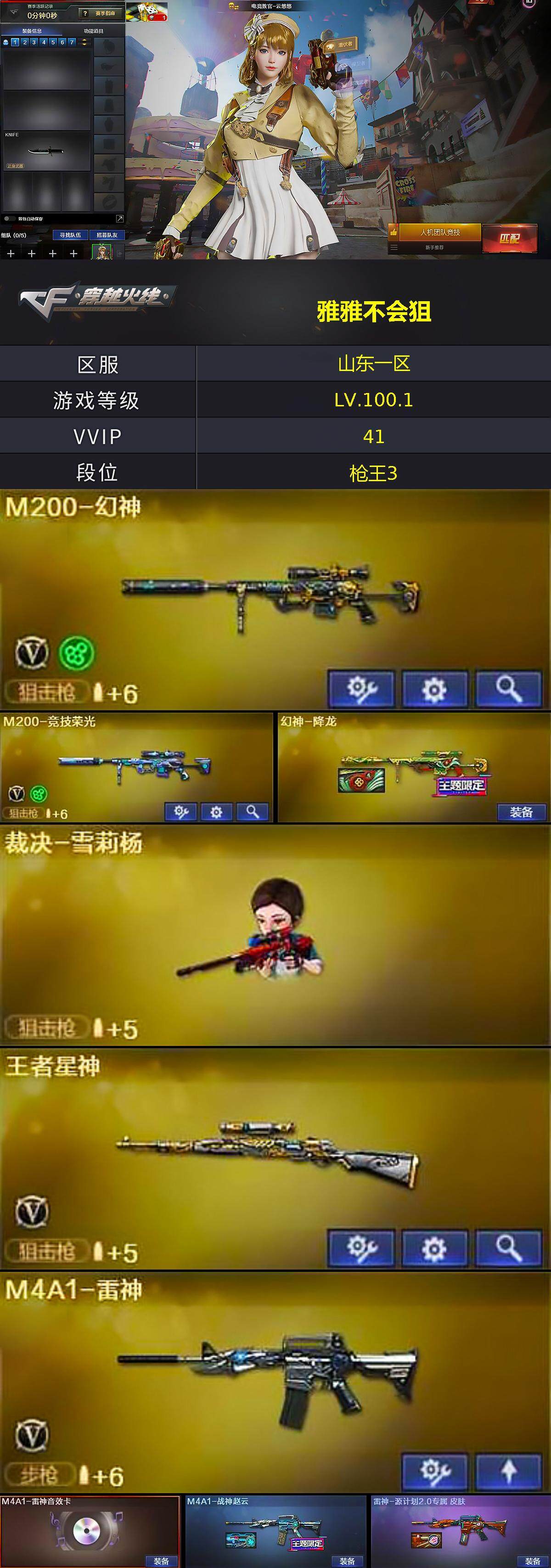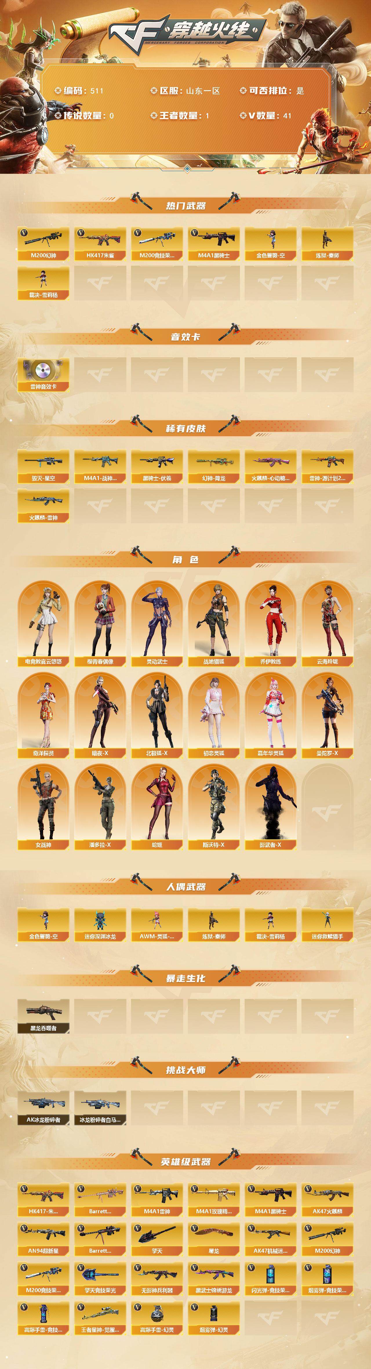 [14797629]山东一区-41v-1王者-0炫金 【热门武器】:hk417-朱雀,m200-幻神,m200-竞技荣光,m4a1-黑骑士,金色蔷薇-空,炼狱-秦师,裁决-雪莉杨 【音效卡】:m4a1-雷神音效卡 【皮肤】:幻神-降龙,m4a1-战神赵云,雷神-源计划2.0专属 皮肤,火麒麟-雷神,火麒麟-心动糖果,毁灭-星空,黑骑士-伏羲 【角色】:电竞教官-云悠悠,战地猎狐,奇洋探员,乔伊教练,云海玲珑,暗夜-x,北极狐-x,初恋灵狐,嘉年华灵狐,灵动武士,曼陀罗-x,女战神,潘多拉-x,蛇姬,斯沃特-x,樱-青春偶像,影武者-x 【人偶武器】:炼狱-秦师,裁决-雪莉杨,金色蔷薇-空,迷你救赎猎手,awm-灵狐-15周年嘉年华,迷你深渊冰龙 【暴走生化】:黑龙吞噬者2 【挑战大师】:ak47-冰龙粉碎者,冰龙粉碎者-白马银呛 【英雄级武器】:ak47-火麒麟2,m4a1-雷神,m4a1-黑骑士,an94-超新星,ak47-机械迷城,hk417-朱雀,无影-神兵利器,黑武士-锦绣游龙,m4a1-玫瑰精灵,barrett-毁灭2,m200-幻神,m200-竞技荣光,barrett-金色蔷薇2,王者星神-觉醒版,屠龙,擎天,擎天-竞技荣光,高爆手蕾-幻灵,高爆手蕾-竞技荣光5,闪光丹-竞技荣光7,盐雾蛋-幻灵,盐雾蛋-竞技荣光4 【道具】:云山科技背包,炫彩背包,女皇终结者-魔龙之吻,救世主-黑桃战神,绿色巨人,灵魂忍者,迷雾幽灵,夺命之镰,防化服3,金色流光-呛王排位2,星辰流光-呛王排位,呛王排位28赛季金色流光,呛王排位29赛季金色流光,防弹头盔4,防弹衣4,c4工具钳4,手蕾包4 【特殊呛械】:1黑骑士