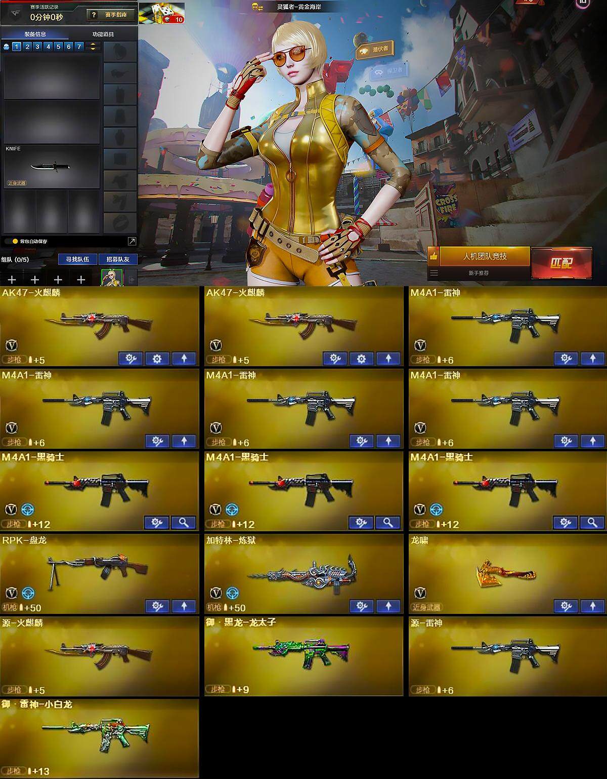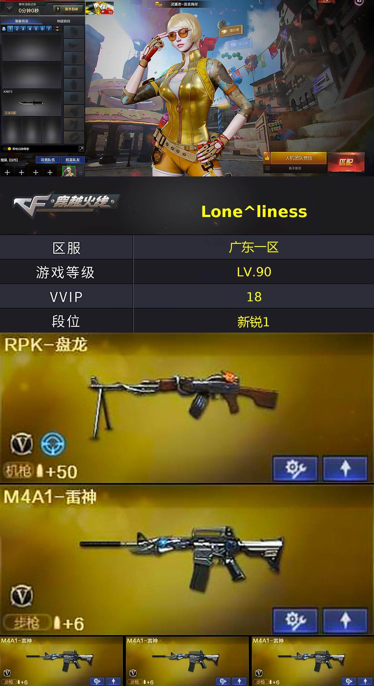 广东一区-12v-0王者-0炫金 【热门武器】:m4a1-黑骑士3,rpk-盘龙,加特林-炼狱 【皮肤】:m4a1-黑龙-361,黑骑士-暗月 【角色】:灵狐者-黄金海岸,潘多拉-x,潜龙队-x 【英雄级武器】:ak47-火麒麟2,m4a1-雷神4,m4a1-黑骑士3,rpk-盘龙,加特林-炼狱,龙啸 【道具】:夺命之镰,防化服,防弹头盔,防弹衣,c4工具钳,手蕾包 【特殊呛械】:3黑骑士,1盘龙,1炼狱