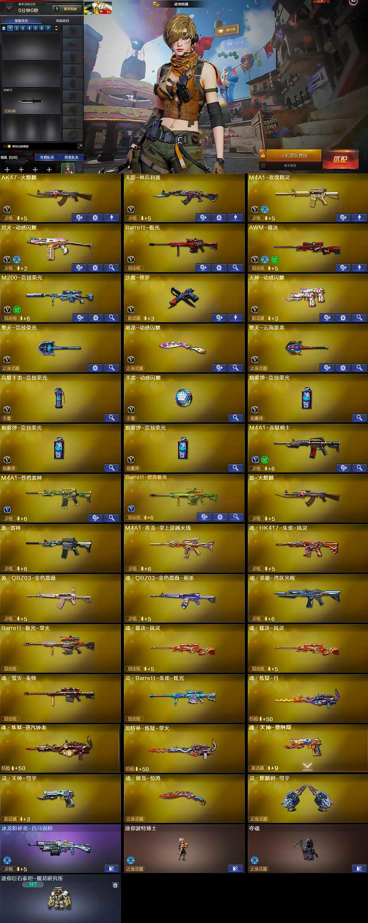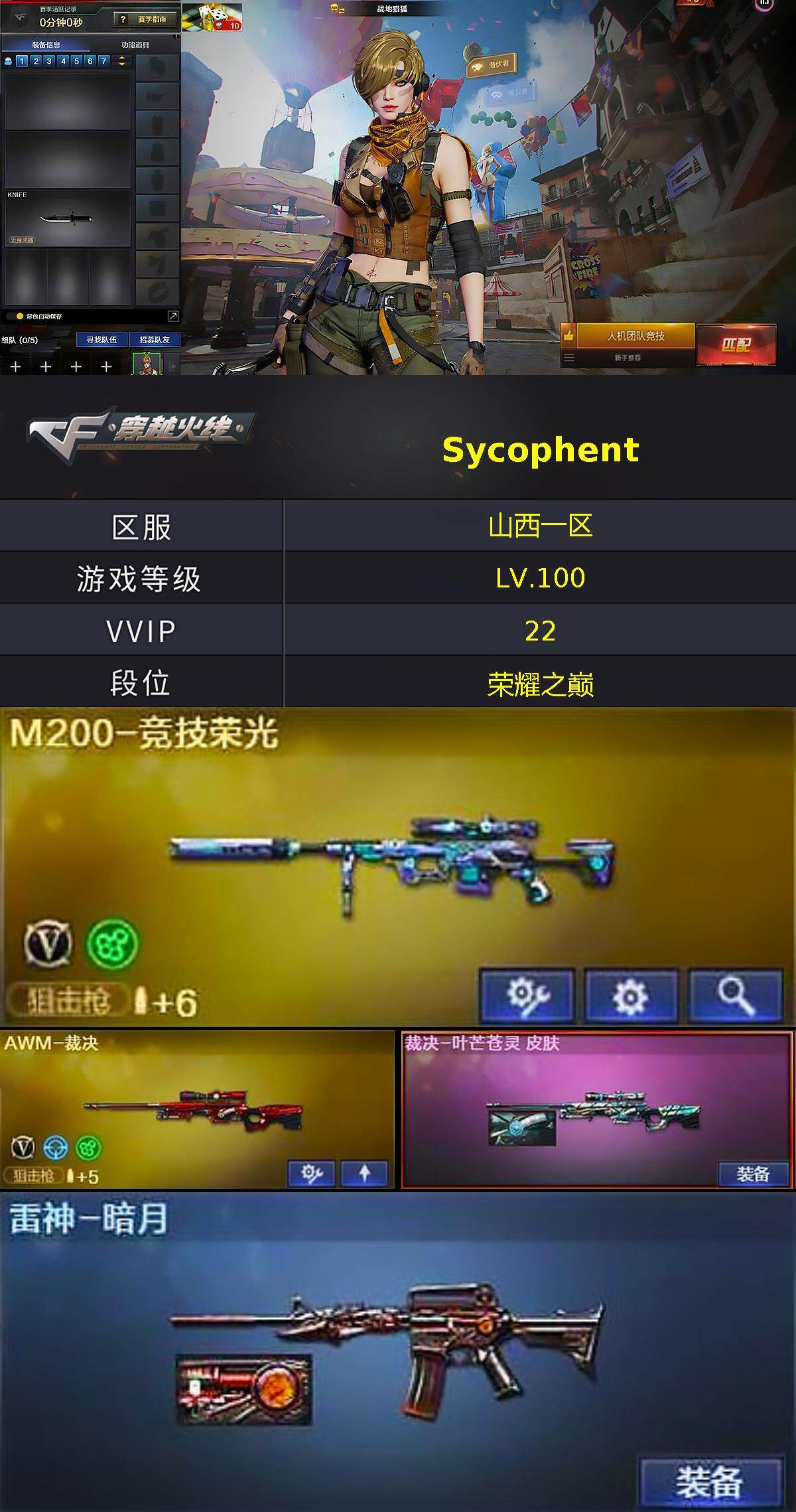 山西一区-22v-0王者-0炫金 【热门武器】:m200-竞技荣光,沙鹰-修罗 【音效卡】:barrett-碧霄极光音效卡 【皮肤】:裁决-叶芒苍灵 皮肤,雷神-暗月,火麒麟-心动糖果,黑龙-能量核心,黑武士-典韦皮肤,玫瑰精灵-蓝调梦幻 皮肤 【角色】:战地猎狐,乔伊教练,暗夜-x,初恋灵狐,风暴女,嘉年华灵狐,娟娟,兰-海滩派对,零-水下丽影,麻雀,潘多拉-x,潘多拉-甜心教官,蛇姬,斯沃