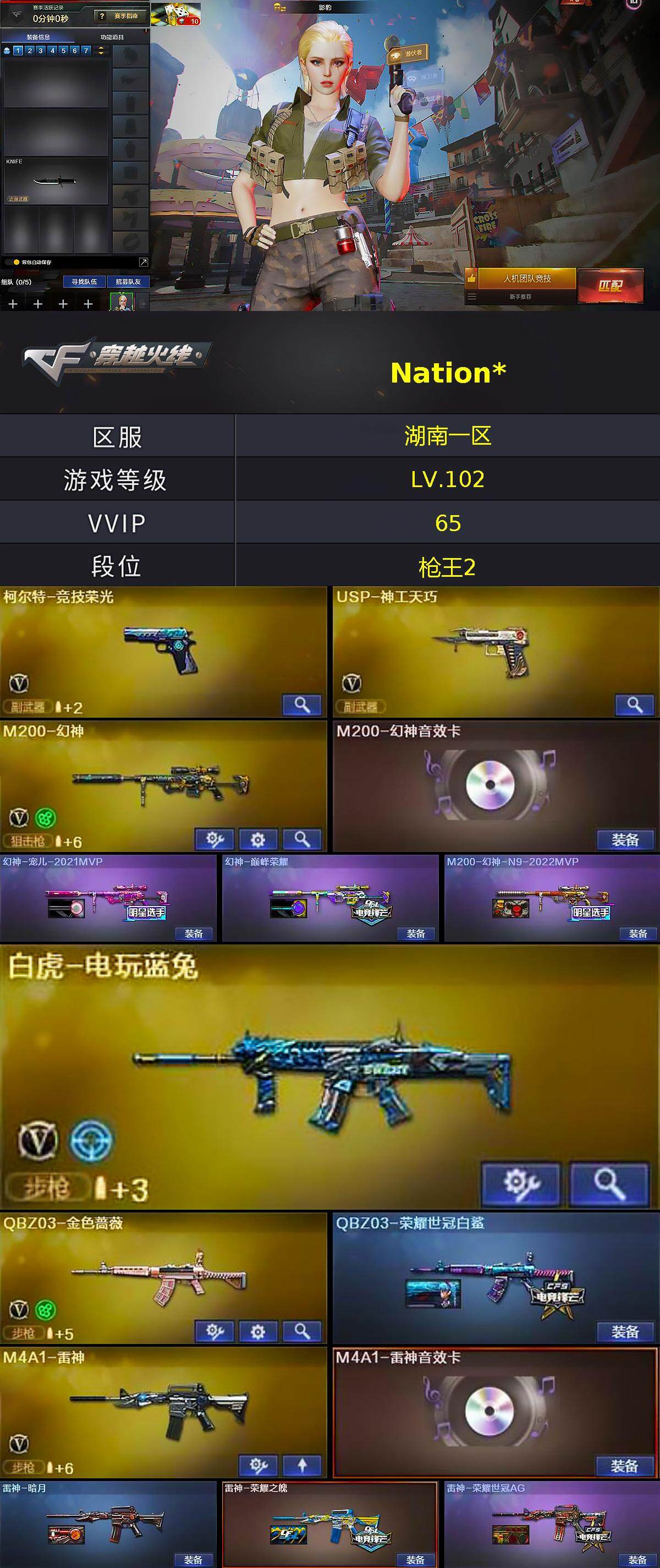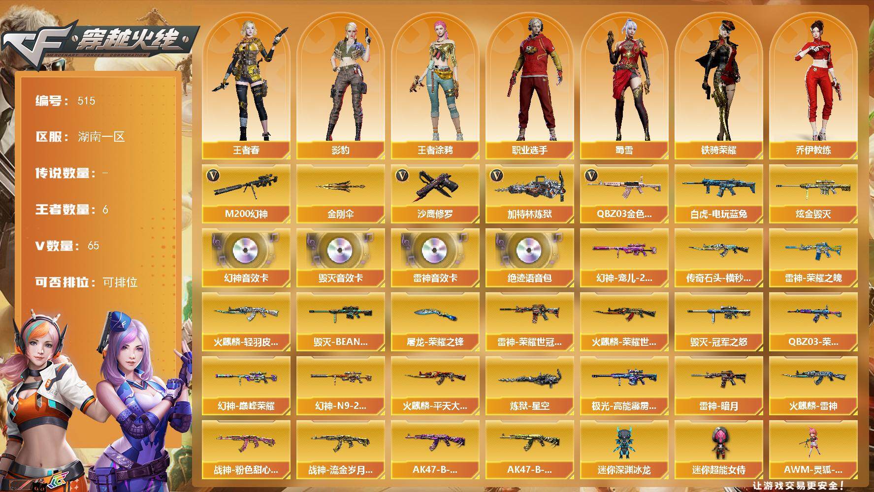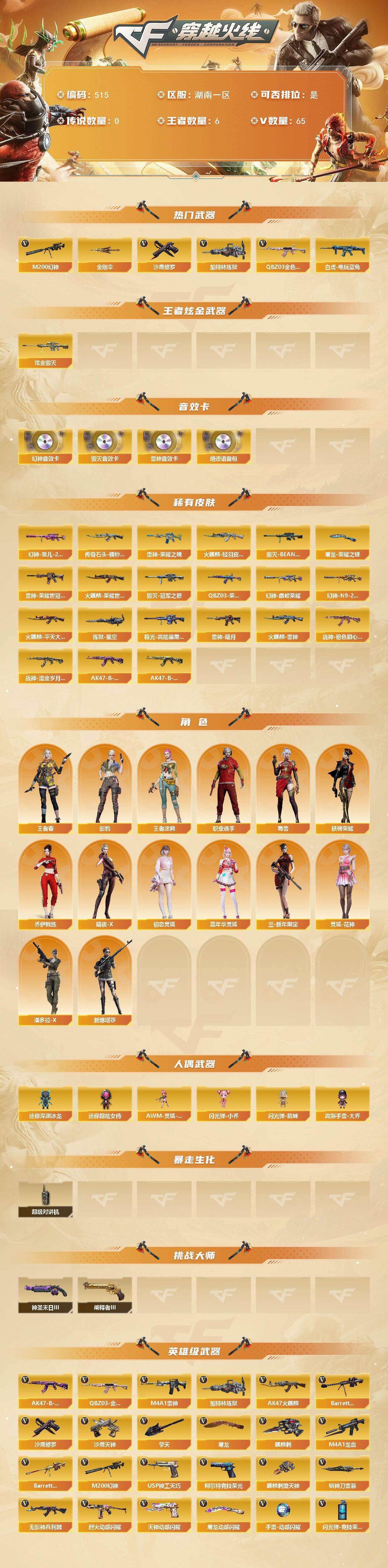 湖南一区-65v-6王者-1炫金 【热门武器】:q03-金色蔷薇,m200-幻神,白虎-电玩蓝兔,加特林-炼狱,沙鹰-修罗4,金刚伞 【王者炫金武器】:炫金毁灭 【音效卡】:m200-幻神音效卡,m4a1-雷神音效卡,barrett-毁灭音效卡,绝迹语音包 【皮肤】:幻神-宠儿-2021mvp,幻神-巅峰荣耀,m200-幻神-n9-2022mvp,q03-荣耀世冠白鲨,雷神-暗月,雷神-荣耀之魄,雷神-荣耀世冠ag,火麒麟-雷神,火麒麟-轻羽皮肤,传奇石头-横秒之巅,火麒麟-平天大圣,火麒麟-荣耀世冠ag,毁灭-冠军之怒,毁灭-bean-2020mvp,战神-粉色甜心皮肤,战神-流金岁月皮肤2,ak47-b-常胜将军-曹操,ak47-b-常胜将军-孙权,极光-高能霹雳 皮肤,炼狱-星空,屠龙-荣耀之锋2 【角色】:影豹,王者春,王者涂鸦,乔伊教练,暗夜-x,初恋灵狐,嘉年华灵狐,兰-新年限定,灵狐-花神,潘多拉-x,蜀雪,铁骑荣耀,新娜塔莎,职业选手 【人偶武器】:awm-灵狐-15周年嘉年华,迷你深渊冰龙,闪光丹-小乔,闪光丹-貂蝉,高爆手蕾-大乔,迷你超能女侍 【暴走生化】:超级对讲机 【挑战大师】:神圣爆裂者-末日iii2,阐释者iii 【英雄级武器】:ak47-火麒麟,m4a1-雷神,m4a1-龙血,无影-神兵利器,q03-金色蔷薇,烈火-动感闪耀,ak-47-猩红传说,ak47-b-战神3,王者火魄-觉醒版,黑骑士-海王,ak47-b-常胜将军,白虎-电玩蓝兔,barrett-毁灭,m200-幻神,barrett-朱雀,加特林-炼狱,沙鹰-修罗4,沙鹰-天神2,柯尔特-竞技荣光,usp-神工天巧,天神-动感闪耀,屠龙,麒麟刺-堕天神,擎天,麒麟刺,屠龙-动感闪耀,斩神刀-雷暴,王者之锋-觉醒版,王者之击-觉醒版2,高爆手蕾-雷暴,高爆手蕾-堕天神,高爆手蕾-幻灵4,高爆手蕾-竞技荣光2,手蕾-动感闪耀,闪光丹-雷暴,闪光丹-堕天神,闪光丹-幻灵5,闪光丹-竞技荣光,盐雾蛋-雷暴,盐雾蛋-堕天神,盐雾蛋-幻灵4,盐雾蛋-竞技荣光2 【道具】:全能呛王背包,炫彩背包,虎牙炫彩背包,超级背包,哔哩哔哩名片,灵魂忍者,变异宝贝,妖姬,生化弹匣,夺命之镰,防化服,金色流光-呛王排位2,星辰流光-呛王排位,呛王排位28赛季金色流光,呛王排位29赛季金色流光,电玩兔兔表情,动感闪耀表情,ep战队收纳包,ep战队名片,ep战队喷图,防弹头盔2,防弹衣,c4工具钳2,手蕾包 【特殊呛械】:1炼狱
