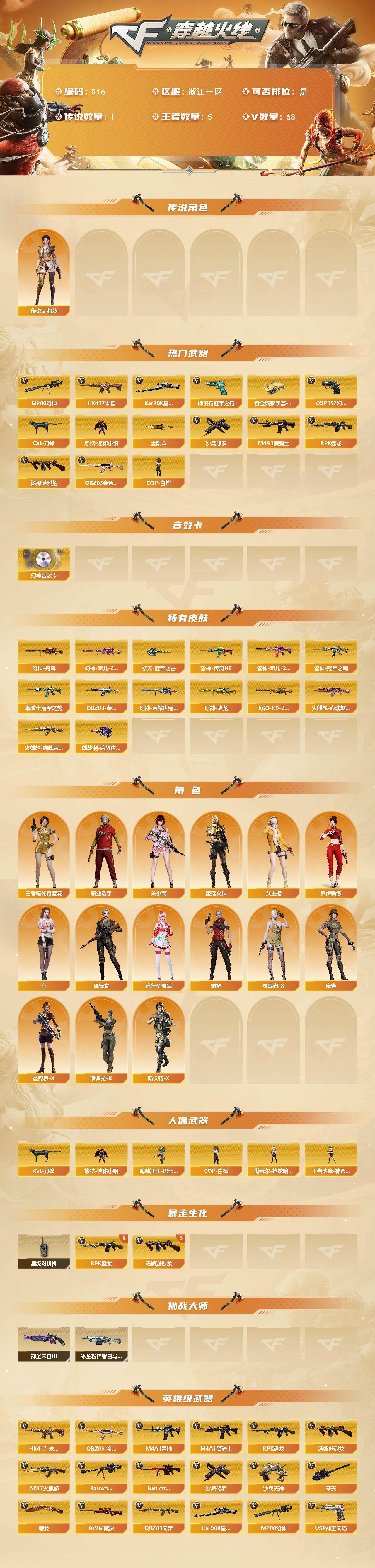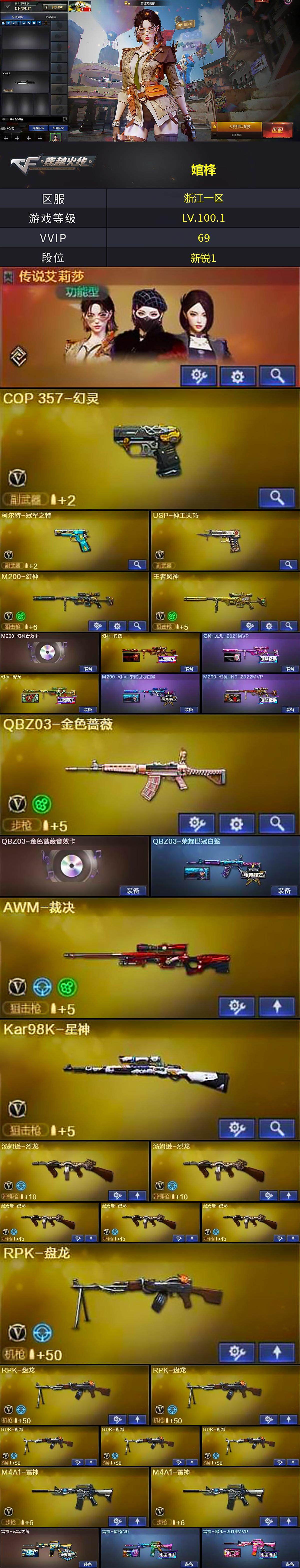 浙江一区-68v-5王者-0炫金 【传说角色】:传说艾莉莎 【热门武器】:q03-金色蔷薇,hk417-朱雀,m200-幻神,柯尔特-冠军之特,kar98k-星神,cat-刀锋,炼狱-迷你小钢,m4a1-黑骑士2,汤姆逊-烈龙5,rpk-盘龙6,cop-白鲨,cop 357-幻灵,沙鹰-修