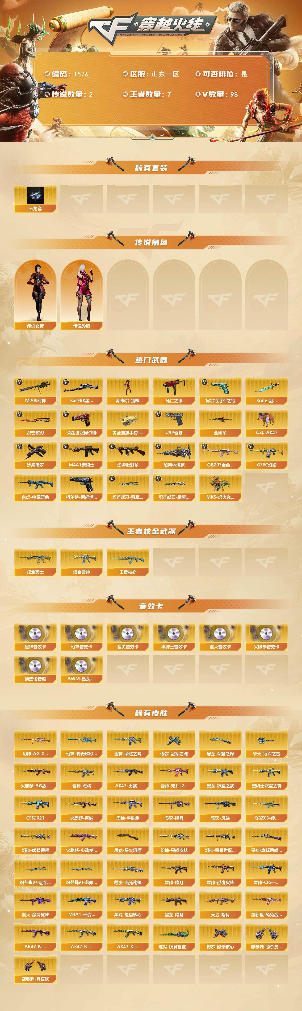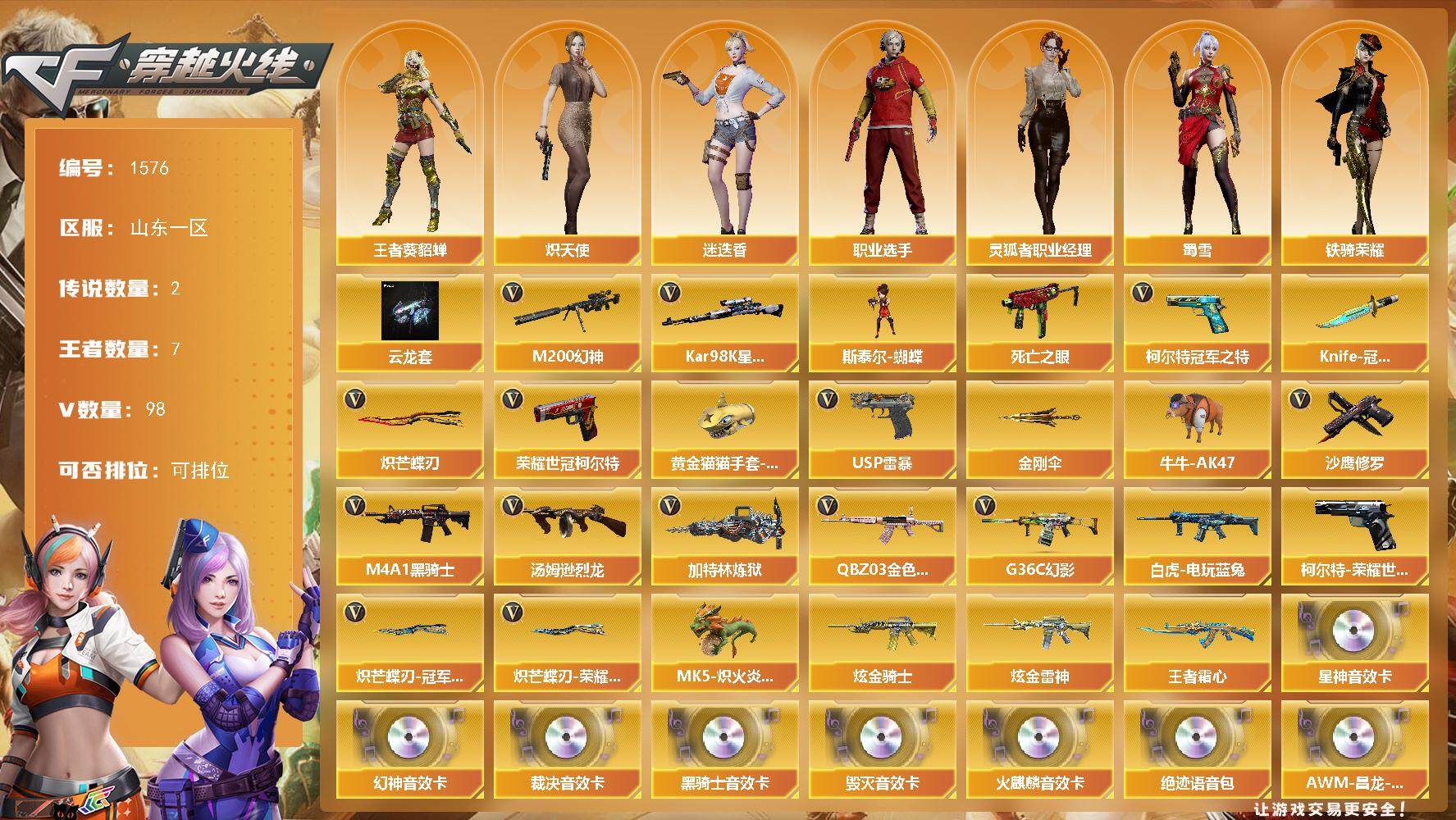 【1576】特20997北部山东一区可排位可二次【山东一区/106v/vip6/2传说】【纯白无封号/哔哩哔哩名片/四防传说女帝/传说影煞/幻神三件套/2把幻神5皮肤/星神三件套/裁决三件套/云龙套/蝴蝶刀带俩皮肤/13把手呛3把冠特手呛牌面拉满/10套雷/4烈蝴蝶/毁灭三件套/q三件套/a背包拓展】【m200-幻神2/m200-幻神音效卡/幻神-传奇欧欧,皮肤/幻神-巅峰荣耀/幻神-星耀,皮肤/幻神-荣耀世冠白鲨2023,皮肤/幻神-ag-cppl,s24冠军,皮肤】【kar98k-星神/kar98k-星神音效卡/星神-巅峰荣耀,皮肤】【awm-裁决/awm-裁决音效卡/裁决-流光秘银】【炽芒蝶刃/炽芒蝶刃-荣耀世冠白鲨2023,皮肤】【knife-冠军之刃/黄金猫猫手套-白鲨】【g36c-幻影/q03-云龙】【柯尔特-冠军之特3/荣耀世冠-柯尔特/usp-雷暴/柯尔特-荣耀世冠白鲨20232】【q03-金色蔷薇/q03-金色蔷薇音效卡/q03-传奇宠儿】【m4a1-雷神2/雷神-荣耀之魄/雷神-宠儿-2019mvp/雷神-宇航兔皮肤/雷神-烈虎皮肤/雷神-暗月3/雷神-虎将】【cop,357-云龙】【barrett-毁灭/barrett-毁灭音效卡/芭蕾特-毁灭-cfpl冠军/毁灭-风暴/毁灭-魔灵皮肤/毁灭-暗月】【ak47-火麒麟2/ak47-火麒麟音效卡/ak47-火麒麟-传奇even/火麒麟-百城/火麒麟-cfstar2/火麒麟-心动糖果】【m4a1-黑骑士/m4a1-黑骑士音效卡/黑骑士-冠军之势/黑骑士-cfs2021/黑骑士-海王】【m4a1-黑龙/黑龙-冠军之武/黑龙-能量核心】【无影-神兵利器】【ak47-黑武士/黑武士-锦绣游龙】【awm-天龙/天龙-cfstar】【m4a1-千变/m4a1-千变-孔明皮肤】【汤姆逊-烈龙4】【加特林-炼狱】【斯泰尔-蝴蝶/死亡之眼】【沙鹰-修罗2/修罗-冠军之魂/修罗-能量核心】【沙鹰-天神/天神-动感闪耀】【云龙扇】【麒麟刺/麒麟刺-萌杀皮肤】【擎天2/擎天-冠军之击】【屠龙2/屠龙-荣耀之锋/屠龙-星火燎原/屠龙-动感闪耀】【龙啸】【职业选手/王者-葵-貂蝉/迷迭香/龙儿/龙儿-小淘气/暗夜-x/炽天使/木兰/乔伊教练/修道士/兔囡囡/兰-新年限定/灵狐-花神/萌儿/麻雀/紫霞/妲己/蜀雪/娟娟/潘多拉-x/斯沃特-x/铁骑荣耀/幻影/堕天使】【白虎-电玩蓝兔/ak47-b-常胜将军/ak47-b-身先士卒/ak47-b-战士/ak47-b-战神】【ak47-黑鲨/黑鲨-电流骇客,皮肤/ak12-天启/天启-暗月】【an94-超新星】【colt1911-小故障/柯尔特-萌杀/cop,357-青龙2/新usp-呛王排位奖励5】【金刚伞/金刚伞-电玩红兔/迷你深渊冰龙2】【神圣爆裂者iii/神圣爆裂者-末日iii2/激光毁灭者iii-白马银呛2/激光毁灭者iii/冰龙粉碎者-白马银呛5】【黑龙吞噬者/轻型军用手斧-镜】【牛牛-ak47/猫猫手套/迷你裂空之翼/夺魂/mk5-炽火炎龙】【王者之魄/王者之光/王者之魂/王者之击】【闪光丹-竞技荣光2/盐雾蛋-竞技荣光2】【高爆手蕾-云龙3/闪光丹-云龙3/盐雾蛋-云龙4】【高爆手蕾-雷暴5/闪光丹-雷暴7/盐雾蛋-雷暴6】【闪光丹-雷霆王者】【高爆手蕾-幻灵/闪光丹-幻灵2/盐雾蛋-幻灵】【炫金雷神/炫金骑士】【绝迹语音包/语音特效-机器人】【透明头盔/透明护目镜/烟雾保护头盔/闪光护目镜/运动护目镜/超级对讲机/超级背包/防弹头盔7/防弹衣7/c4工具钳5/手蕾包5/防化服2】 【稀有套装】:幻神三件套,星神三件套,裁决三件套,毁灭三件套,q三件套,云龙套
