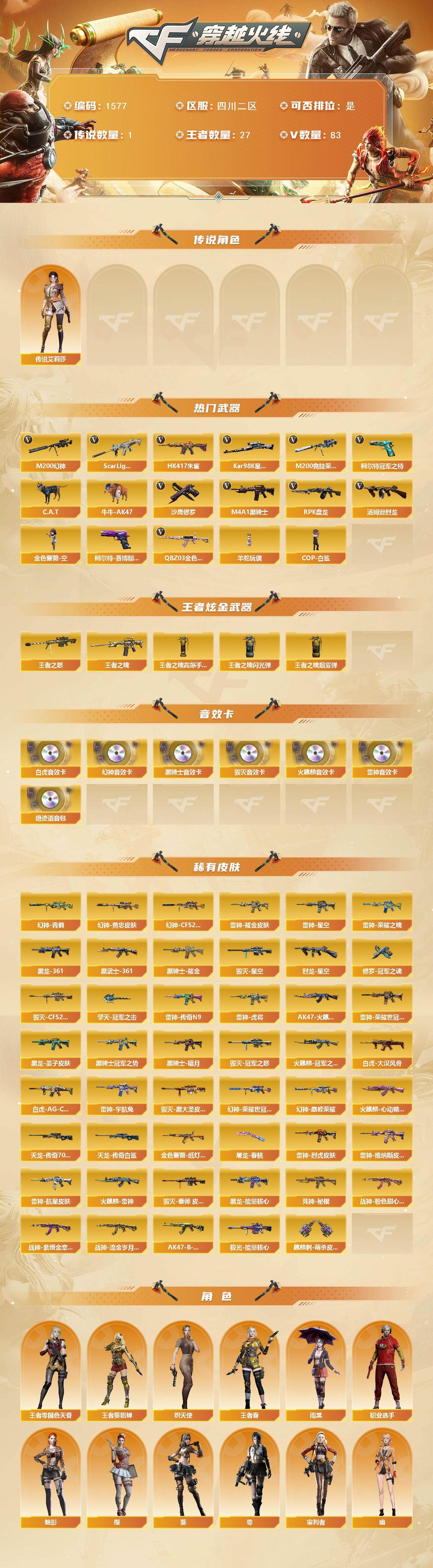 【1577】特18273西部四川二区可排位可二次【四川二区/100v/vip6/1传说】【纯白无封号/四防传说艾莉莎/幻神三件套5皮肤/6烈龙/6修罗/冠军之特/白虎三件套/12套雷/4个四防角色/毁灭三件套/雷神三件套/火麒麟三件套/黑骑士三件套/ab拓展背包】【m200-幻神/m200-幻神音效卡/幻神-巅峰荣耀/m200-幻神-荣耀世冠白鲨/幻神-cfs2022/幻神-青鹤/m200-幻神-黄忠皮肤】【m200-竞技荣光】【kar98k-星神】【柯尔特-冠军之特/柯尔特-赛博朋克】【scar,light-白虎/scar,light-白虎音效卡/白虎-ag-cfpls20冠军/白虎-大汉风骨】【q03-金色蔷薇/金色蔷薇-纸灯龙皮肤】【雷神-荣耀世冠ag/m4a1-雷神3/m4a1-雷神音效卡/雷神-荣耀之魄3/雷神-传奇n9/雷神-航星皮肤/雷神-宇航兔皮肤/雷神-烈虎皮肤/雷神-耀金皮肤/雷神-星空/雷神-维纳斯皮肤/雷神-虎将2】【barrett-毁灭4/barrett-毁灭音效卡/芭蕾特-毁灭-cfpl冠军/毁灭-冠军之怒/毁灭-cfs2020/毁灭-星空】【ak47-火麒麟3/ak47-火麒麟音效卡/火麒麟-冠军之心/ak47-火麒麟-传奇even/火麒麟-cfstar4/火麒麟-心动糖果/火麒麟-雷神】【m4a1-黑骑士3/m4a1-黑骑士音效卡/黑骑士-冠军之势/黑骑士耀金皮肤】【m4a1-黑龙-361/黑龙-墨子皮肤/黑龙-能量核心】【hk417-朱雀】【ak47-黑武士/ak47-黑武士-361】【awm-天龙2/天龙-cfstar2/awm-天龙-传奇70kg/awm-天龙-传奇白鲨】【极光-能量核心】【m4a1-死神/死神-秘银】【汤姆逊-烈龙6/烈龙-星空】【rpk-盘龙】【沙鹰-修罗6/修罗-cfstar3/修罗-冠军之魂2】【沙鹰-天神】【麒麟刺/麒麟刺-萌杀皮肤】【擎天/擎天-冠军之击】【屠龙3/屠龙-秘银/屠龙-春桃,皮肤】【龙啸】【职业选手/王者春/女主播/王者-葵-貂蝉/王者-零-国色天香/魅影/雨棠/龙儿/龙儿-小淘气/暗夜-x/审判者/炽天使/幽/女战神/木兰/奇洋探员/云海玲珑/乔伊教练/修道士/兔囡囡/灵狐-花神/萌儿/麻雀/紫霞/青霞仙子/灵狐者-黄金海岸/蜀雪/潘多拉-x/斯沃特-x/救世主-x/铁骑荣耀/新娜塔莎/幻影/堕天使/复仇者】【ak-47-猩红传说】【an94-超新星/超新星-深海萌鲨,皮肤】【colt1911-小故障/colt,1911-大黄蜂2/柯尔特-萌杀/cop,357-青龙/新usp-呛王排位奖励】【斩神刀2/金刚伞-电玩红兔/迷你深渊冰龙】【神圣爆裂者iii/神圣爆裂者-末日iii2/激光毁灭者iii/冰龙粉碎者-白马银呛】【轻型军用手斧-镜】【牛牛-ak47/猫猫手套/c.a.t/嘉年华柯基投影/cop-白鲨/海滩汪汪-芭蕾特/迷你律动酷熊/兔宝宝/夺魂/暗杀者-街机/金色蔷薇-空】【王者之心/王者之魄/王者之光/王者之决/王者之锋/王者之武】【高爆手蕾-竞技荣光/闪光丹-竞技荣光/盐雾蛋-竞技荣光】【高爆手蕾-雷霆2/闪光丹-雷霆2/盐雾蛋-雷霆2】【高爆手蕾-雷霆王者2/闪光丹-雷霆王者/盐雾蛋-雷霆王者】【高爆手蕾-堕天神/闪光丹-堕天神/盐雾蛋-堕天神2】【高爆手蕾-神工天巧6/闪光丹-神工天巧5/盐雾蛋-神工天巧4】【盐雾蛋-幻灵】【绝迹语音包/语音特效-云海游龙】【超级护目镜/透明头盔/透明护目镜/烟雾保护头盔/闪光护目镜/超级背包/炫彩背包/防弹头盔5/防弹衣8/c4工具钳6/手蕾包5/防化服3】赛季更新段位可能更新/源武器多多皮肤多多底价处理机会难得手慢无 【稀有套装】:幻神三件套,白虎三件套,毁灭三件套,火麒麟三件套,黑骑士三件套