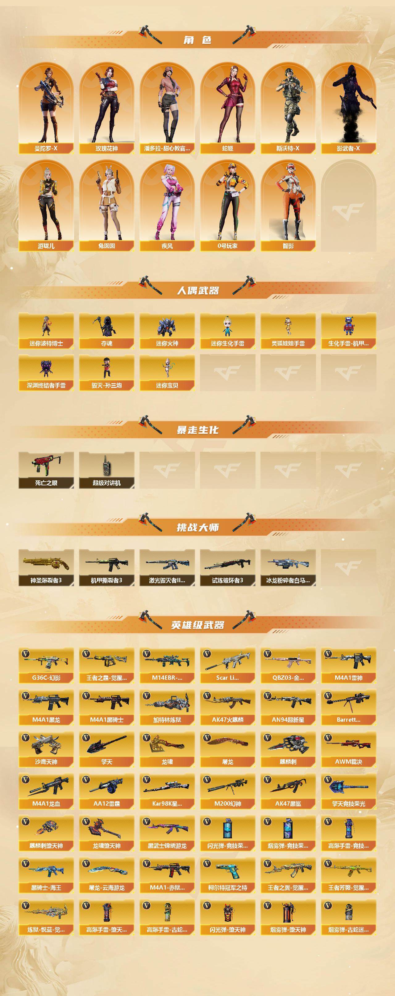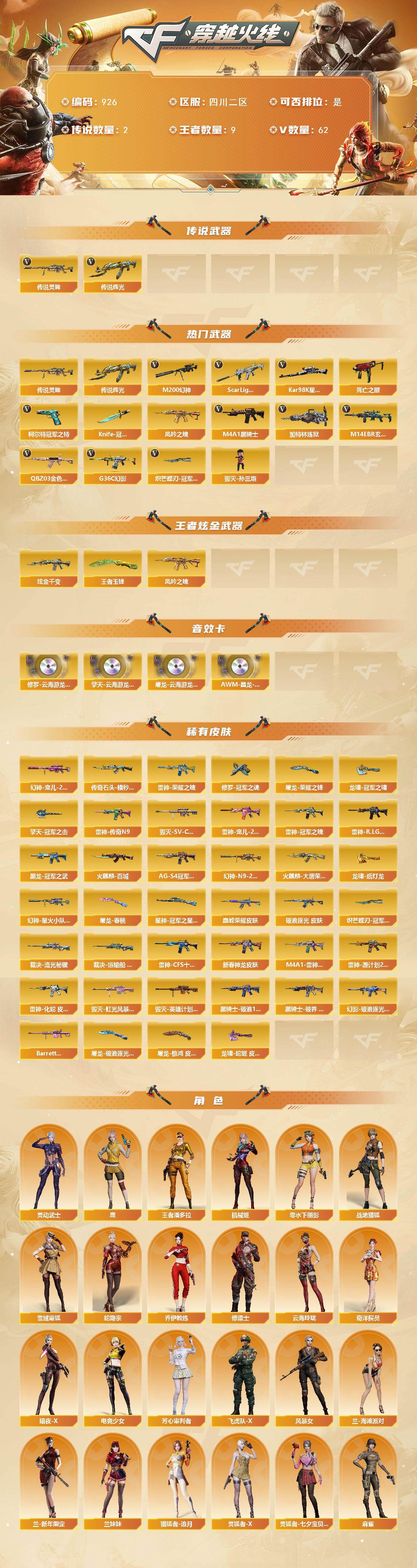 [14803532]四川二区-62v-9王者-1炫金 【传说武器】:传说辉光,传说灵眸 【热门武器】:传说辉光,传说灵眸,g36c-幻影,q03-金色蔷薇,m14ebr-玄武2,scar light-白虎2,m200-幻神,死亡之眼,凤吟之魄,柯尔特-冠军之特3,kar98k-星神,m4a1-黑骑士5,加特林-炼狱,毁灭-孙三炮,knife-冠军之刃,炽芒蝶刃-冠军炽芒皮肤 【王者炫金武器】:凤吟之魄,王者玉锋,炫金千变 【音效卡】:修罗-云海游龙音效卡,擎天-云海游龙音效卡,屠龙-云海游龙音效卡,awm-昌龙-怀旧音效卡2 【皮肤】:幻神-宠儿-2021mvp,m200-幻神-n9-2022mvp,幻神-星火小队签名臻藏版 皮肤,q03-巅峰荣耀皮肤,金色蔷薇-破浪逐光 皮肤,裁决-流光秘银,裁决-运输船 皮肤,kar98k-星神-冠军之星皮肤,雷神-荣耀之魄,雷神-冠军之魄,雷神-传奇n9,雷神-宠儿-2019mvp,雷神-r.lgd-cfpls18冠军,雷神-cfs十周年纪念版 皮肤,m4a1-雷神-新春神龙皮肤,m4a1-雷神-巅峰荣耀皮肤,雷神-源计划2.0专属 皮肤,雷神-化蛇 皮肤,传奇石头-横秒之巅,火麒麟-百城,火麒麟-大唐荣光,毁灭-sv-cfpls16冠军,毁灭-虹光风暴 皮肤,毁灭-英雄计划 皮肤,黑龙-冠军之武,黑骑士-ag-s4冠军典藏,黑骑士-破浪10年皮肤,黑骑士-破界 皮肤,幻影-破浪逐光 皮肤,barrett-金色蔷薇-蛇姬 皮肤,修罗-冠军之魂,屠龙-荣耀之锋,屠龙-春桃 皮肤,屠龙-破浪逐光 皮肤,屠龙-惊鸿 皮肤,龙啸-冠军之啸3,龙啸-纸灯龙皮肤,龙啸-蛇姬 皮肤,擎天-冠军之击,炽芒蝶刃-冠军炽芒皮肤 【角色】:鹰,机械姬,战地猎狐,王者潘多拉,雪域霜狐,蛇隐宗,奇洋探员,乔伊教练,修道士,云海玲珑,暗夜-x,电竞少女,芳心审判者,飞虎队-x,风暴女,疾风,兰-海滩派对,兰-新年限定,兰妹妹,猎狐者-追月,0号玩家,灵动武士,零-水下丽影,灵狐者-x,灵狐者-七夕宝贝,麻雀,曼陀罗-x,玫瑰花神,潘多拉-甜心教官,蛇姬,斯沃特-x,兔囡囡,影武者-x,游珑儿,智影 【人偶武器】:毁灭-孙三炮,迷你宝贝,迷你波特博士2,夺魂2,迷你火种,迷你生化手蕾,生化手蕾-机甲核心,深渊终结者手蕾,灵狐娃娃手蕾 【暴走生化】:死