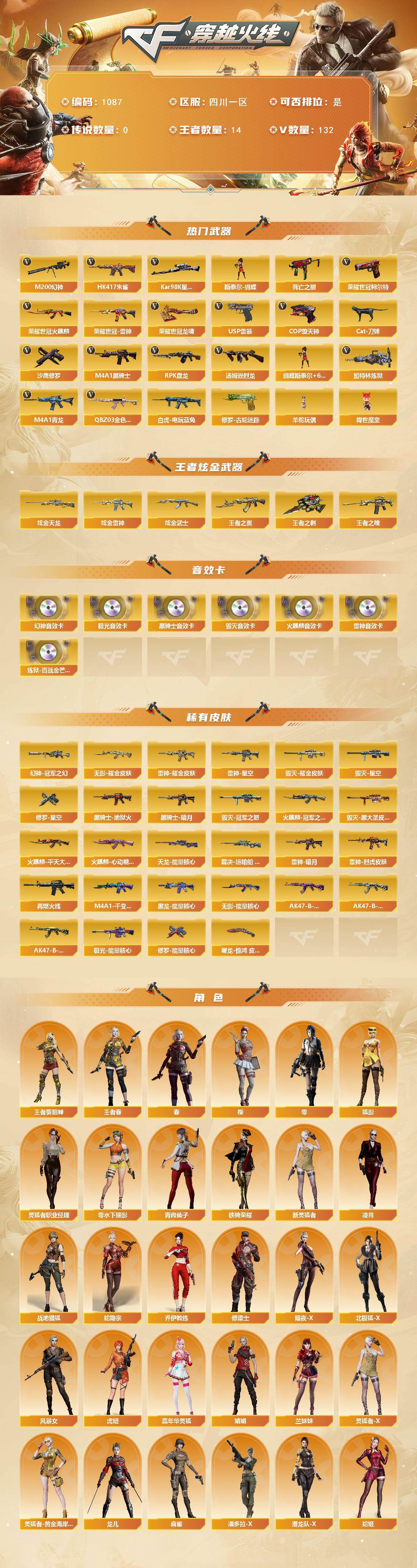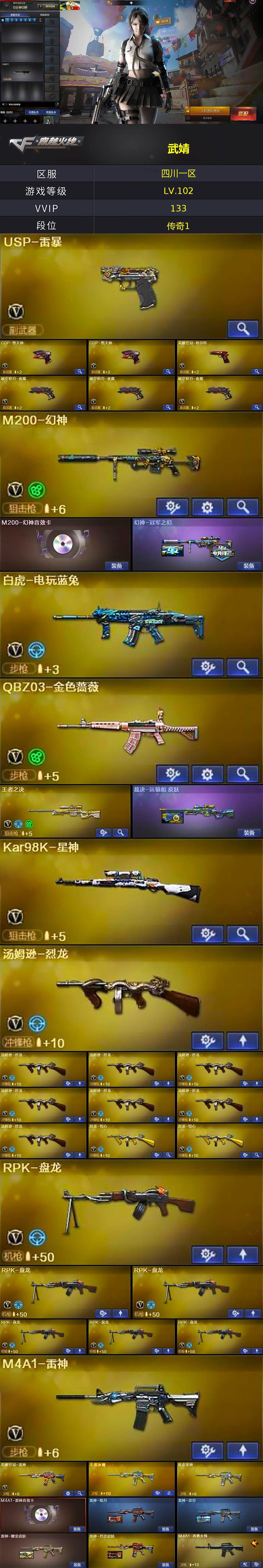 [14816963]四川一区-132v-14王者-3炫金 【热门武器】:q03-金色蔷薇,hk417-朱雀,m4a1-青龙,m200-幻神,修罗-古蛇迷踪,死亡之眼,荣耀世冠-火麒麟,荣耀世冠-雷神,白虎-电玩蓝兔,荣耀世冠-柯尔特,kar98k-星神,cat-刀锋,m4a1-黑骑士3,汤姆逊-烈龙8,rpk-盘龙6,加特林-炼狱,斯泰尔-蝴蝶,羊驼玩偶,降世魔童,usp-雷暴,cop-堕天神2,沙鹰