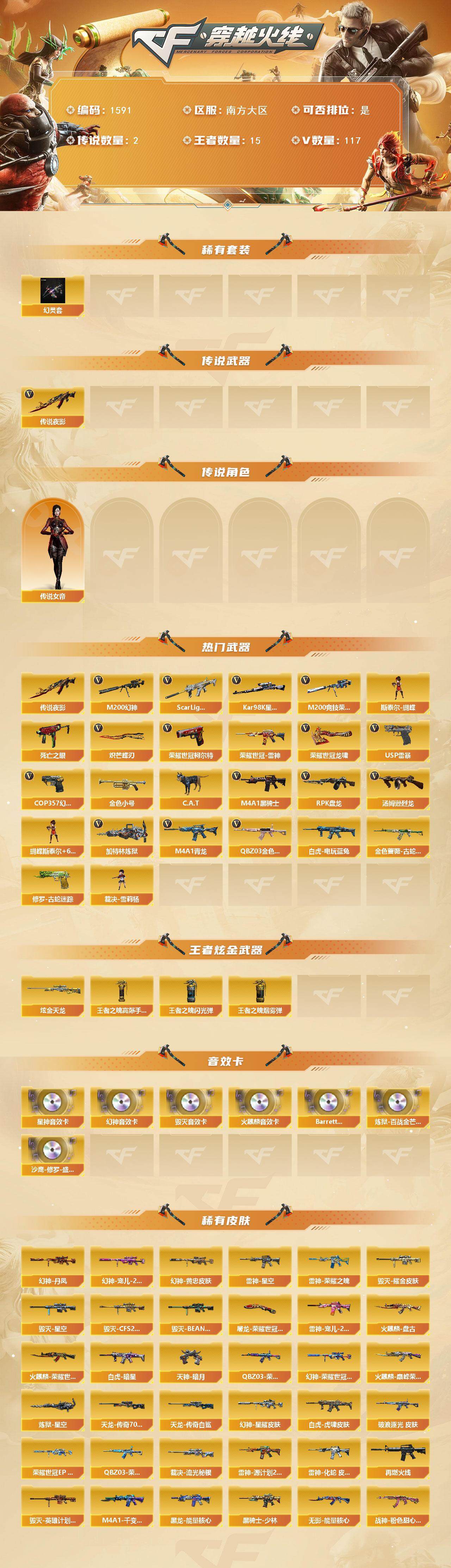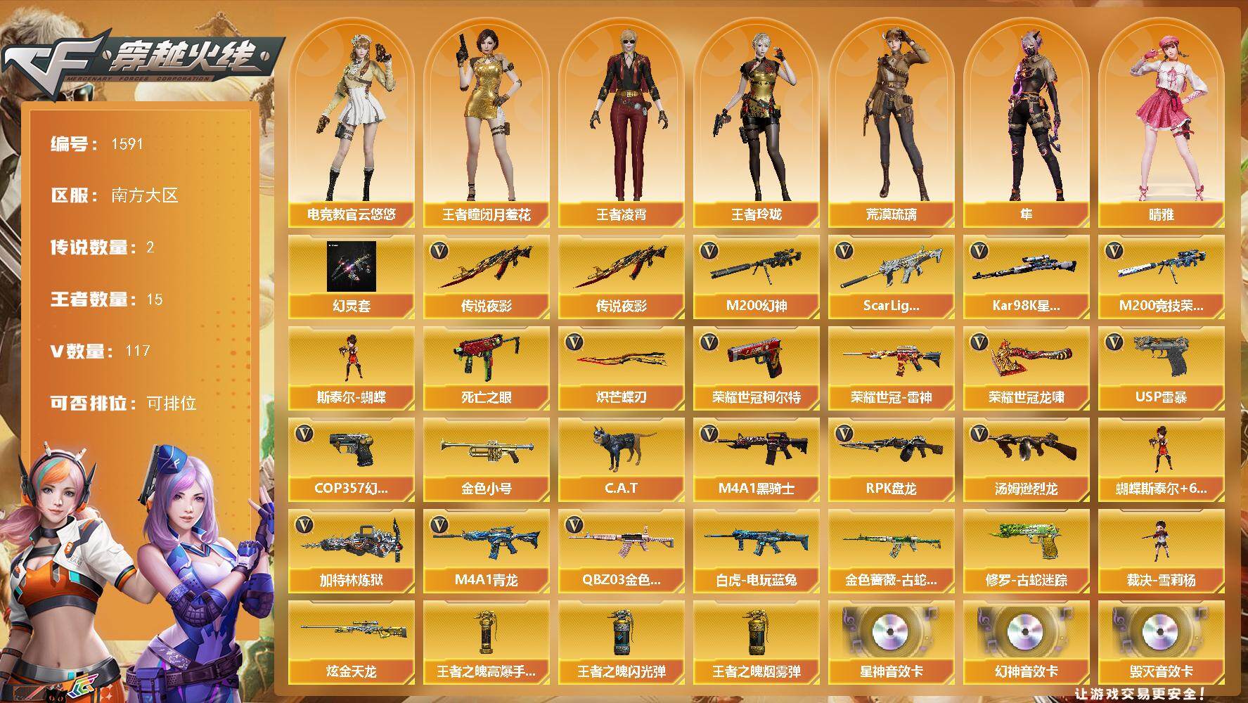 【1591】特17562南部南方大区可排位可二次【南方大区/120v/vip6/2传说】【纯白无封号/2字id/生化挑战爆破全能/四防传说女帝/四防妮妮/传说夜影/幻神三件套7皮肤/星神带卡/挑战9阶段满面板属性完美臻选金狐套装柱子金云/6烈龙蝴蝶毒刺/6盘龙/6炼狱/12把手呛拉满/10四防角色/10多套雷/ep套/竞技荣光套/幻灵套/荣耀世冠套/最新通行证奖励拉满】【m200-幻神/m200-幻神音效卡/m200-幻神-荣耀世冠ep,皮肤/幻神-电竞之星/幻神-宠儿-2021mvp/m200-幻神-荣耀世冠白鲨/幻神-丹凤/m200-幻神-黄忠皮肤/幻神-星耀,皮肤】【m200-竞技荣光】【kar98k-星神/kar98k-星神音效卡】【awm-裁决/裁决-流光秘银】【炽芒蝶刃】【柯尔特-荣耀世冠ep/荣耀世冠-柯尔特2/柯尔特-竞技荣光/usp-雷暴/usp-神工天巧】【scar,light-白虎/scar,light-白虎-暗星】【q03-金色蔷薇/q03-金色蔷薇音效卡/q03-荣耀世冠ep,皮肤/q03-荣耀世冠白鲨/金色蔷薇-破浪逐光,皮肤】【m4a1-雷神2/雷神-荣耀之魄/雷神-宠儿-2019mvp/雷神-星空】【cop,357-幻灵】【barrett-毁灭/barrett-毁灭音效卡/毁灭-bean-2020mvp/毁灭-cfs2020/毁灭-星空/毁灭耀金皮肤】【火麒麟-荣耀世冠ag/ak47-火麒麟2/ak47-火麒麟音效卡/火麒麟-巅峰荣耀/火麒麟-cfstar/火麒麟-盘古】【隼/荒漠琉璃】【m4a1-黑骑士3/黑骑士-少林/黑骑士-海王】【黑龙-能量核心】【无影-能量核心】【黑武士-锦绣游龙】【awm-天龙-传奇70kg/awm-天龙-传奇白鲨2】【barrett-极光/极光-能量核心】【m4a1-死神/m4a1-千变-孔明皮肤】【汤姆逊-烈龙7】【rpk-盘龙6】【加特林-炼狱4/炼狱-悦蓝/炼狱-星空】【斯泰尔-蝴蝶/死亡之眼3/迷你生化手蕾3】【沙鹰-天神3/天神-动感闪耀】【麒麟刺/麒麟刺-荣耀世冠白鲨】【擎天-竞技荣光2】【屠龙5/屠龙-荣耀世冠ag2/屠龙-动感闪耀/屠龙-破浪逐光,皮肤2】【荣耀世冠-龙啸/龙啸-烈火龙威】【王者沙漠玫瑰/电竞教官-云悠悠/晴雅/王者潘多拉/王者凌霄/王者玲珑/王者-瞳-闭月羞花/暗夜-x/樱-缤纷夏日/星际战将/奇洋探员/乔伊教练/修道士/兔囡囡/超能特工/零-水下丽影/青霞仙子/妲己/影武者-x/铁骑荣耀/幻影/堕天使/复仇者】【m4a1-青龙/m4a1-玫瑰精灵/m4a1-龙血/m4a1-幻灵】【白虎-电玩蓝.兔】【ak12-天启2】【an94-超新星/超新星-热带奇洋】【barrett-暗月传说】【colt1911-小故障/毛瑟-玄龙/colt,1911-大黄蜂/柯尔特-萌杀/新usp-呛王排位奖励5】【龙啸-热带奇洋/金刚伞-电玩红兔/迷你深渊冰龙】【神圣爆裂者iii/神圣爆裂者-末日iii2/机甲撕裂者iii/vepr-12-金魔/kac-圣炎切割者iii/激光毁灭者iii-白马银呛/激光毁灭者iii7/巨龙咆哮-深渊金2】【猫猫手套2/c.a.t/m4a1-小黄鸡/黄金迷你深渊冰龙/黄金迷你裂空之翼/迷你裂空之翼/夺魂4/金色小号】【王者芳薇/王者之影/王者之魄/王者之锋】【高爆手蕾-竞技荣光2/闪光丹-竞技荣光3/盐雾蛋-竞技荣光3】【高爆手蕾-神工天巧3/盐雾蛋-神工天巧4】【高爆手蕾-幻灵3/闪光丹-幻灵4/盐雾蛋-幻灵2】【手蕾-热带奇洋】【炫金天龙】【语音特效-生化/语音特效-机器人】【透明头盔/透明护目镜/烟雾保护头盔/闪光护目镜/运动护目镜/超级对讲机/超级背包/防弹头盔3/防弹衣3/c4工具钳2/手蕾包3/防化服3】赛季更新段位可能更新/源武器多多皮肤多多底价处理机会难得手慢无 【稀有套装】:幻神三件套,幻灵套