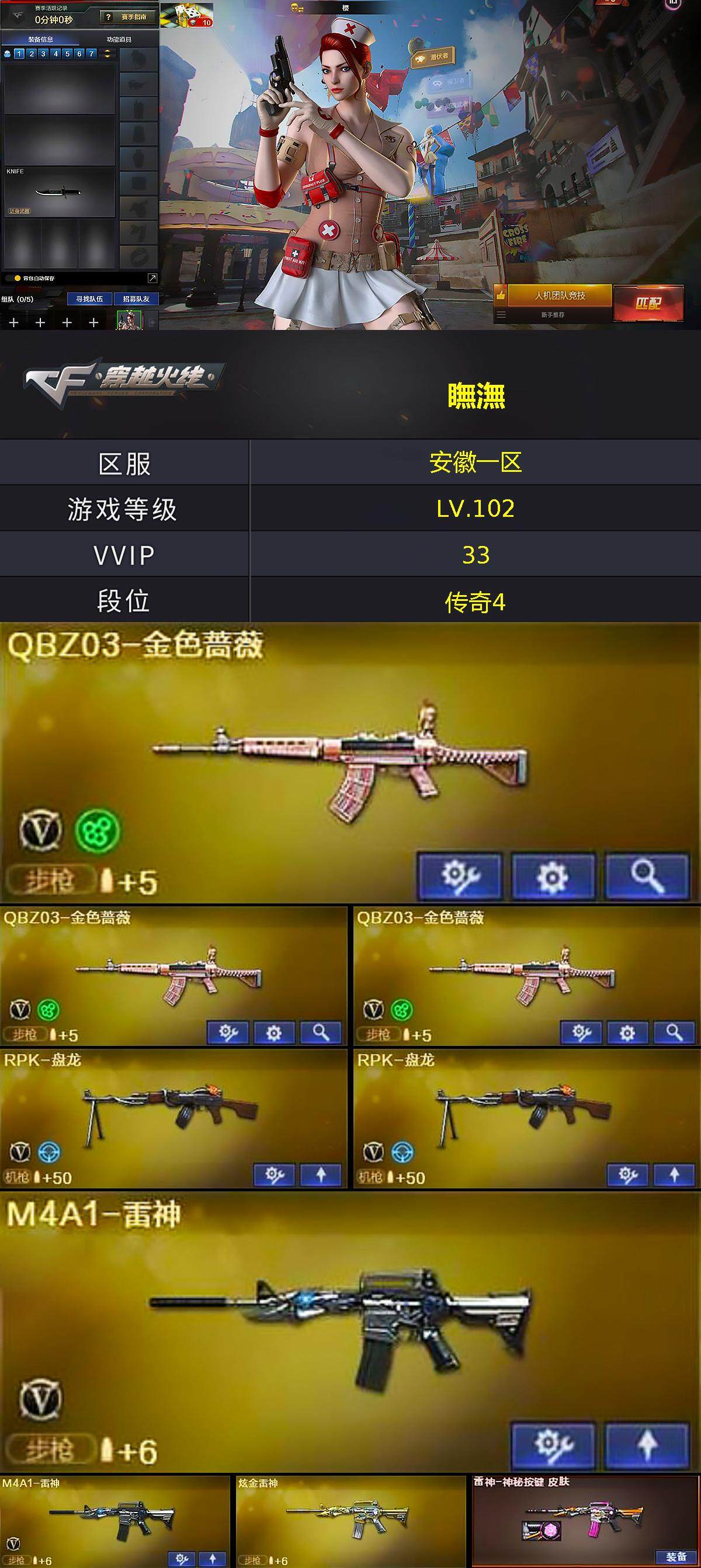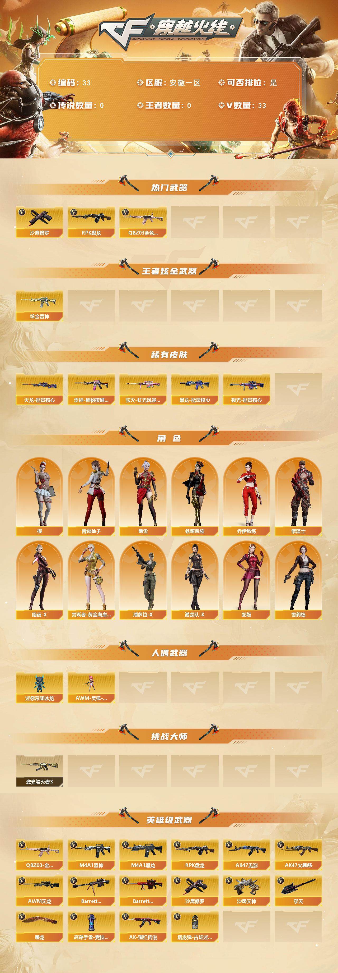 【特价出售】安徽一区-33v-0王者-1炫金 【热门武器】:q03-金色蔷薇3,rpk-盘龙2,沙鹰-修罗3 【王者炫金武器】:炫金雷神 【皮肤】:雷神-神秘按键 皮肤,毁灭-虹光风暴 皮肤,黑龙-能量核心,天龙-能量核心,极光-能量核心 【角色】:樱,乔伊教练,修道士,暗夜-x,灵狐者-黄金海岸,潘多拉-x,潜龙队-x,青霞仙子,蛇姬,蜀雪,铁骑荣耀,雪莉杨 【人偶武器】:awm-