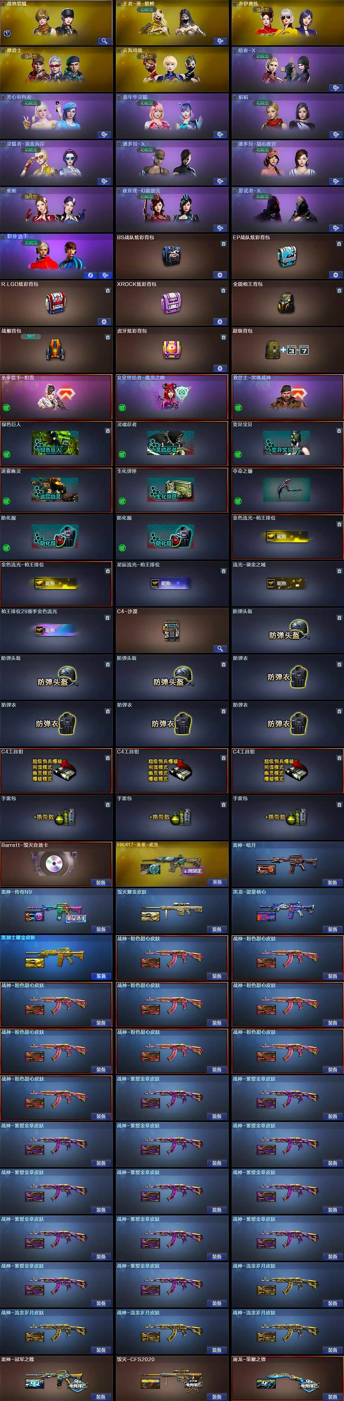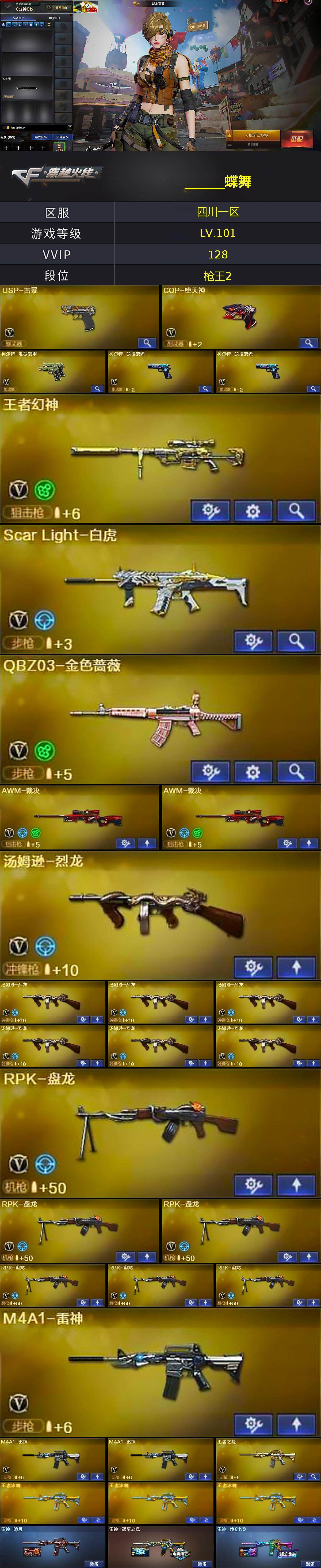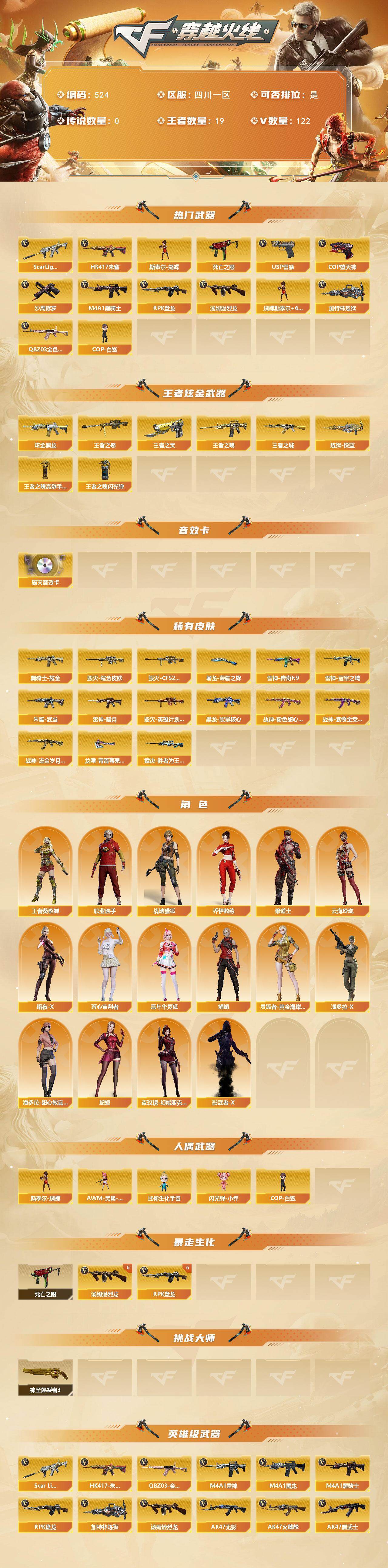 [14823116]四川一区-122v-19王者-1炫金 【热门武器】:q03-金色蔷薇,scar light-白虎,hk417-朱雀,死亡之眼4,m4a1-黑骑士3,汤姆逊-烈龙7,rpk-盘龙6,加特林-炼狱,斯泰尔-蝴蝶,cop-白鲨,usp-雷暴,cop-堕天神,沙鹰-修罗 【王者炫金武器】:王者之城,王者之魄3,王者之怒2,炼狱-悦蓝2,王者之灵2,炫金黑龙,王者之魄高爆手蕾,王者之魄闪光丹 【音效卡】:barrett-毁灭音效卡 【皮肤】:裁决-胜者为王 皮肤,雷神-暗月,雷神-冠军之魄,雷神-传奇n9,毁灭耀金皮肤,毁灭-cfs2020,毁灭-英雄计划 皮肤,黑龙-能量核心,黑骑士耀金皮肤,hk417-朱雀-武当,战神-粉色甜心皮肤9,战神-紫绶金章皮肤13,战神-流金岁月皮肤4,屠龙-荣耀之锋,龙啸-青青莓果 皮肤 【角色】:战地猎狐,王者-葵-貂蝉,乔伊教练,修道士,云海玲珑,暗夜-x,芳心审判者,嘉年华灵狐,娟娟,灵狐者-黄金海岸,潘多拉-x,潘多拉-甜心教官,蛇姬,夜玫瑰-幻能朋克,影武者-x,职业选手 【人偶武器】:cop-白鲨,斯泰尔-蝴蝶,awm-灵狐-15周年嘉年华,迷你生化手蕾,闪光丹-小乔 【暴走生化】:死亡之眼4 【挑战大师】:神圣爆裂者iii 【英雄级武器】:m4a1-千变,ak47-火麒麟,m4a1-黑龙,m4a1-雷神3,m4a1-黑骑士3,ak47-无影,ak47-黑武士,ak12-天启3,ak47-黑鲨3,m4a1-龙血2,hk417-朱雀,scar light-白虎,q03-金色蔷薇,王者之心-觉醒版,王者之魄-觉醒版,ak-47-猩红传说6,ak47-b-战神,黑骑士-海王,黑武士-cf网剧冠军2,awm-天龙,barrett-毁灭,awm-裁决2,王者幻神-觉醒版,rpk-盘龙6,加特林-炼狱,汤姆逊-烈龙7,aa-12-雷霆,沙鹰-修罗,沙鹰-天神3,usp-雷暴,cop-堕天神,柯尔特-电竞装甲,柯尔特-竞技荣光2,天神-cf网剧冠军2,屠龙,马来剑-夜魔,擎天,幻灵之锋,擎天-竞技荣光,斩神刀-雷暴,擎天-cf网剧冠军2,王者之啸-觉醒版,王者之刺-觉醒版,高爆手蕾-雷暴4,高爆手蕾-夜魔,高爆手蕾-竞技荣光8,高爆手蕾-神工天巧,闪光丹-雷暴4,闪光丹-夜魔,