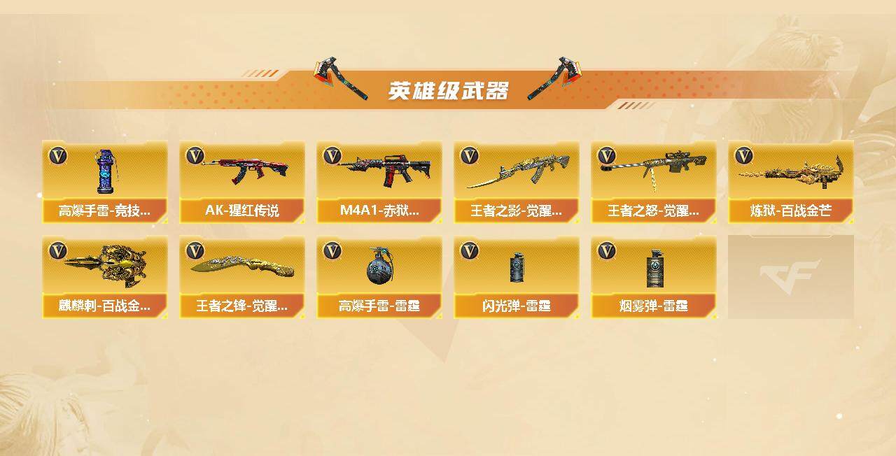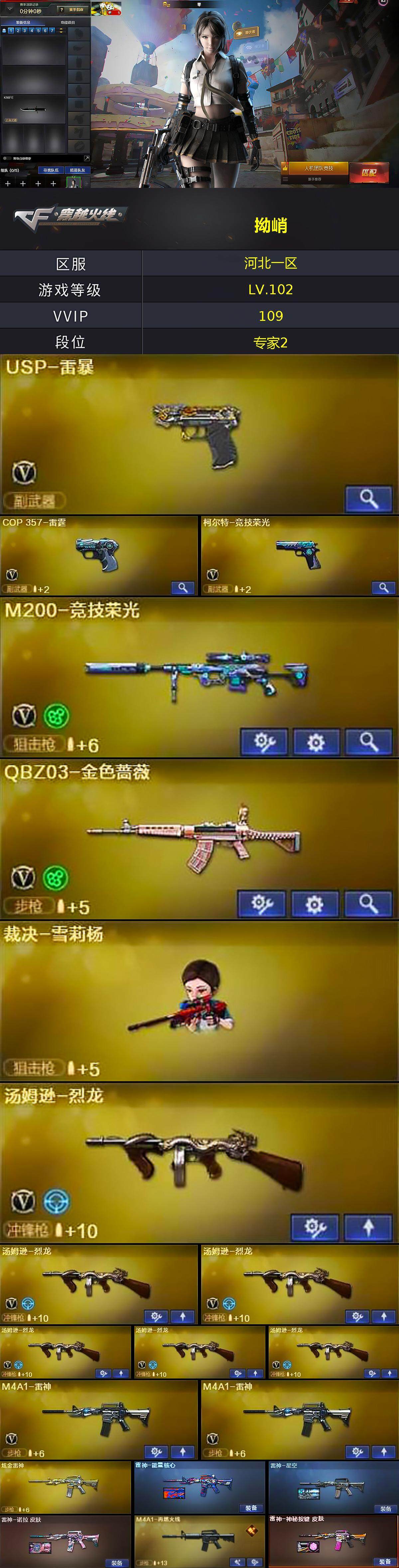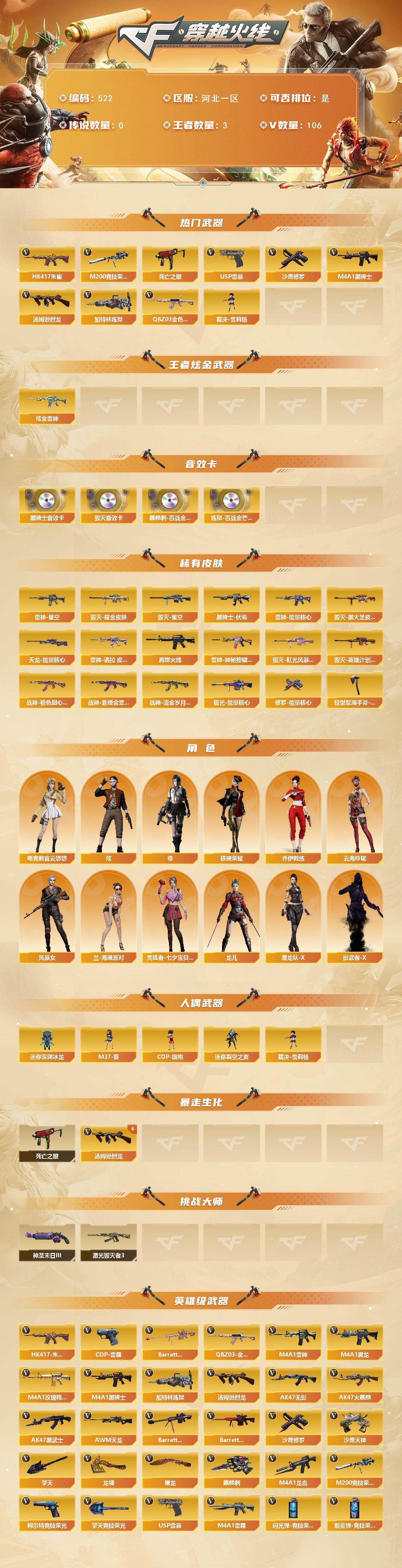 河北一区-106v-3王者-1炫金 【热门武器】:q03-金色蔷薇,hk417-朱雀,m200-竞技荣光,死亡之眼,m4a1-黑骑士,汤姆逊-烈龙6,加特林-炼狱2,裁决-雪莉杨,usp-雷暴,沙鹰-修罗3 【王者炫金武器】:炫金雷神 【音效卡】:m4a1-黑骑士音效卡,barrett-毁灭音效卡,麒麟刺-百战金芒-盛典舞曲音效卡,炼狱-百战金芒-庆典舞曲音效卡 【皮肤】:雷神-能量