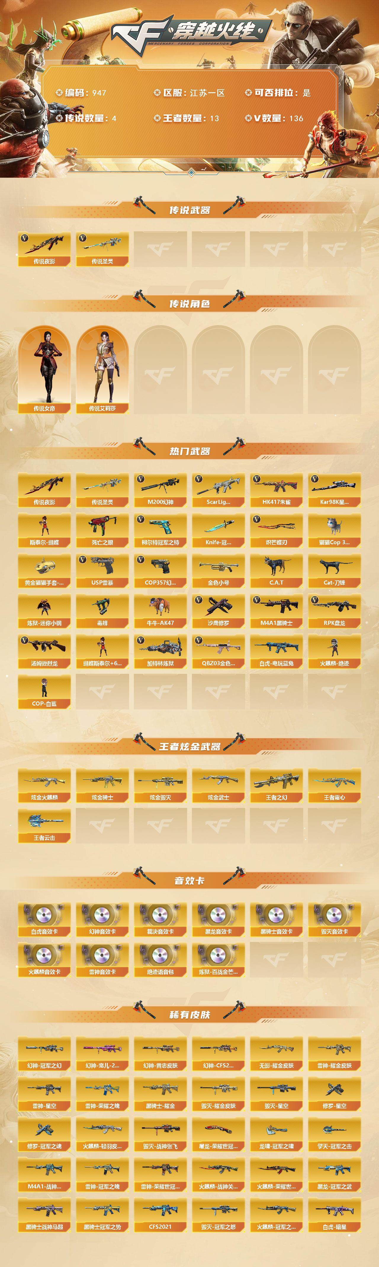 [14824093]江苏一区-136v-13王者-4炫金 【传说武器】:传说夜影,传说圣灵 【传说角色】:传说女帝,传说艾莉莎 【热门武器】:传说圣灵,传说夜影,q03-金色蔷薇2,scar light-白虎,hk417-朱雀,m200-幻神3,死亡之眼,白虎-电玩蓝兔,柯尔特-冠军之特2,kar98k-星神,金色小号,c.a.t,cat-刀锋,炼狱-迷你小钢,毒蜂,牛牛-ak47,m4a1-黑骑士3,汤姆逊-烈龙6,rpk-盘龙6,加特林-炼狱,斯泰尔-蝴蝶,猫猫cop 357,火麒麟-绝迹,cop-白鲨3,usp-雷暴,cop 357-幻灵,沙鹰-修罗3,knife-冠军之刃2,炽芒蝶刃,黄金猫猫手套-白鲨2 【王者炫金武器】:王者之幻,王者霜心,王者云击,炫金火麒麟,炫金骑士,炫金武士,炫金毁灭 【音效卡】:m200-幻神音效卡,ak47-火麒麟音效卡,m4a1-雷神音效卡,m4a1-黑龙音效卡,m4a1-黑骑士音效卡,barrett-毁灭音效卡,awm-裁决音效卡,scar light-白虎音效卡,绝迹语音包,炼狱-百战金芒-庆典舞曲音效卡 【皮肤】:m200-幻神-黄忠皮肤,幻神-冠军之幻,幻神-宠儿-2021mvp,幻神-巅峰荣耀,幻神-cfs2022,幻神-降龙,m200-幻神-荣耀世冠白鲨,m200-幻神-n9-2022mvp,scar light-白虎-暗星,白虎-ag-cfpls20冠军,q03-冠军之薇,q03-荣耀世冠白鲨,q03-金色蔷薇-拼搏,裁决-叶芒苍灵 皮肤,星神-漫游,kar98k-星神-冠军之星皮肤,雷神-暗月,雷神-荣耀之魄,雷神-星空,雷神-耀金皮肤,雷神-冠军之魄,m4a1-战神赵云,雷神-荣耀世冠ag,雷神-宇航兔皮肤,m4a1-再燃火线,雷神-神秘按键 皮肤,火麒麟-雷神,火麒麟-冠军之心,火麒麟-轻羽皮肤,火麒麟-战神关羽,火麒麟-荣耀世冠ag,火麒麟-巅峰荣耀,火麒麟-心动糖果,毁灭耀金皮肤,毁灭-星空,毁灭-冠军之怒,毁灭-战神张飞,毁灭-英雄计划 皮肤,m4a1-千变-孔明皮肤,黑龙-暗月,黑龙-冠军之武,黑骑士耀金皮肤,黑骑士-冠军之势,黑骑士-战神马超,黑骑士-cfs2021,无影耀金皮肤2,hk417-朱雀-武当,战神-粉色甜心皮肤,战神-流金岁月皮肤,ak47-b-常胜将军-曹操,a