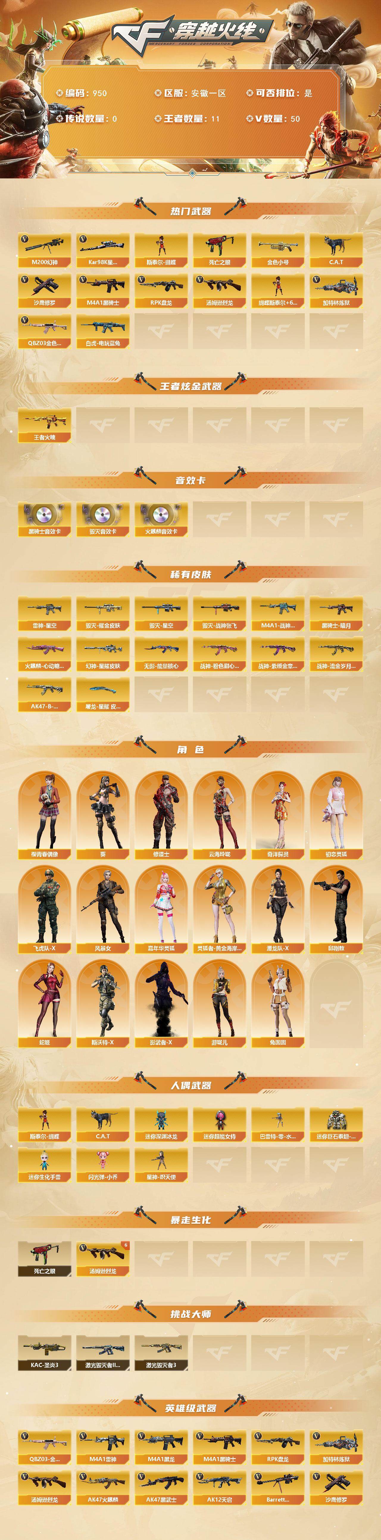 [14824567]安徽一区-50v-11王者-0炫金 【热门武器】:q03-金色蔷薇,m200-幻神,死亡之眼3,白虎-电玩蓝兔,kar98k-星神,金色小号,c.a.t,m4a1-黑骑士,汤姆逊-烈龙6,rpk-盘龙2,加特林-炼狱,斯泰尔-蝴蝶,沙鹰-修罗3 【王者炫金武器】:王者火魄 【音效卡】:ak47-火麒麟音效卡,m4a1-黑骑士音效卡,barrett-毁灭音效卡 【皮肤】:幻神-星耀 皮肤,雷神-星空,m4a1-战神赵云,火麒麟-心动糖果,毁灭耀金皮肤2,毁灭-星空,毁灭-战神张飞,黑骑士-暗月,无影-能量核心,战神-粉色甜心皮肤,战神-紫绶金章皮肤3,战神-流金岁月皮肤2,ak47-b-常胜将军-刘备,屠龙-星耀 皮肤 【角色】:葵,奇洋探员,修道士,云海玲珑,初恋灵狐,飞虎队-x,风暴女2,嘉年华灵狐,灵狐者-黄金海岸,潜龙队-x,邱刚敖,蛇姬,斯沃特-x,兔囡囡,樱-青春偶像,影武者-x,游珑儿 【人偶武器】:星神-炽天使,斯泰尔-蝴蝶,芭蕾特-零-水下丽影,c.a.t,迷你深渊冰龙,迷你生化手蕾,闪光丹-小乔,迷你超能女侍,迷你巨石泰坦-魔花研究所 【暴走生化】:死亡之眼3 【挑战大师】:激光毁灭者iii-白马银呛2,激光毁灭者iii,kac-圣炎切割者iii 【英雄级武器】:ak47-火麒麟2,m4a1-黑龙,m4a1-雷神3,m4a1-黑骑士,ak47-黑武士,ak12-天启,ak47-黑鲨,q03-金色蔷薇,白虎-电玩蓝兔,barrett-毁灭2,awm-裁决,m200-幻神,kar98k-星神,王者之怒-觉醒版,rpk-盘龙2,加特林-炼狱,汤姆逊-烈龙6,沙鹰-修罗3,沙鹰-天神,cop 357-云龙2,屠龙3,擎天,斩神刀-雷暴,雷霆王者之锋-觉醒版,高爆手蕾-雷霆,高爆手蕾-雷暴,手蕾-热带奇洋,高爆手蕾-古蛇迷踪,闪光丹-雷霆,闪光丹-雷暴,闪光丹-竞技荣光,闪光丹-云龙,闪光丹-雷霆王者-觉醒版3,盐雾蛋-雷霆,盐雾蛋-雷暴,盐雾蛋-雷霆王者-觉醒版 【道具】:cfs限定背包,亚洲杯纪念炫彩背包,奇洋探员-海龟背包,战舰背包,炫彩背包,热带奇洋炫彩背包,超级背包,女皇终结者-魔龙之吻,救世主-黑桃战神,绿色巨人,灵魂忍者2,变异宝贝,迷雾幽灵2,生化弹匣,夺命之镰,防化服2,金色流光-呛王排