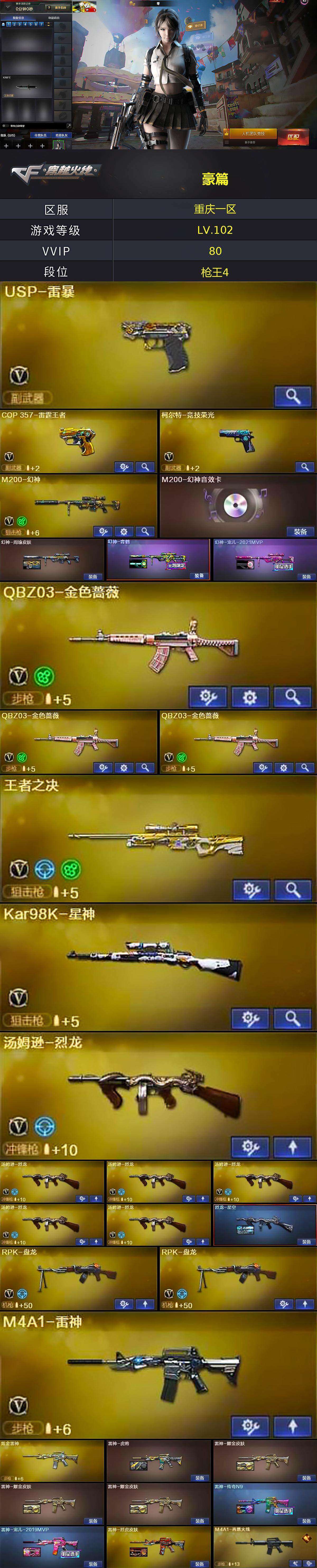 重庆一区-80v-9王者-3炫金 【热门武器】:q03-金色蔷薇3,m200-幻神,kar98k-星神,m4a1-黑骑士,汤姆逊-烈龙6,rpk-盘龙2,加特林-炼狱,斯泰尔-蝴蝶,usp-雷暴,沙鹰-修罗6 【王者炫金武器】:炫金雷神,炫金毁灭,炫金天龙 【音效卡】:m200-幻神音效卡,ak47-火麒麟音效卡,m4a1-黑骑士音效卡,barrett-毁灭音效卡,barrett-