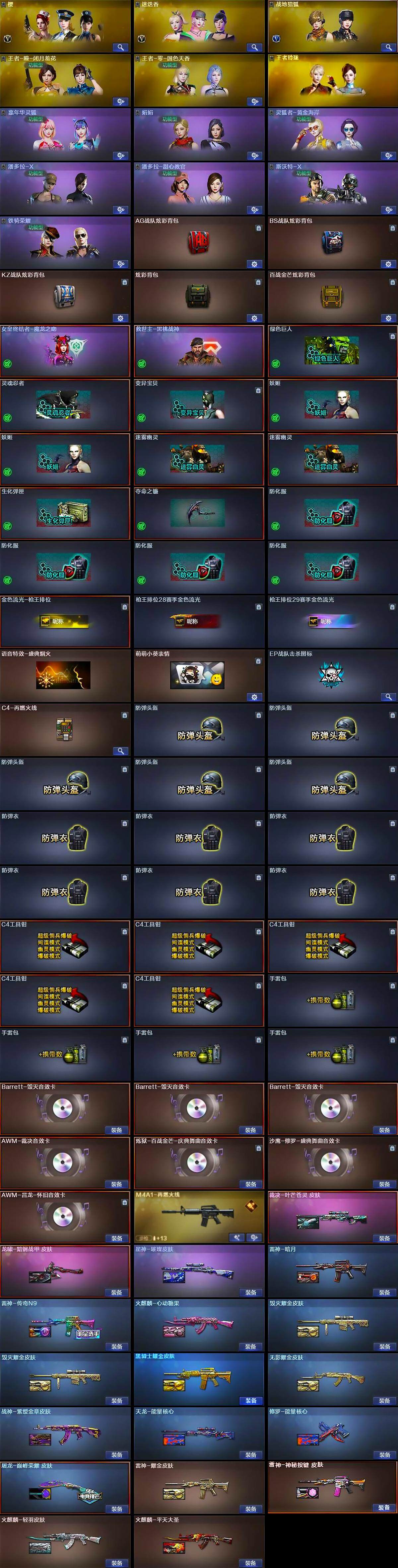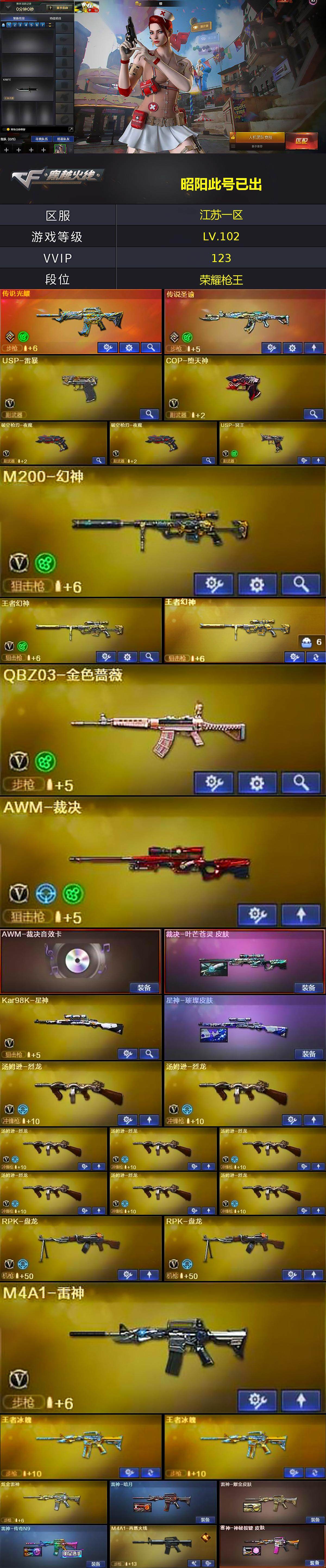 江苏一区-120v-15王者-6炫金 【传说武器】:传说光耀,传说圣谕 【热门武器】:传说光耀,传说圣谕,王者幻神,q03-金色蔷薇,hk417-朱雀,m4a1-青龙,m200-幻神,死亡之眼3,kar98k-星神,m4a1-黑骑士,汤姆逊-烈龙8,rpk-盘龙2,加特林-炼狱5,斯泰尔-蝴蝶,usp-雷暴,cop-堕天神,沙鹰-修罗4 【王者炫金武器】:王者冰魄2,王者之鲨,王者之影,王者幻神,王者之力,炫金骑士4,炫金雷神,炫金修罗 【音效卡】:barrett-毁灭音效卡3,awm-裁决音效卡,炼狱-百战金芒-庆典舞曲音效卡,沙鹰-修罗-盛典舞曲音效卡,awm-昌龙-怀旧音效卡 【皮肤】:裁决-叶芒苍灵 皮肤,星神-璀璨皮肤,雷神-暗月,雷神-耀金皮肤,雷神-传奇n9,m4a1-再燃火线,雷神-神秘按键 皮肤,火麒麟-轻羽皮肤,火麒麟-平天大圣,火麒麟-心动糖果,毁灭耀金皮肤2,毁灭-英雄计划 皮肤,黑骑士耀金皮肤,无影耀金皮肤,战神-紫绶金章皮肤,天龙-能量核心,修罗-能量核心,屠龙-巅峰荣耀 皮肤,龙啸-黯钢战甲 皮肤,轻型军用手斧-再燃火线 【角色】:樱,迷迭香,战地猎狐,王者-瞳-闭月羞花,王者-零-国色天香,王者春,王者玲珑,嘉年华灵狐,娟娟,兰-新年限定,灵狐者-黄金海岸,潘多拉-x,潘多拉-甜心教官,斯沃特-x,铁骑荣耀 【人偶武器】:火麒麟-灵狐,斯泰尔-蝴蝶,街机小灰机,awm-灵狐-15周年嘉年华,cop-旗袍,迷你深渊冰龙,迷你生化手蕾,生化手蕾-机甲核心 【暴走生化】:死亡之眼3,超级对讲机 【挑战大师】:冰龙粉碎者-白马银呛,激光毁灭者iii-白马银呛 【英雄级武器】:m4a1-千变2,ak47-火麒麟4,m4a1-黑龙,m4a1-雷神,m4a1-黑骑士,ak47-无影2,ak47-黑武士3,ak12-天启,an94-超新星,m4a1-龙血,ak47-雷暴,m4a1-青龙,hk417-朱雀,m4a1-夜魔,无影-神兵利器,q03-金色蔷薇,王者之势-觉醒版,ak47-b-战神,王者炎心-觉醒版,黑骑士-海王,王者玄武-觉醒版,黑武士-cf网剧冠军2,awm-天龙,barrett-毁灭,barrett-极光,awm-裁决,m200-幻神,kar98k-星神,王者幻神-觉醒版,rpk-盘龙2,加特林-炼狱5,炼狱-百战金芒,汤姆逊-烈龙8,沙鹰-修罗4,沙鹰-天神,usp-雷暴,cop-堕天神,破空呛刃-夜魔2,usp-冥王,天神-cf网剧冠军2,屠龙4,龙啸,马来剑-夜魔,擎天,麒麟刺,斩神刀-雷暴,擎天-cf网剧冠军2,麒麟刺-百战金芒,王者之啸-觉醒版,高爆手蕾-雷暴5,高爆手蕾-夜魔6,闪光丹-雷暴5,闪光丹-夜魔6,盐雾蛋-雷暴5,盐雾蛋-夜魔6,盐雾蛋-荣耀世冠ep,m4a1-赤狱骑士,m4a1-苍鸣雷神,barrett-碧霄极光2 【道具】:ag战队炫彩背包,bs战队炫彩背包,kz战队炫彩背包,炫彩背包,百战金芒炫彩背包,女皇终结者-魔龙之吻,救世主-黑桃战神,绿色巨人,灵魂忍者,变异宝贝,妖姬2,迷雾幽灵2,生化弹匣,夺命之镰,防化服4,金色流光-呛王排位,呛王排位28赛季金色流光,呛王排位29赛季金色流光,语音特效-盛典烟火,萌萌小葵表情,ep战队击杀图标,c4-再燃火线,防弹头盔5,防弹衣6,c4工具钳5,手蕾包4 【特殊呛械】:蝴蝶斯泰尔6烈龙,1黑骑士,6烈龙,2盘龙,5炼狱,1蝴蝶斯泰尔