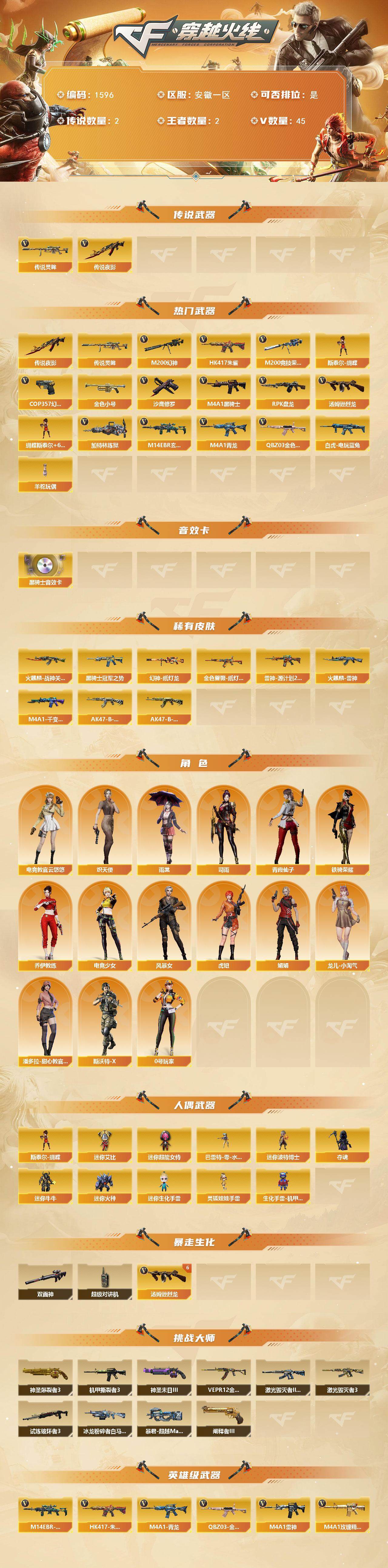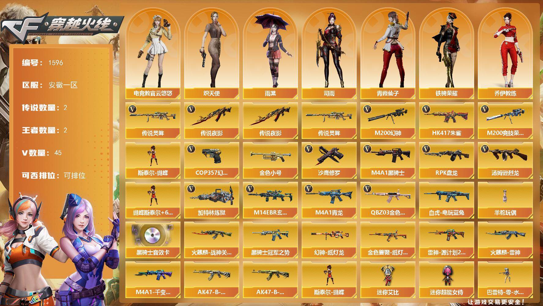 【1596】贝35637可排位-可二次【安徽一区/48v/vip1/2传说】【纯白无封号/送3w点券/生化爆破挑战全能/传说夜影/传说灵眸/6烈龙蝴蝶/甄选次元套擎天柱/幻神带皮/竞技荣光套/5机呛/四防角色/ab包拓展】【m200-幻神/幻神-纸灯龙皮肤】【m200-竞技荣光】【王者星神/王者白虎】【柯尔特-竞技荣光】【q03-金色蔷薇/金色蔷薇-纸灯龙皮肤】【m4a1-雷神】【cop 357-幻灵】【ak47-火麒麟/火麒麟-cfstar/火麒麟-战神关羽/火麒麟-雷神】【m4a1-黑骑士/m4a1-黑骑士音效卡/黑骑士-冠军之势/黑骑士-海王】【hk417-朱雀】【无影-神兵利器】【m4a1-千变-孔明皮肤】【汤姆逊-烈龙6】【rpk-盘龙4】【加特林-炼狱】【斯泰尔-蝴蝶/迷你生化手蕾2】【沙鹰-修罗/修罗-cfstar】【天神-动感闪耀】【擎天-竞技荣光】【屠龙-动感闪耀】【电竞教官-云悠悠/雨棠/龙儿-小淘气/司雨/炽天使/木兰/乔伊教练/超能特工/青霞仙子/娟娟/斯沃特-x/铁骑荣耀/堕天使/复仇者】【m14ebr-玄武/m4a1-青龙/m4a1-玫瑰精灵】【白虎-电玩蓝兔/scar light-像素/ak-47-猩红传说】【barrett-朱雀】【colt 1911-大黄蜂/柯尔特-萌杀2/新usp-呛王排位奖励2】【金刚伞-电玩红兔】【神圣爆裂者iii/神圣爆裂者-末日iii/机甲撕裂者iii/vepr-12-金魔/激光毁灭者iii-白马银呛/激光毁灭者iii/冰龙粉碎者-白马银呛/巨龙咆哮-深渊金/阐释者iii】【芭蕾特-零-水下丽影/夺魂3/金色小号】【高爆手蕾-竞技荣光2/闪光丹-竞技荣光2/盐雾蛋-竞技荣光2】【盐雾蛋-幻灵】【透明头盔/烟雾保护头盔/闪光护目镜/超级对讲机/超级背包/炫彩背包/防弹头盔4/防弹衣5/c4工具钳4/手蕾包4/防化服2】截图展示段位不代表实际段位,如赛季更新等不/拒因素发生变化、时限道具不保证所剩时间