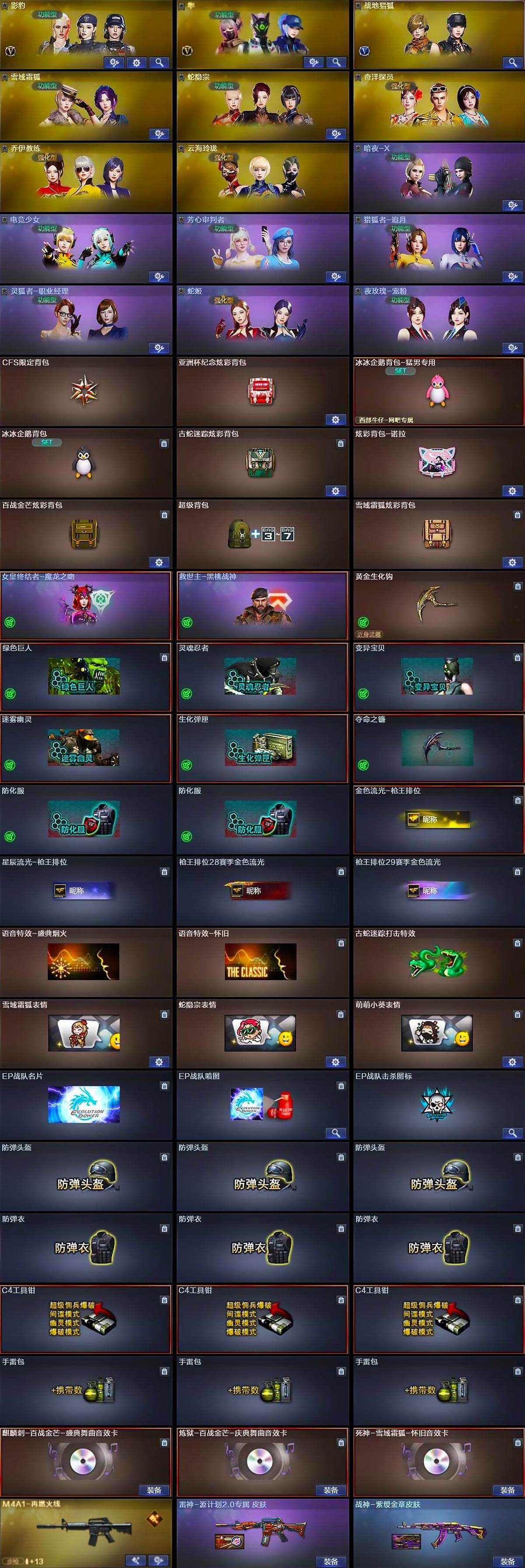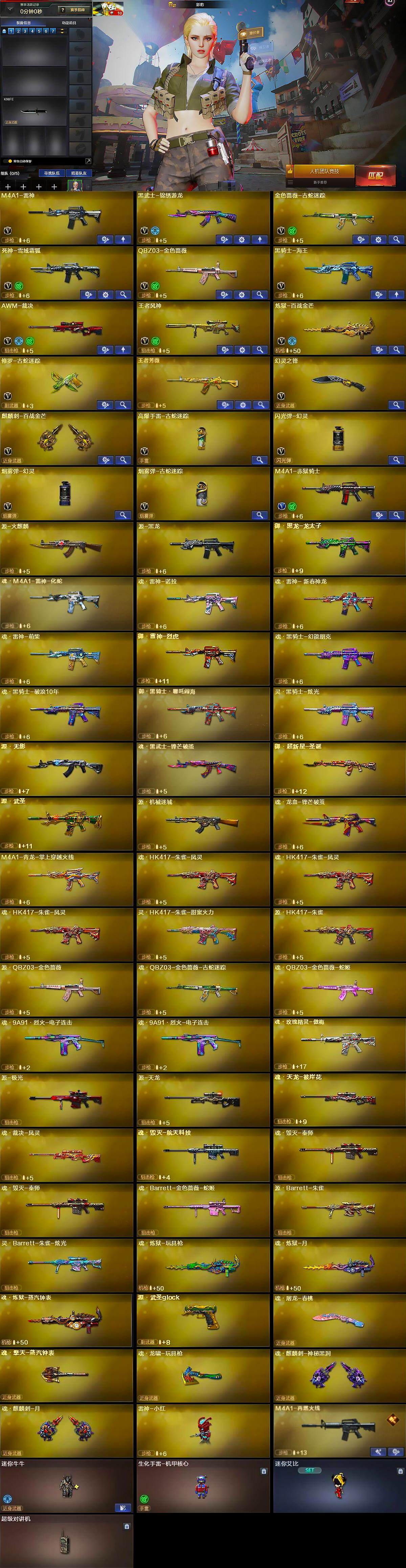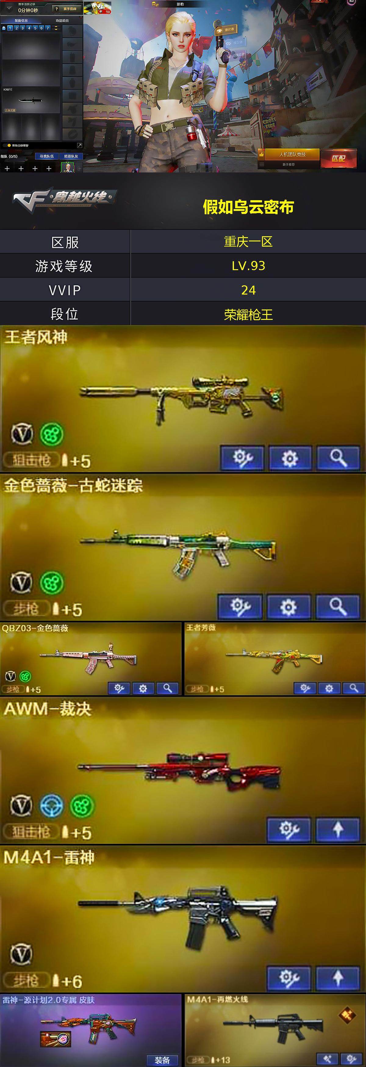 重庆一区-19v-3王者-0炫金 【热门武器】:q03-金色蔷薇,金色蔷薇-古蛇迷踪,修罗-古蛇迷踪,雷神-小红 【王者炫金武器】:王者芳薇 【音效卡】:麒麟刺-百战金芒-盛典舞曲音效卡,炼狱-百战金芒-庆典舞曲音效卡,死神-雪域霜狐-怀旧音效卡 【皮肤】:雷神-源计划2.0专属 皮肤,m4a1-再燃火线,战神-紫绶金章皮肤,轻型军用手斧-再燃火线 【角色】:影豹,隼,战地猎狐,雪域霜狐,