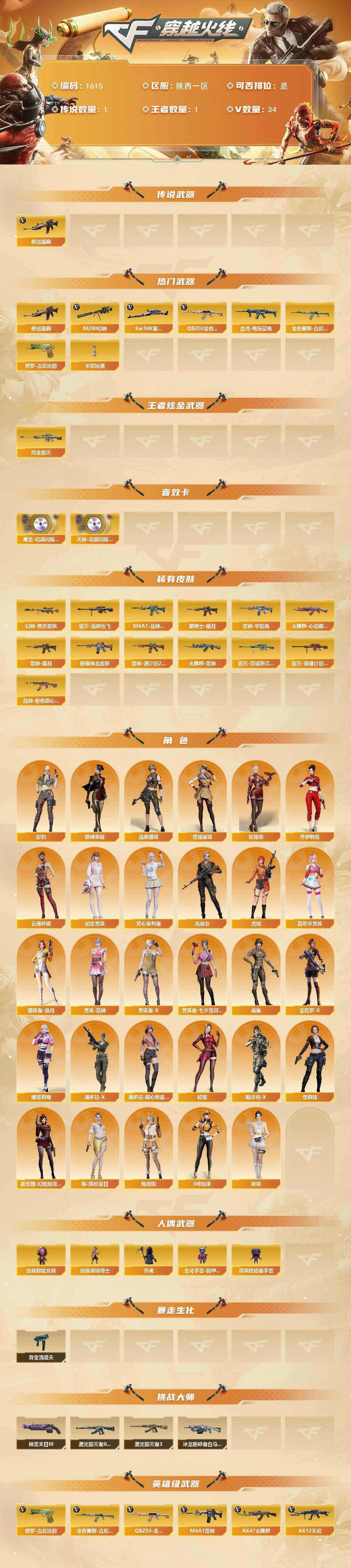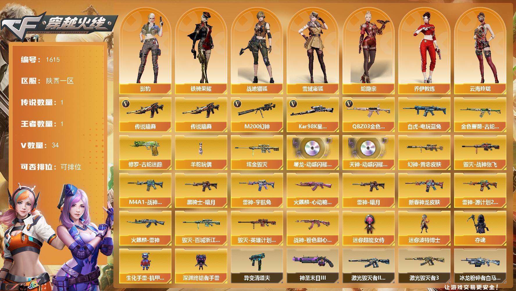 【1615】特80455西部陕西一区可排位可二次【陕西一区/38v/vip6/1传说】【纯白无封号/哔哩哔哩名片/8位qq/传说暗裔/幻神带皮/星神/妮妮角色/烈龙毒蜂】【m200-幻神/m200-幻神-黄忠皮肤】【kar98k-星神】【q03-金色蔷薇/白虎-电玩蓝兔】【m4a1-雷神/m4a1-战神赵云/雷神-宇航兔皮肤/雷神-暗月】【barrett-毁灭/毁灭-百城浙江 皮肤/毁灭-战神张飞】【ak47-火麒麟/火麒麟-cfstar/火麒麟-心动糖果/火麒麟-雷神】【无影-神兵利器】【烈龙-云海游龙】【天神-动感闪耀】【擎天-云海游龙】【屠龙-动感闪耀 音效卡/屠龙-动感闪耀】【龙啸】【影豹/樱-缤纷夏日/木兰/云海玲珑/乔伊教练/兔囡囡/灵狐-花神/麻雀/紫霞/妲己/雪莉杨/潘多拉-x/斯沃特-x/铁骑荣耀/堕天使/复仇者】【m4a1-龙血】【ak47-b-战神】【ak12-天启】【barrett-暗月传说】【colt1911-小故障2/colt 1911-大黄蜂2/新usp-呛王排位奖励2】【金刚伞-电玩红兔】【神圣爆裂者-末日iii/激光毁灭者iii-白马银呛/激光毁灭者iii/冰龙粉碎者-白马银呛】【异变清道夫/异变清道夫】【猫猫手套/夺魂】【手蕾-云海游龙】【高爆手蕾-幻灵3/闪光丹-幻灵3/盐雾蛋-幻灵3】【炫金毁灭】【语音特效-云海游龙】【超级护目镜/透明护目镜/烟雾保护头盔/闪光护目镜/超级背包/防弹头盔6/防弹衣6/c4工具钳6/手蕾包6/防化服2】截图展示段位不代表实际段位,如赛季更新等不/拒因素发生变化、时限道具不保证所剩时间。标题未写送点卷默认不送