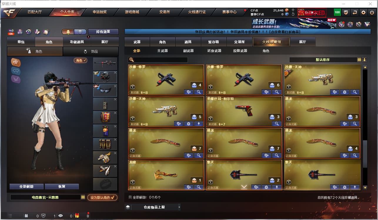 2281416-自带2w点卷)cf南部/南方大区/72v/m200幻神 降龙皮 黄忠皮/5盘 6烈 死亡之眼/白虎-电玩蓝兔/荣耀世冠柯尔特/q金色蔷薇/火麒麟/黑龙/雷神/无影/黑鲨/烈火/王者之心/王者之武/荣耀世冠雷神/天龙/毁灭/极光/王者之怒/屠龙/擎天/云悠悠(四防)/可排