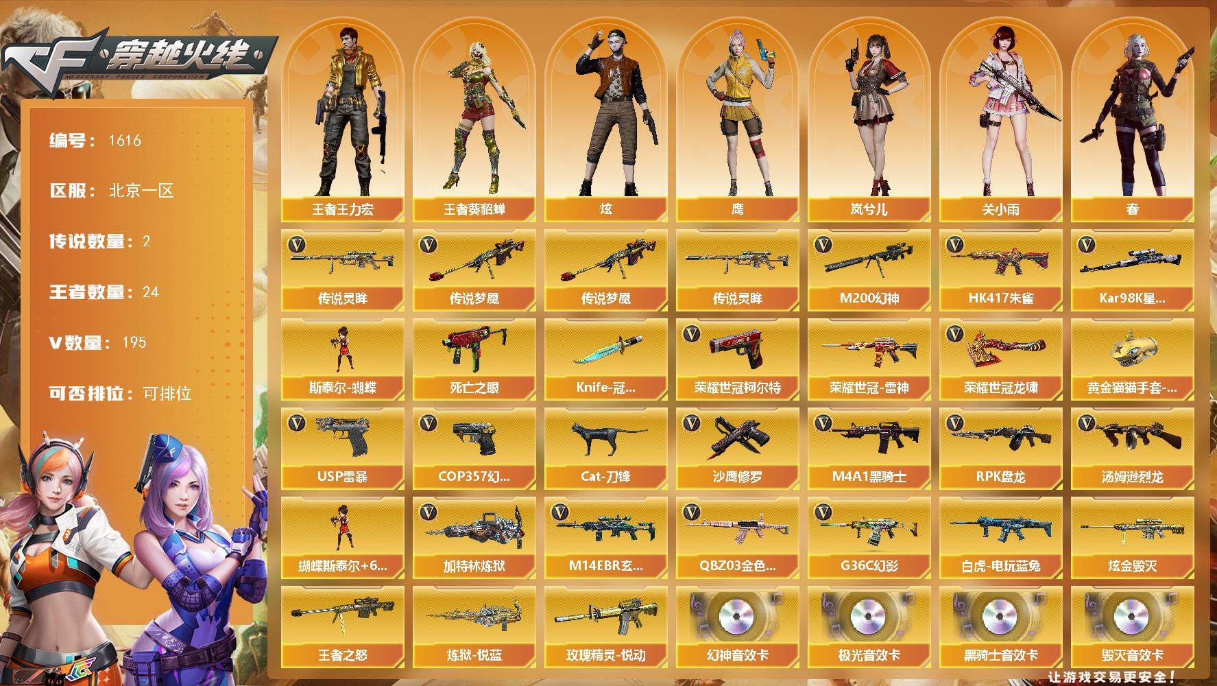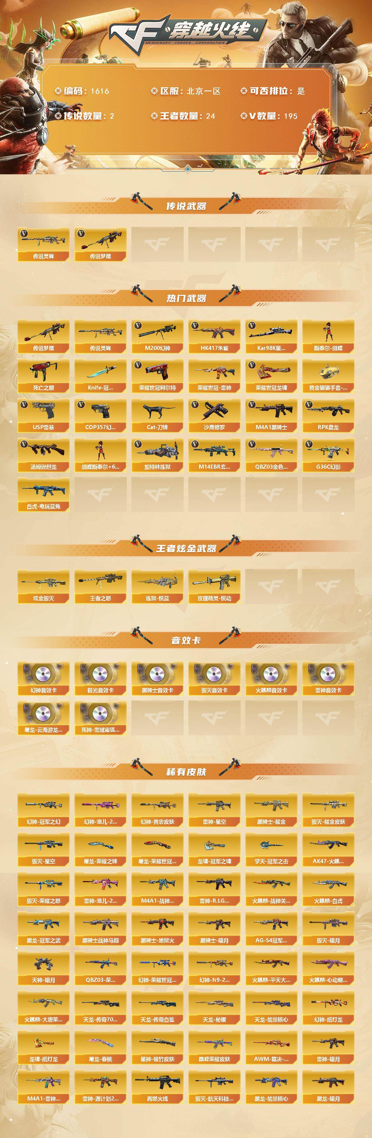 【1616】特99065北部北京一区可排位可二次【北京一区/210v/vip6/2传说】【无十年记录/生化爆破挑战全能/传说梦魇/传说灵眸/臻选次元套擎天柱/6烈龙蝴蝶/幻神三件套6皮肤/星神三件套/6炼狱/6修罗/5盘龙/雷暴套/武圣套/雷霆套/18把手呛拉满/15套雷/5四防角色】【m200-幻神/m200-幻神音效卡/幻神-宠儿-2021mvp2/m200-幻神-n9-2022mvp/幻神-冠军之幻/m200-幻神-荣耀世冠白鲨/幻神-纸灯龙皮肤/m200-幻神-黄忠皮肤】【kar98k-星神/kar98k-星神音效卡/星神-破竹皮肤【knife-冠军之刃/黄金猫猫手套-白鲨】【g36c-幻影】【荣耀世冠-柯尔特2/usp-雷暴2】【q03-金色蔷薇/q03-金色蔷薇音效卡/q03-荣耀世冠白鲨/q03-巅峰荣耀皮肤】【m4a1-雷神5/m4a1-雷神音效卡/雷神-宠儿-2019mvp/m4a1-雷神-白鲨皮肤/m4a1-雷神-巅峰荣耀皮肤/雷神-r.lgd-cfpls18冠军/m4a1-战神赵云/雷神-星空/雷神-暗月】【glock18-武圣/cop,357-幻灵2/雷霆之契2】【barrett-毁灭/barrett-毁灭音效卡/毁灭-荣耀之怒/毁灭-航天科技皮肤/毁灭-星空/毁灭耀金皮肤/毁灭-暗月】【鹰】【ak47-火麒麟3/ak47-火麒麟音效卡/ak47-火麒麟-传奇even/火麒麟-cfstar/火麒麟-大唐荣光/火麒麟-白虎/火麒麟-心动糖果/火麒麟-战神关羽/火麒麟-平天大圣】【m4a1-黑骑士3/m4a1-黑骑士音效卡/黑骑士-战神马超/黑骑士-ag-s4冠军典藏/黑骑士-地狱火/黑骑士耀金皮肤】【m4a1-黑龙5/黑龙-冠军之武/黑龙-能量核心2】王者之幻】【hk417-朱雀】【ak47-无影2/无影-神兵利器/无影-能量核心】【ak47-黑武士/黑武士-锦绣游龙】【awm-天龙2/awm-天龙-传奇70kg2/awm-天龙-传奇白鲨/天龙-秘银/天龙-能量核心2】【barrett-极光/barrett-极光音效卡/极光-能量核心2】【awm-裁决】【m4a1-死神/m4a1-千变】【汤姆逊-烈龙6/烈龙-云海游龙】【rpk-盘龙5】【加特林-炼狱7/炼狱-悦蓝2/炼狱-月,皮肤】【斯泰尔-蝴蝶/死亡之眼/迷你生化手蕾】【沙鹰-修罗8/修罗-cfstar/修罗-能量核心6】【天神-动感闪耀】【麒麟刺2/麒麟刺-萌杀皮肤】【擎天3/擎天-冠军之击/擎天-云海游龙】【屠龙7/屠龙-荣耀世冠ag3/屠龙-荣耀之锋2/屠龙-云海游龙/屠龙-动感闪耀/屠龙-秘银/屠龙-春桃,皮肤】【荣耀世冠-龙啸/龙啸4/龙啸-冠军之啸/龙啸-纸灯龙皮肤/龙啸-烈火龙威】【王者沙漠玫瑰/机械姬/炫/春/关小雨/王者潘多拉/王者-葵-貂蝉/王者王力宏/魅影/岚兮儿/暗夜-x/审判者/兰-海滩派对/幽/奇洋探员/云海玲珑/乔伊教练/修道士/兔囡囡/超能特工/零-水下丽影/麻雀/紫霞/灵狐者-黄金海岸/蜀雪/娟娟/潘多拉-x/斯沃特-x/救世主-x/铁骑荣耀/幻影/堕天使/复仇者】【m14ebr-玄武/m4a1-玫瑰精灵2/m4a1-猎神/m4a1-雷霆/m4a1-武圣】【白虎-电玩蓝兔/ak47-b-战神/ak-47-猩红传说/玫瑰精灵-悦动】【ak47-雷暴/aa-12-雷霆2/ak47-黑鲨4/ak47-机械迷城/ak12-天启3/天启-暗月5】【an94-超新星/超新星-悦享/超新星-热带奇洋】【barrett-暗月传说】【colt1911-小故障2/colt,1911-大黄蜂5/cop,357-青龙/新usp-呛王排位奖励】【龙啸-热带奇洋/斩魔刀/金刚伞-电玩红兔/迷你深渊冰龙/唐刀-神工天巧】【神圣爆裂者iii/神圣爆裂者-末日iii/机甲撕裂者iii/vepr-12-金魔/kac-圣炎切割者iii/激光毁灭者iii-白马银呛/激光毁灭者iii/冰龙粉碎者-白马银呛】【斯泰尔-巧克力/轻型军用手斧-镜】【猫猫手套/cat-刀锋/m4a1-雷神-精英刀锋/m4a1-刀锋/cop-旗袍/火麒麟-灵狐/m37-葵/天龙-曼陀罗/迷你裂空之翼/王者barrett-英勇金戈】【王者之心/王者之影/王者之魄/王者之势/王者之光/王者之锋/王者之击/王者之武】【手蕾-云海游龙】【高爆手蕾-雷暴7/闪光丹-雷暴7/盐雾蛋-雷暴7】【高爆手蕾-雷霆7/闪光丹-雷霆7/盐雾蛋-雷霆7】【高爆手蕾-神工天巧/闪光丹-神工天巧3/盐雾蛋-神工天巧2】【高爆手蕾-幻灵2/闪光丹-幻灵2/盐雾蛋-幻灵3】【手蕾-热带奇洋】【炫金毁灭】【语音特效-云海游龙】【超级护目镜/透明头盔/烟雾保护头盔/闪光护目镜/超级对讲机/超级背包/炫彩背包/防弹头盔5/防弹衣7/c4工具钳4/手蕾包2/防化服2】截图展示段位不代表实际段位,如赛季更新等不/拒因素发生变化、时限道具不保证所剩时间。标题未写送点卷默认不送 【稀有套装】:幻神三件套,星神三件套