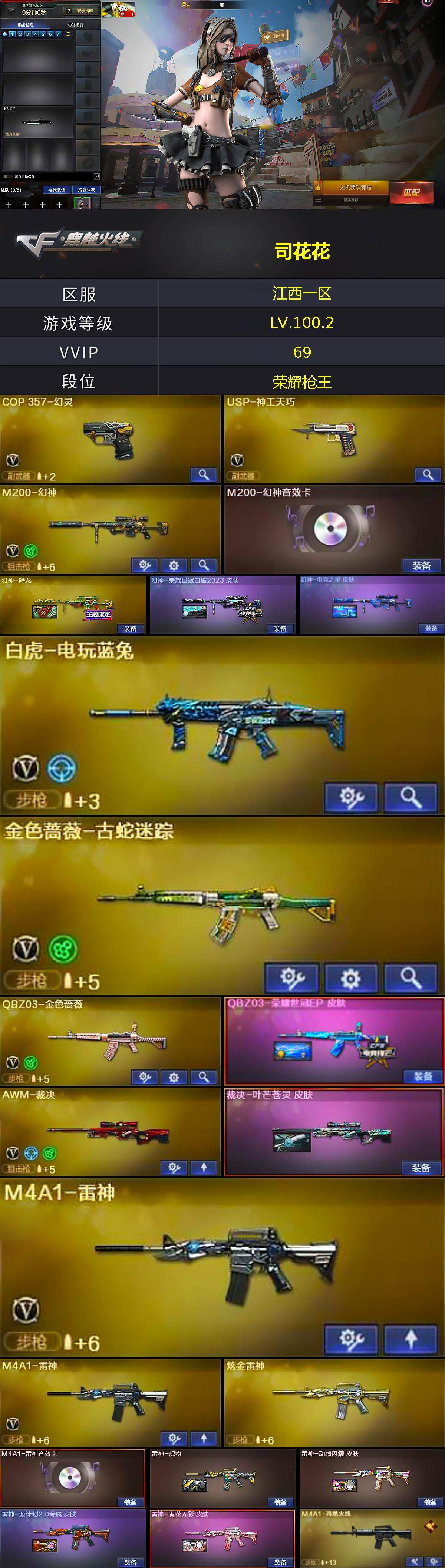 江西一区-64v-10王者-2炫金 【热门武器】:q03-金色蔷薇,m14ebr-玄武,m200-幻神,金色蔷薇-古蛇迷踪,修罗-古蛇迷踪,白虎-电玩蓝兔,金色小号,牛牛-ak47,m4a1-黑骑士,羊驼玩偶,cop-白鲨,cop 357-幻灵,沙鹰-修罗2 【王者炫金武器】:雷霆王者之锋,炫金雷神,炫金武士,王者之魄高爆手蕾,王者之魄闪光丹 【音效卡】:m200-幻神音效卡,m4a1-