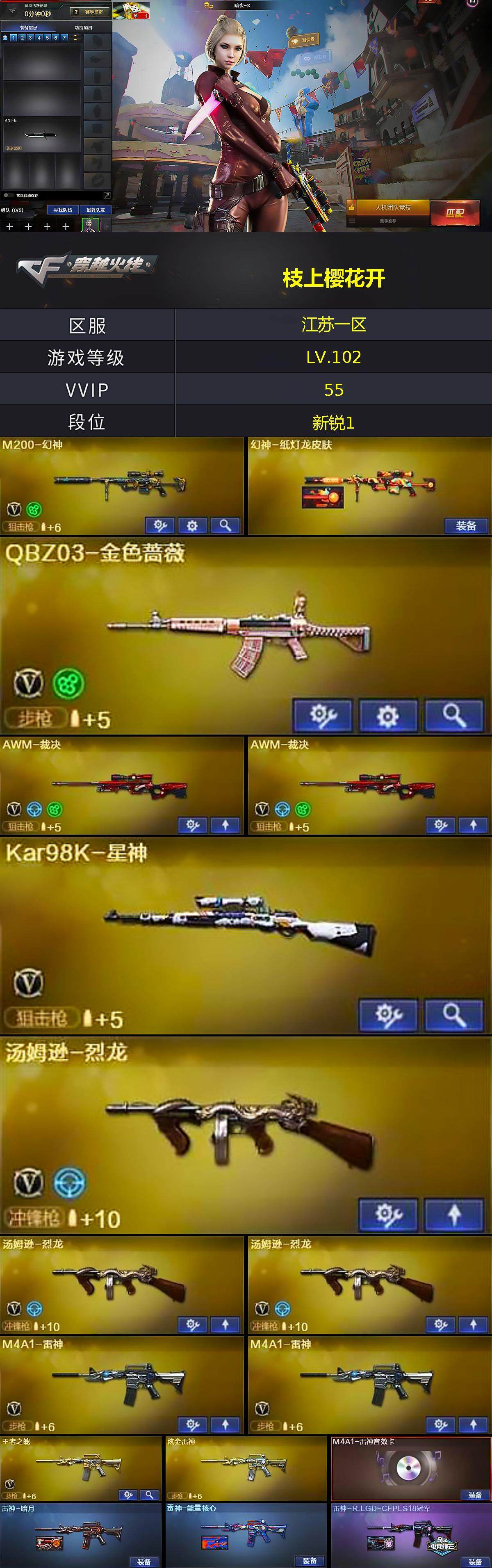 江苏一区-55v-4王者-3炫金 【热门武器】:q03-金色蔷薇,hk417-朱雀,m200-幻神,死亡之眼,kar98k-星神,m4a1-黑骑士,汤姆逊-烈龙3,加特林-炼狱,沙鹰-修罗4 【王者炫金武器】:超新星-悦享,炫金雷神,炫金天龙2 【音效卡】:m4a1-雷神音效卡,m4a1-黑骑士音效卡,barrett-毁灭音效卡,barrett-极光音效卡 【皮肤】:幻神-纸灯龙皮肤