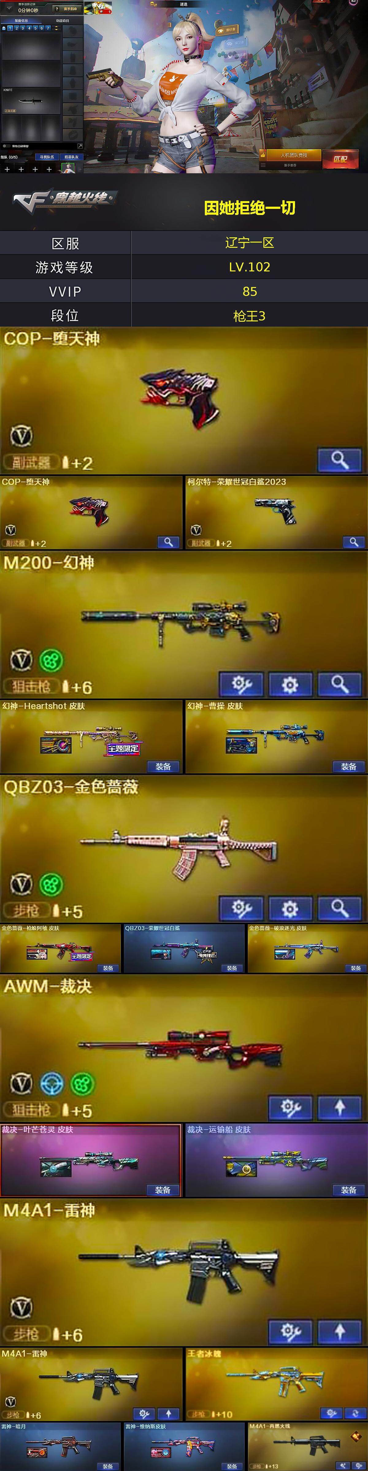 辽宁一区-82v-11王者-0炫金 【热门武器】:q03-金色蔷薇,hk417-朱雀,m200-幻神,柯尔特-荣耀世冠白鲨2023,m4a1-黑骑士2,加特林-炼狱,羊驼玩偶,火麒麟-绝迹,cop-白鲨,cop-堕天神2,沙鹰-修罗6,炽芒蝶刃,炽芒蝶刃-荣耀世冠白鲨2023 皮肤 【王者炫金武器】:王者之戮,王者之魄,王者之怒 【音效卡】:m4a1-黑龙音效卡,m4a1-黑骑士音效卡,barrett-毁灭音效卡,barrett-极光音效卡,barrett-碧霄极光音效卡3,炼狱-百战金芒-庆典舞曲音效卡,死神-雪域霜狐-怀旧音效卡 【皮肤】:幻神-heartshot 皮肤,幻神-曹操 皮肤,金色蔷薇-呛娘阿敏 皮肤,q03-荣耀世冠白鲨,金色蔷薇-破浪逐光 皮肤,裁决-叶芒苍灵 皮肤,裁决-运输船 皮肤,雷神-暗月,雷神-维纳斯皮肤,m4a1-再燃火线,ak47-火麒麟-传奇even,火麒麟-轻羽皮肤,火麒麟-平天大圣,毁灭耀金皮肤2,毁灭-黑大圣皮肤,毁灭-英雄计划 皮肤,m4a1-黑龙-361,黑骑士-暗月,黑骑士-地狱火,黑骑士-战神马超,黑骑士-破浪10年皮肤,战神-粉色甜心皮肤2,战神-紫绶金章皮肤,战神-流金岁月皮肤2,极光-能量核心,炼狱-星空,修罗-能量核心,修罗-星空2,修罗-百战金芒 皮肤,屠龙-破浪逐光 皮肤,轻型军用手斧-再燃火线,炽芒蝶刃-荣耀世冠白鲨2023 皮肤 【角色】:迷迭香,王者-瞳-闭月羞花,王者炫,王者-魅影,王者-救世主,雪域霜狐,蛇隐宗,奇洋探员,空,暗夜-x,初恋灵狐,飞虎队-x,嘉年华灵狐,娟娟,龙儿,麻雀,潘多拉-x,潘多拉-甜心教官,潜龙队-x,青霞仙子,蛇姬,斯沃特-x,蜀雪,铁骑荣耀,新娜塔莎,雪莉杨,游珑儿 【人偶武器】:火麒麟-绝迹,cop-白鲨,芭蕾特-零-水下丽影,海滩汪汪-芭蕾特,迷你牛牛2,生化手蕾-机甲核心,闪光丹-小乔,迷你巨石泰坦-魔花研究所,灵狐娃娃手蕾 【暴走生化】:超级对讲机 【挑战大师】:神圣爆裂者iii,ak47-冰龙粉碎者,激光毁灭者iii3 【英雄级武器】:ak47-火麒麟,m4a1-黑龙,m4a1-雷神2,m4a1-黑骑士2,ak12-天启,an94-超新星,m4a1-堕天神,hk417-朱雀,死神-雪域霜狐,q03-金色蔷薇,王者之势-觉醒版,王者玄武-觉醒版,barrett-毁灭,barrett-极光,awm-裁决,m200-幻神,barrett-朱雀,王者之力-觉醒版,加特林-炼狱,炼狱-百战金芒,aa-12-雷霆,沙鹰-修罗6,cop-堕天神2,柯尔特-荣耀世冠白鲨2023,屠龙4,麒麟刺-堕天神3,擎天,炽芒蝶刃,屠龙-动感闪耀,龙啸-堕天神2,斩神刀-雷暴,麒麟刺-百战金芒,高爆手蕾-雷霆,高爆手蕾-雷暴,高爆手蕾-堕天神7,高爆手蕾-云龙,高爆手蕾-古蛇迷踪,高爆手蕾-玄豹,闪光丹-雷霆,闪光丹-雷暴,闪光丹-堕天神7,闪光丹-竞技荣光,闪光丹-云龙,盐雾蛋-雷霆,盐雾蛋-雷暴,盐雾蛋-堕天神7,盐雾蛋-云龙,盐雾蛋-古蛇迷踪,盐雾蛋-玄豹,m4a1-赤狱骑士 【道具】:ag战队炫彩背包,bs战队炫彩背包,云山科技背包,云海游龙炫彩背包,亚洲杯纪念炫彩背包,冰冰企鹅背包-猛男专用,古蛇迷踪炫彩背包,奇洋探员-海龟背包,炫彩背包,百战金芒炫彩背包,老虎背包,超级背包,雪域霜狐炫彩背包,女皇终结者-魔龙之吻,黄金生化钩,绿色巨人,灵魂忍者3,变异宝贝,迷雾幽灵,生化弹匣,夺命之镰,防化服3,金色流光-呛王排位2,星辰流光-呛王排位,巅峰赛先锋-金色流光,流光-鎏金之域,流光-再燃火线,呛王排位28赛季金色流光,呛王排位29赛季金色流光,语音特效-盛典烟火,语音特效-怀旧,古蛇迷踪打击特效,雪域霜狐表情,蛇隐宗表情,萌萌小葵表情,防弹头盔7,防弹衣7,c4工具钳4,手蕾包3 【特殊呛械】:2黑骑士,1炼狱