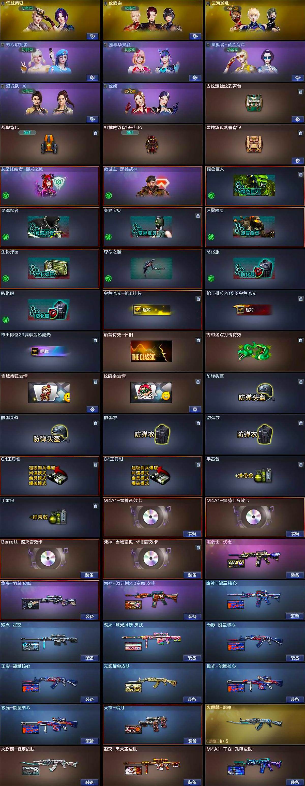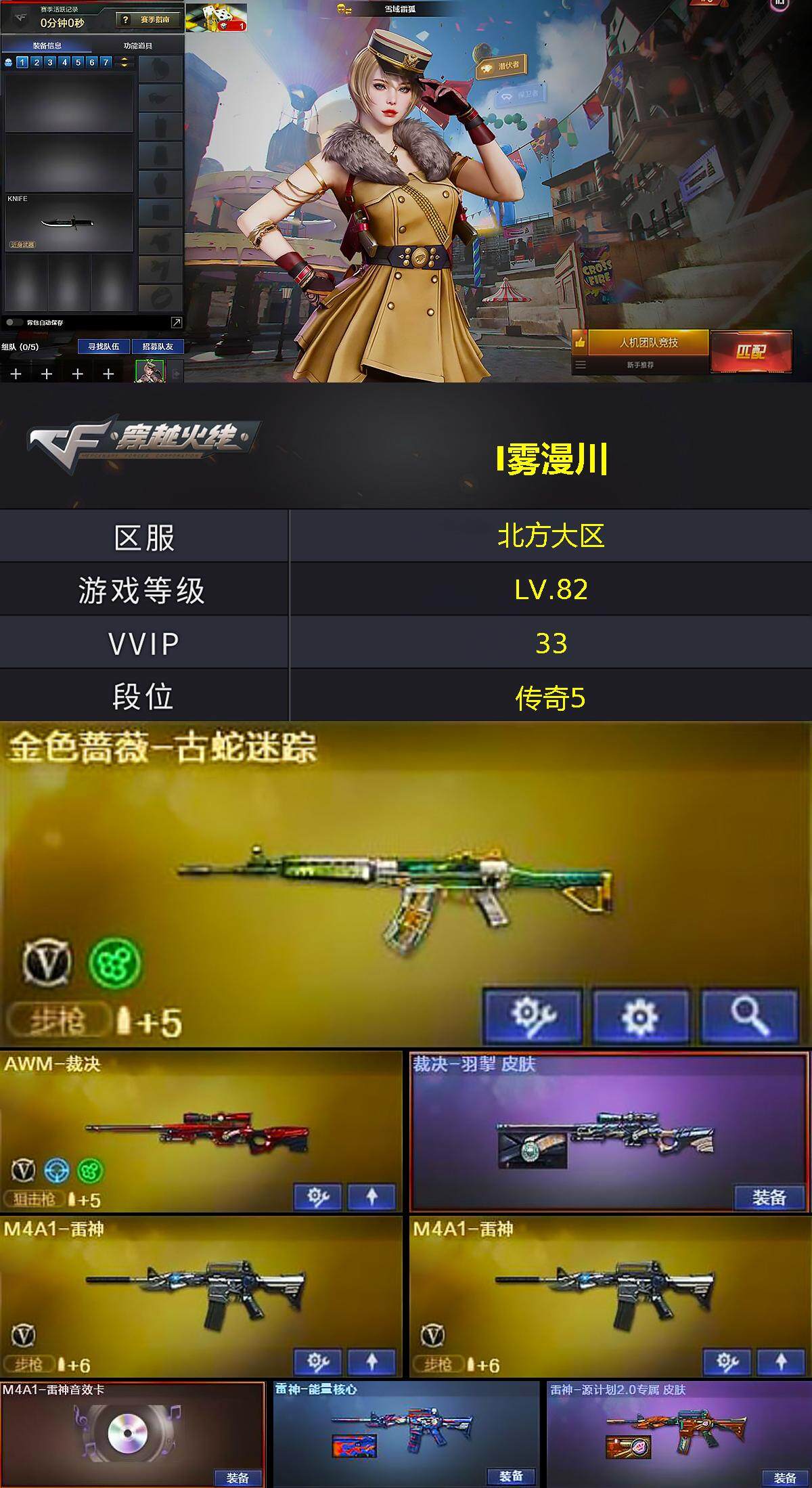 北方大区-29v-6王者-1炫金 【热门武器】:m4a1-青龙,金色蔷薇-古蛇迷踪,修罗-古蛇迷踪,死亡之眼,m4a1-黑骑士,加特林-炼狱,沙鹰-修罗2 【王者炫金武器】:王者之怒,王者之锋,炫金武士 【音效卡】:m4a1-雷神音效卡,m4a1-黑骑士音效卡,barrett-毁灭音效卡,死神-雪域霜狐-怀旧音效卡 【皮肤】:裁决-羽掣 皮肤,雷神-能量核心,雷神-源计划2.0专属 皮肤,火
