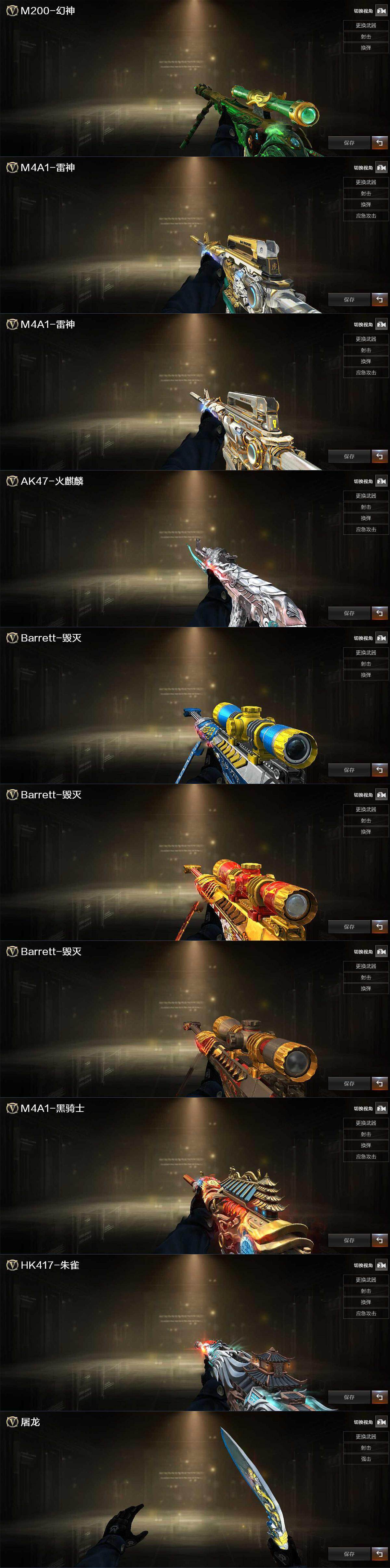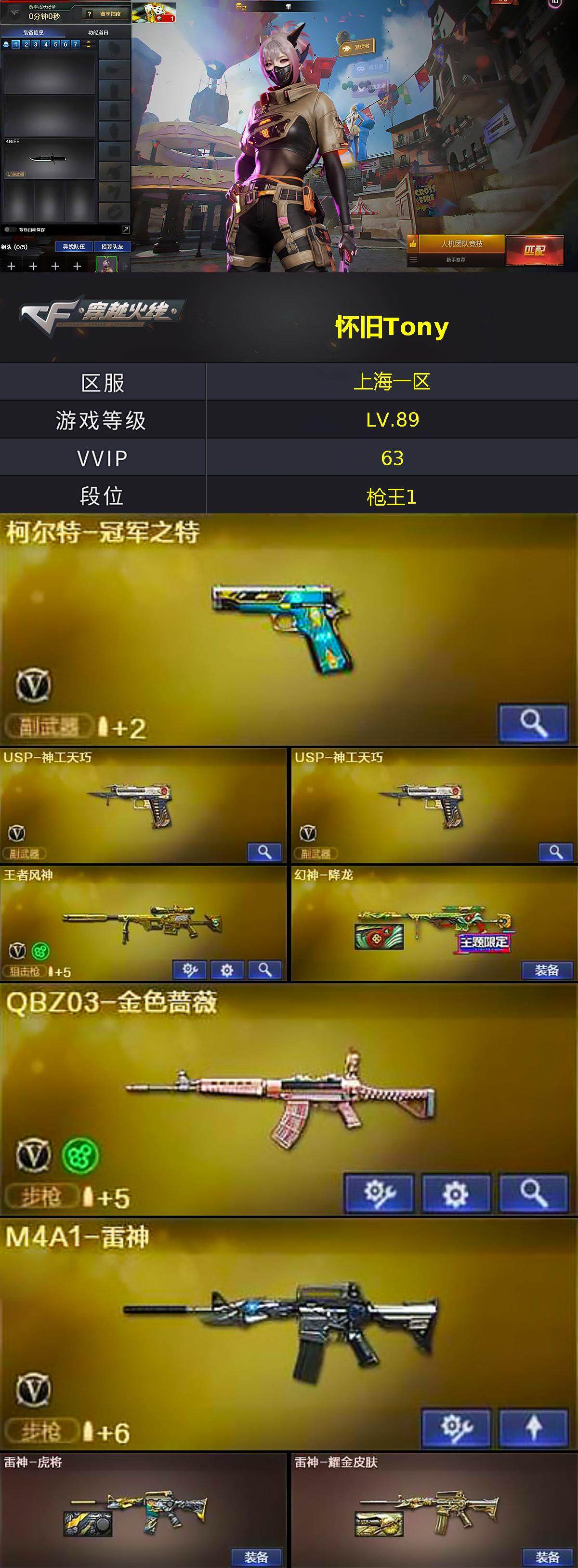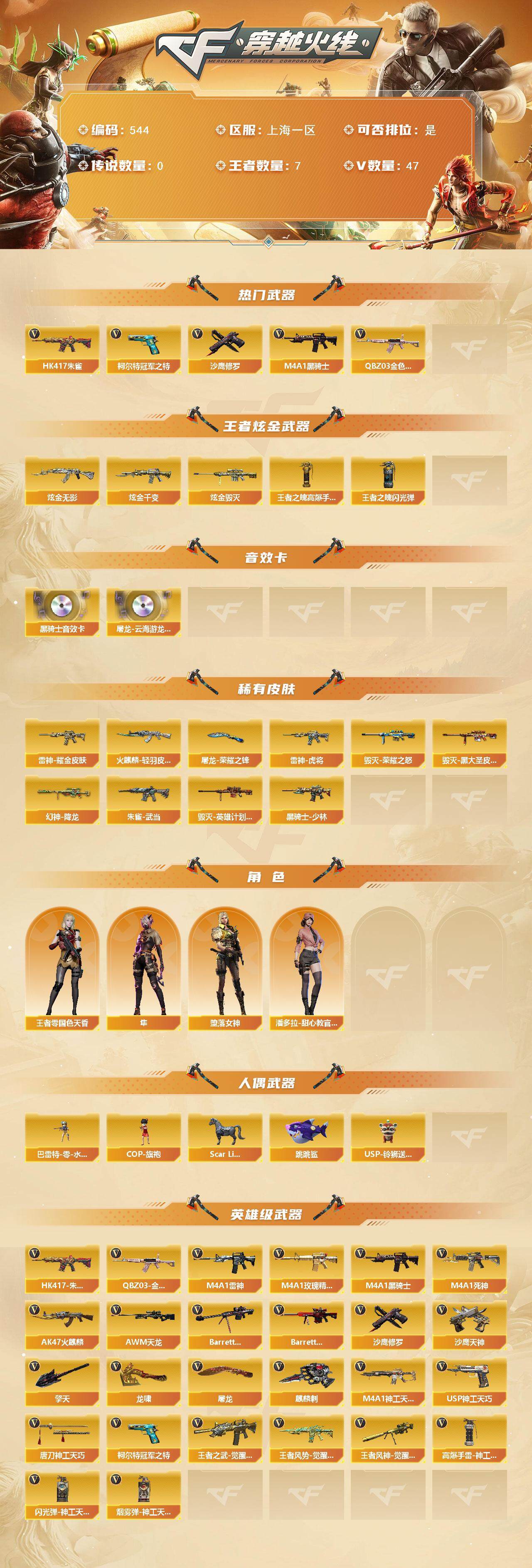 上海一区-47v-7王者-3炫金 【热门武器】:q03-金色蔷薇,hk417-朱雀,柯尔特-冠军之特,m4a1-黑骑士,沙鹰-修罗3 【王者炫金武器】:炫金无影,炫金千变,炫金毁灭,王者之魄高爆手蕾,王者之魄闪光丹 【音效卡】:屠龙-云海游龙音效卡,m4a1-黑骑士音效卡 【皮肤】:幻神-降龙,雷神-虎将,雷神-耀金皮肤,火麒麟-轻羽皮肤,毁灭-荣耀之怒,毁灭-黑大圣皮肤,毁灭-英雄计划