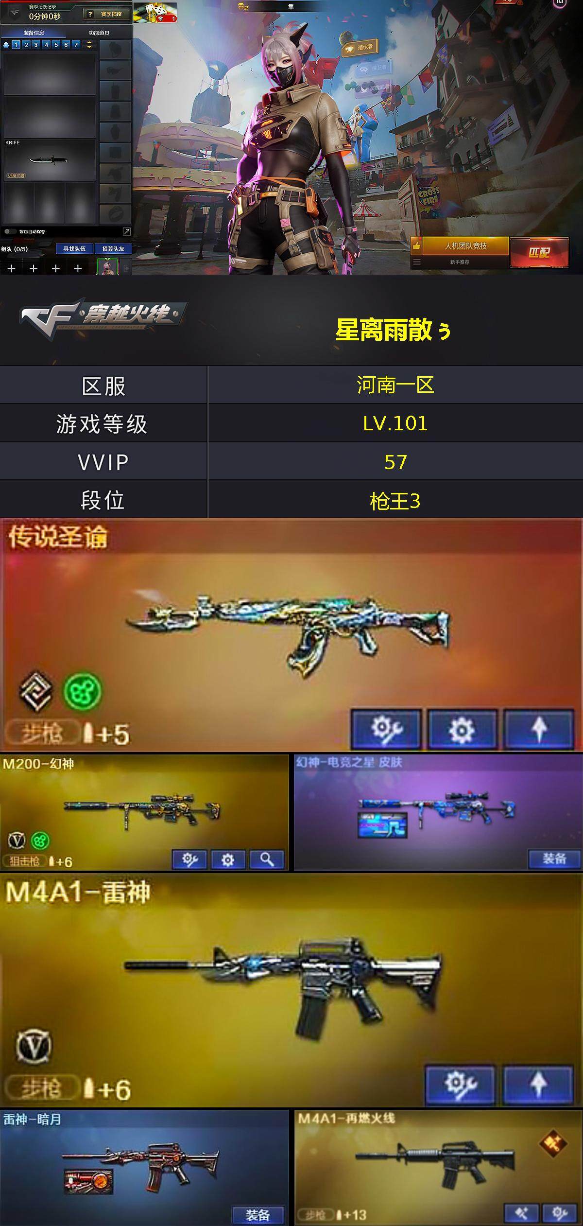 河南一区-53v-8王者-0炫金 【传说武器】:传说圣谕 【热门武器】:传说圣谕,m200-幻神,m4a1-黑骑士,沙鹰-修罗,炽芒蝶刃,炽芒蝶刃-破浪逐光 皮肤 【音效卡】:m4a1-黑骑士音效卡,barrett-碧霄极光音效卡,炼狱-百战金芒-庆典舞曲音效卡,死神-雪域霜狐-怀旧音效卡 【皮肤】:幻神-电竞之星 皮肤,kar98k-星神-ag-cfpls21冠军皮肤,雷神-暗月,m4a1-