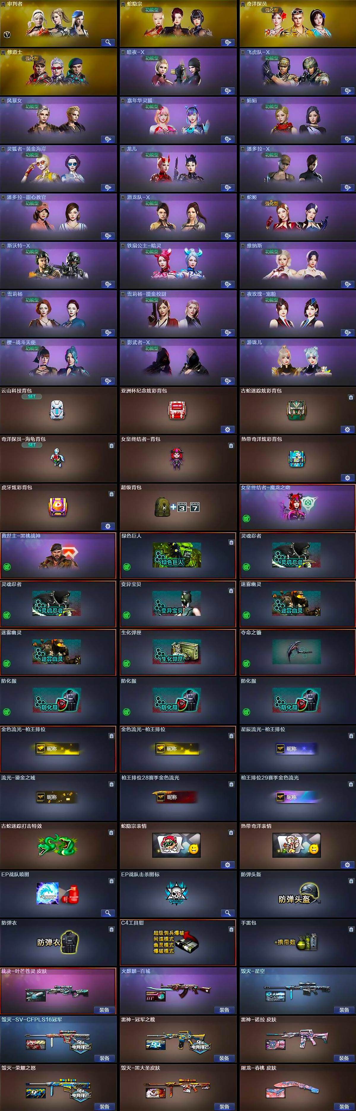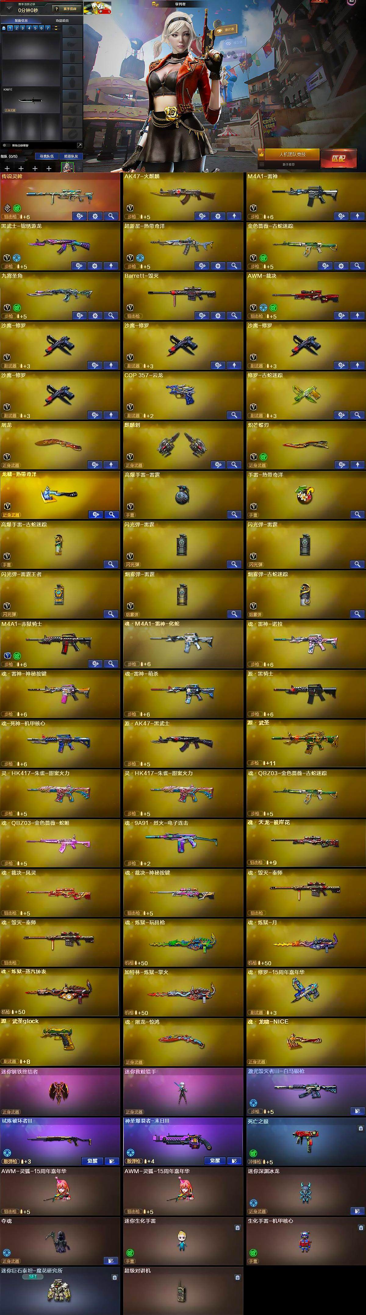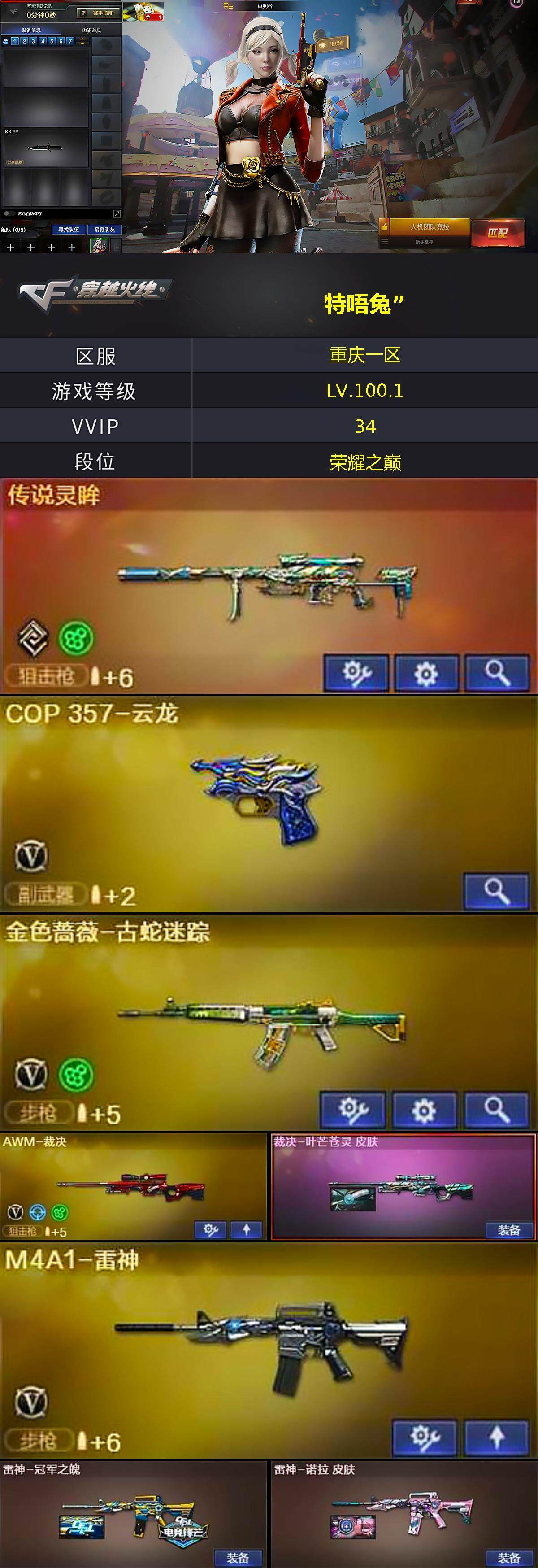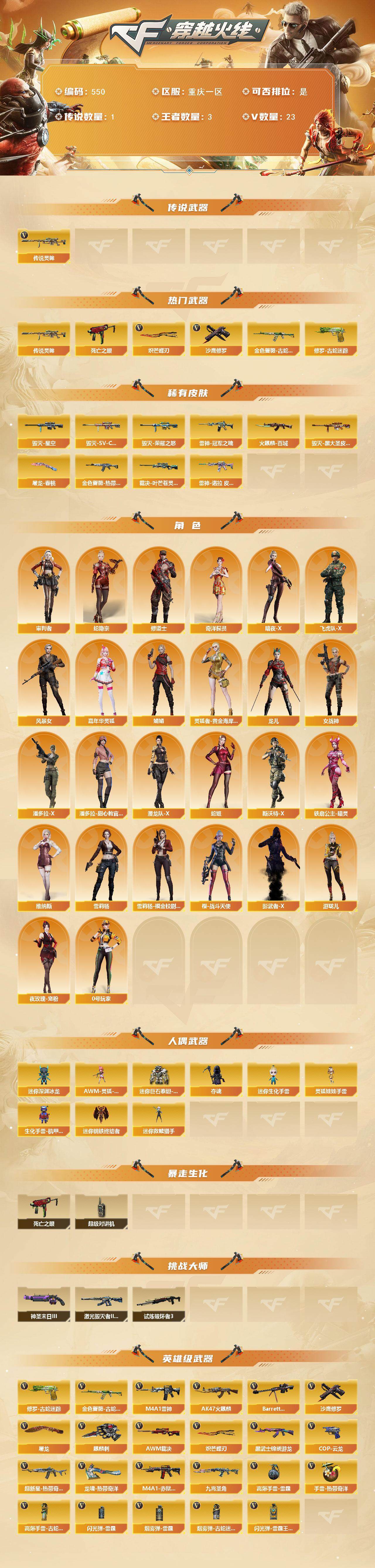[14867310]重庆一区-23v-3王者-0炫金 【传说武器】:传说灵眸 【热门武器】:传说灵眸,金色蔷薇-古蛇迷踪,修罗-古蛇迷踪,死亡之眼,沙鹰-修罗4,炽芒蝶刃 【皮肤】:金色蔷薇-热带奇洋 皮肤,裁决-叶芒苍灵 皮肤,雷神-冠军之魄,雷神-诺拉 皮肤,火麒麟-百城,毁灭-荣耀之怒,毁灭-星空,毁灭-sv-cfpls16冠军,毁灭-黑大圣皮肤,屠龙-春桃 皮肤 【角色】:审判者,蛇隐宗,奇洋探员,修道士,暗夜-x,飞虎队-x,风暴女,嘉年华灵狐,娟娟,0号玩家,灵狐者-黄金海岸,龙儿,女战神,潘多拉-x,潘多拉-甜心教官,潜龙队-x,蛇姬,斯沃特-x,铁扇公主-暗灵,维纳斯,雪莉杨,雪莉杨-摸金校尉,夜玫瑰-宠粉,樱-战斗天使,影武者-x,游珑儿 【人偶武器】:迷你钢铁终结者,迷你救赎猎手,awm-灵狐-15周年嘉年华2,迷你深渊冰龙,夺魂,迷你生化手蕾,生化手蕾-机甲核心,迷你巨石泰坦-魔花研究所,灵狐娃娃手蕾 【暴走生化】:死亡之眼,超级对讲机 【挑战大师】:激光毁灭者iii-白马银呛,试炼破坏者iii,神圣爆裂者-末日iii 【英雄级武器】:ak47-火麒麟,m4a1-雷神,黑武士-锦绣游龙,超新星-热带奇洋,金色蔷薇-古蛇迷踪,九霄圣角,barrett-毁灭,awm-裁决,沙鹰-修罗4,cop 357-云龙,修罗-古蛇迷踪,屠龙,麒麟刺,炽芒蝶刃,龙啸-热带奇洋,高爆手蕾-雷霆,手蕾-热带奇洋,高爆手蕾-古蛇迷踪,闪光丹-雷霆2,闪光丹-雷霆王者-觉醒版,盐雾蛋-雷霆,盐雾蛋-古蛇迷踪,m4a1-赤狱骑士 【道具】:云山科技背包,亚洲杯纪念炫彩背包,古蛇迷踪炫彩背包,奇洋探员-海龟背包,女皇终结者-背包,热带奇洋炫彩背包,虎牙炫彩背包,超级背包,女皇终结者-魔龙之吻,救世主-黑桃战神,绿色巨人,灵魂忍者2,变异宝贝,迷雾幽灵2,生化弹匣,夺命之镰,防化服3,金色流光-呛王排位2,星辰流光-呛王排位,流光-鎏金之域,呛王排位28赛季金色流光,呛王排位29赛季金色流光,古蛇迷踪打击特效,蛇隐宗表情,热带奇洋表情,ep战队喷图,ep战队击杀图标,防弹头盔,防弹衣,c4工具钳,手蕾包 【特殊呛械】:
