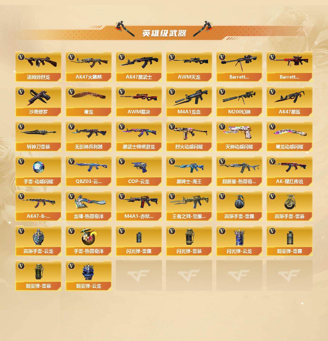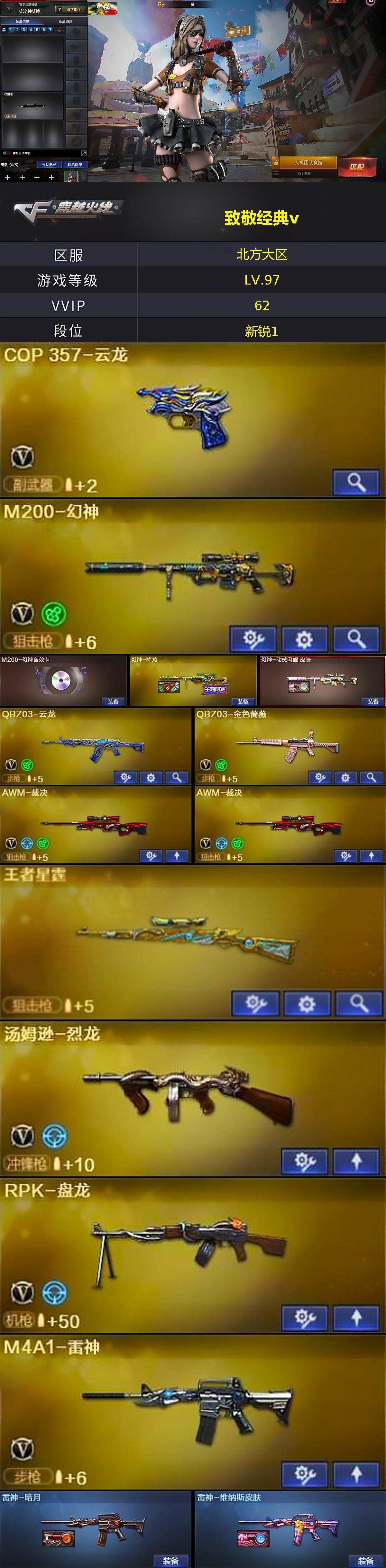 [14892671]北方大区-59v-5王者-2炫金 【热门武器】:q03-金色蔷薇,m200-幻神,炼狱-迷你小钢,m4a1-黑骑士2,汤姆逊-烈龙,rpk-盘龙,加特林-炼狱2,mk5-炽火炎龙,沙鹰-修罗2,金刚伞 【王者炫金武器】:王者之势,王者星霆,炫金骑士,炫金毁灭 【音效卡】:m200-幻神音效卡,m4a1-黑骑士音效卡,barrett-毁灭音效卡 【皮肤】:幻神-降龙,幻神-动感闪耀 皮