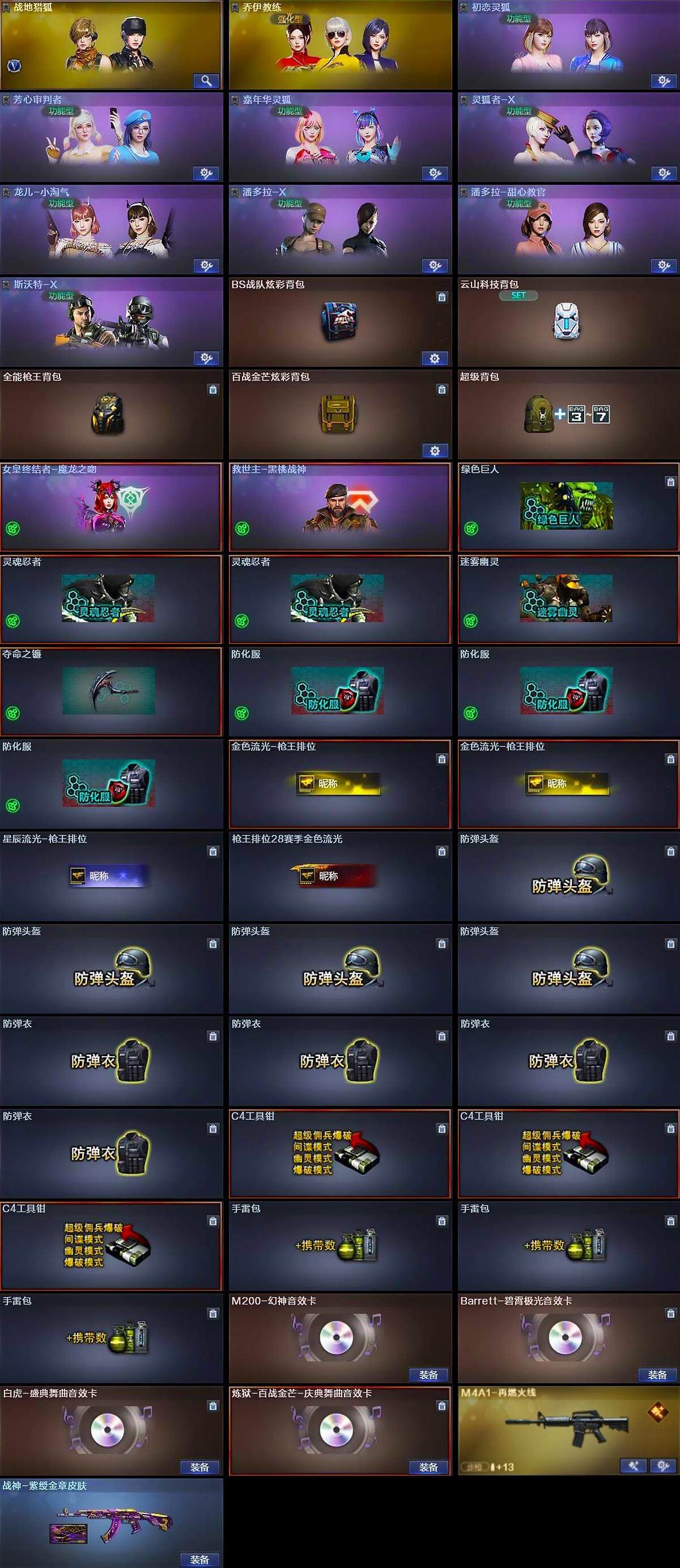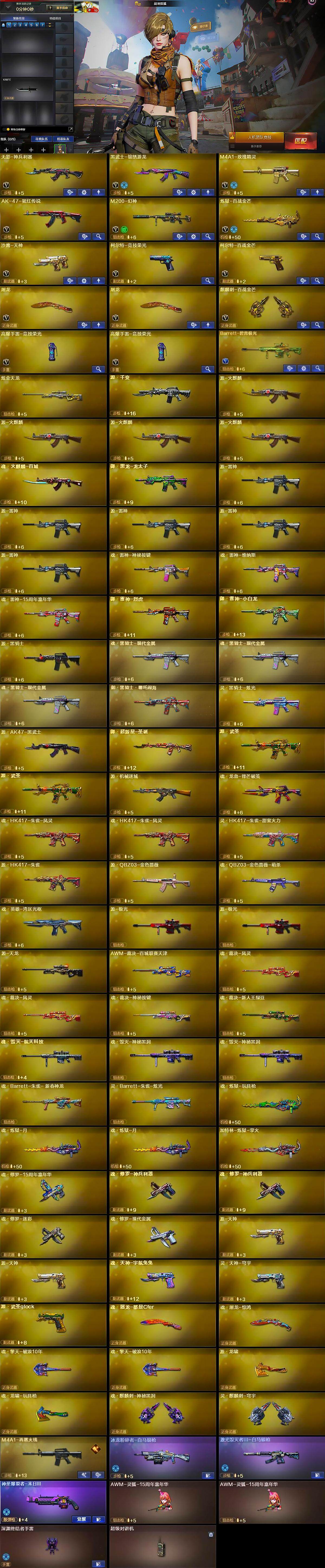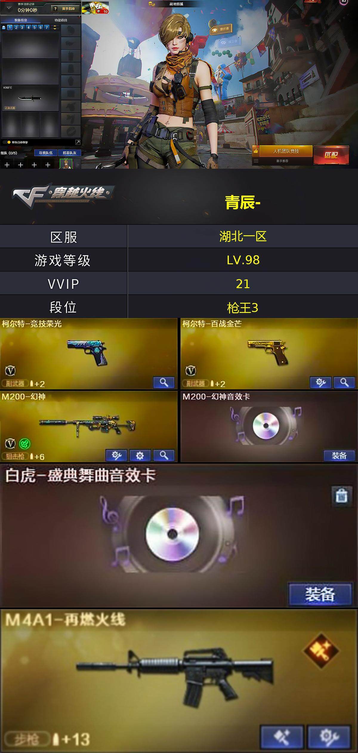 湖北一区-21v-0王者-1炫金 【热门武器】:m200-幻神 【王者炫金武器】:炫金天龙 【音效卡】:m200-幻神音效卡,barrett-碧霄极光音效卡,白虎-盛典舞曲音效卡,炼狱-百战金芒-庆典舞曲音效卡 【皮肤】:m4a1-再燃火线,战神-紫绶金章皮肤,轻型军用手斧-再燃火线 【角色】:战地猎狐,乔伊教练,初恋灵狐,芳心审判者,嘉年华灵狐,灵狐者-x,龙儿-小淘气,潘多拉-x,潘多拉-