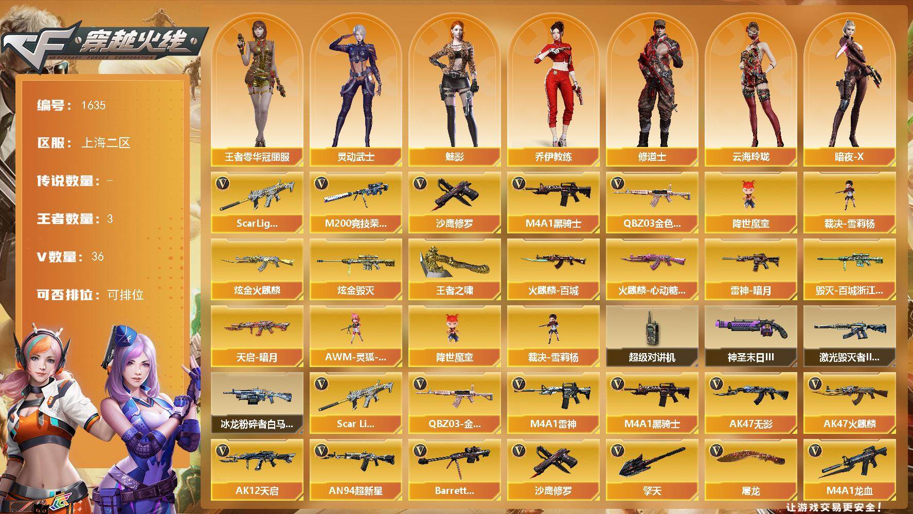 【1635】特29446可排位-可二次【上海二区/36v/vip6】【纯白无封号/附赠王者荣耀安卓q】【m200-竞技荣光】【王者星神】【scar light-白虎】【q03-金色蔷薇】【m4a1-雷神2/雷神-暗月】【barrett-毁灭/毁灭-百城浙江 皮肤】【ak47-火麒麟2/火麒麟-百城/火麒麟-cfstar/火麒麟-心动糖果】【m4a1-黑骑士2】【ak47-无影/无影-神兵利器】【沙鹰-修罗/修罗-cfstar】【天神-动感闪耀】【擎天】【屠龙/屠龙-动感闪耀】【龙啸-烈火龙威】【王者零-华冠丽服/魅影/龙儿/暗夜-x/灵动武士/葵-赛博朋克/木兰/云海玲珑/乔伊教练/修道士/兔囡囡/荆棘玫瑰/麻雀/紫霞/妲己/潘多拉-x/斯沃特-x/幻影/复仇者】【m4a1-龙血】【ak47-机械迷城/ak12-天启/天启-暗月】【an94-超新星】【colt1911-小故障/colt 1911-大黄蜂2/柯尔特-萌杀/新usp-呛王排位奖励3】【神圣爆裂者-末日iii/激光毁灭者iii-白马银呛/冰龙粉碎者-白马银呛】【猫猫手套】【王者之啸】【高爆手蕾-竞技荣光2/闪光丹-竞