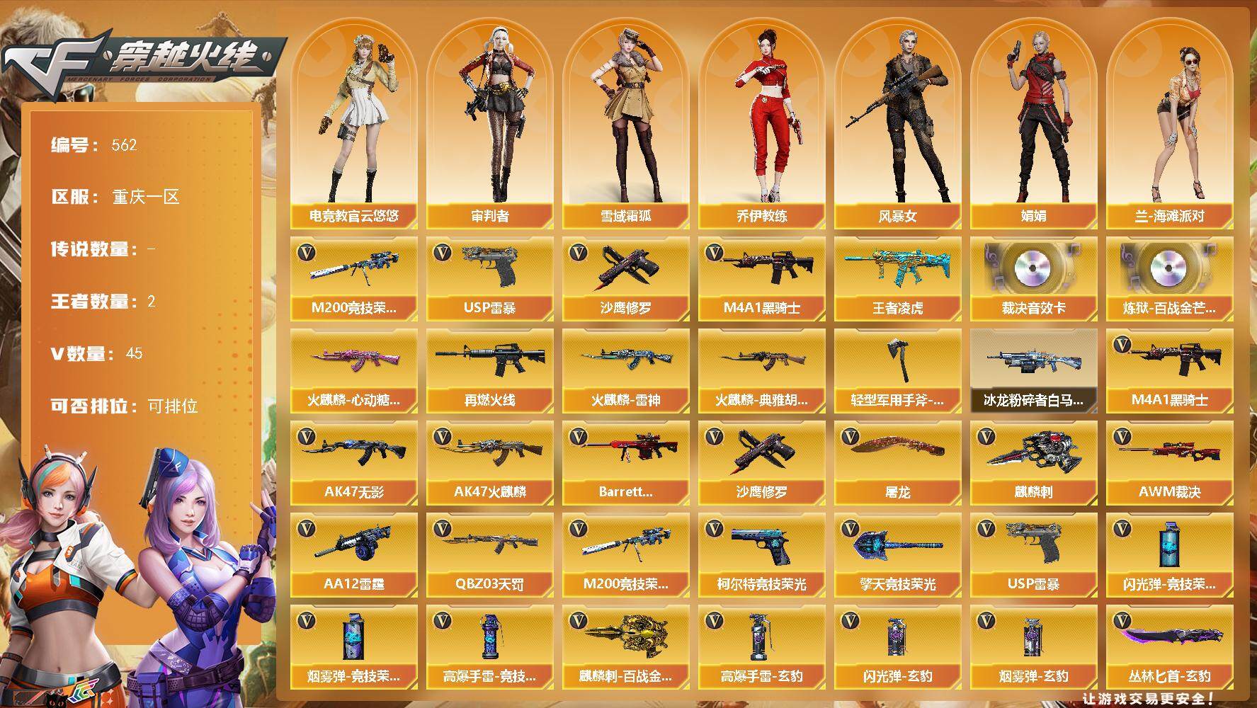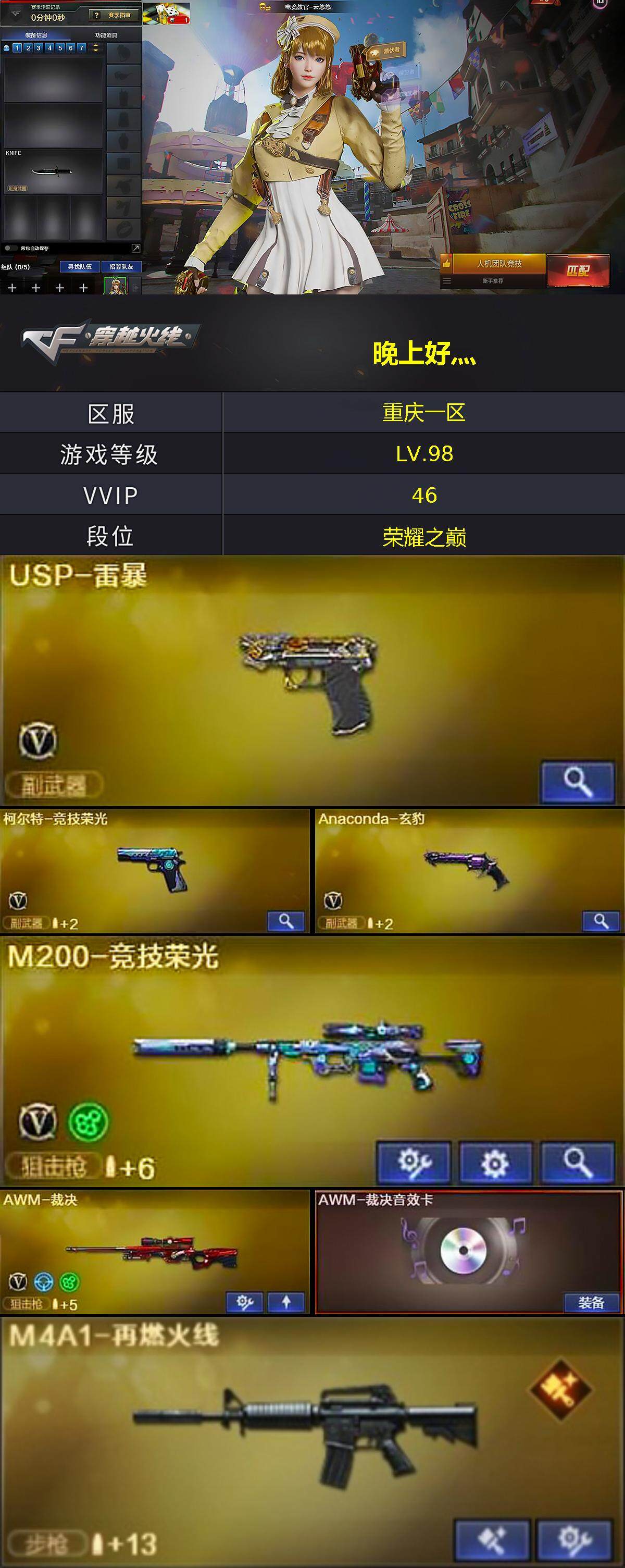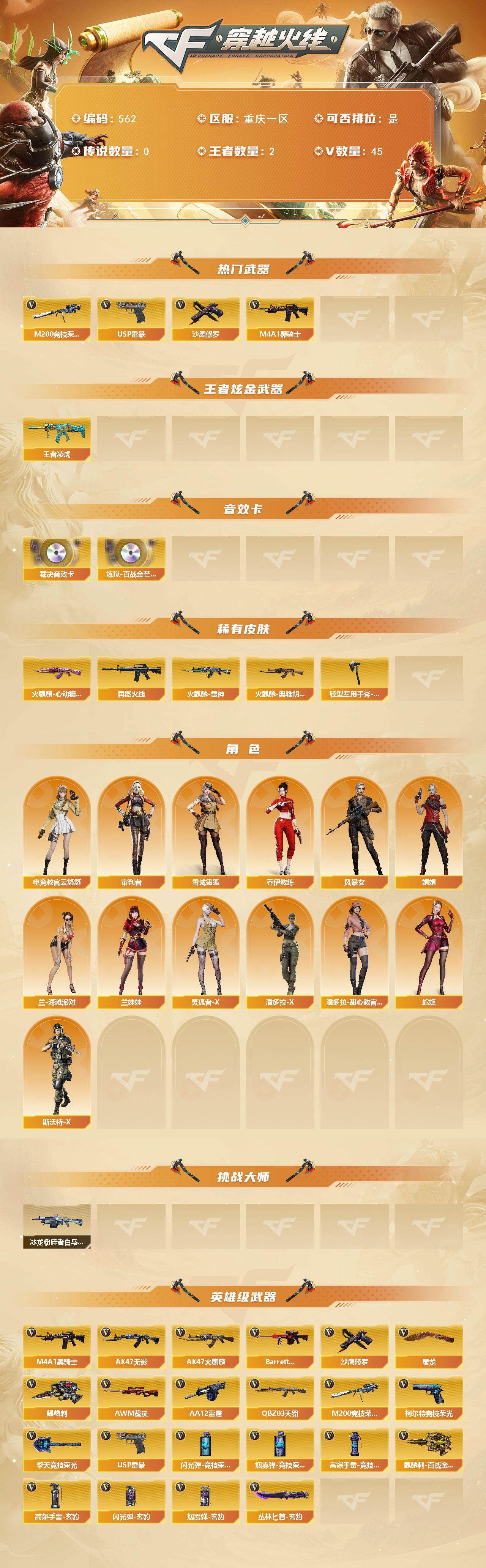 重庆一区-45v-2王者-0炫金 【热门武器】:m200-竞技荣光,m4a1-黑骑士,usp-雷暴,沙鹰-修罗 【王者炫金武器】:王者凌虎 【音效卡】:awm-裁决音效卡,炼狱-百战金芒-庆典舞曲音效卡 【皮肤】:m4a1-再燃火线,火麒麟-雷神2,火麒麟-心动糖果,火麒麟-典雅胡桃 皮肤,轻型军