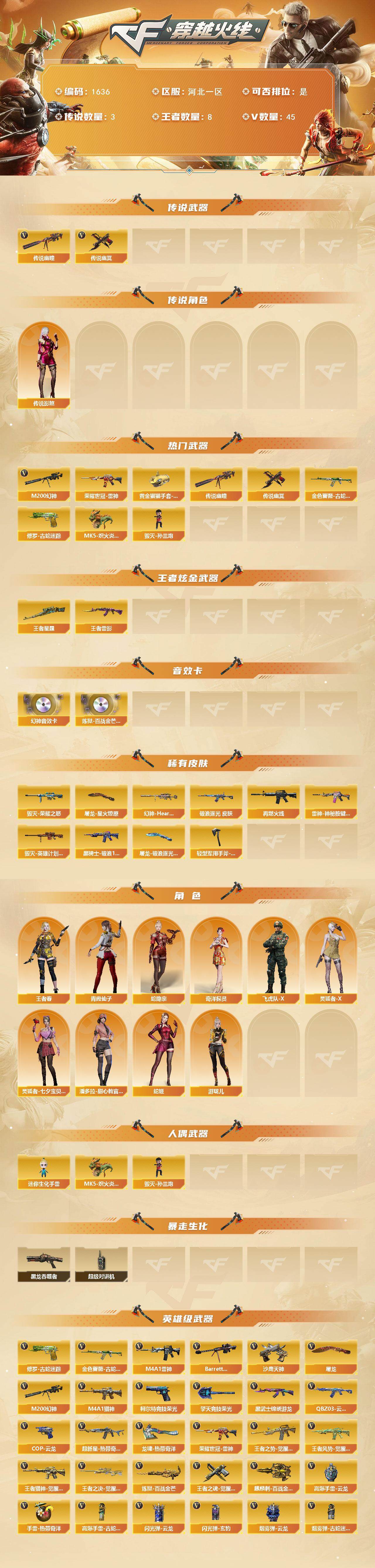 【1636】特22203北部河北一区可排位可二次【河北一区/45v/vip3/3传说】【纯白无封号/超核玩家/四防开槽影煞/传说幽冥/传说幽瞳/幻神三件套/8手呛/7套雷/云龙套装】【m200-幻神/m200-幻神音效卡/幻神-heartshot 皮肤】【王者星霆】【黄金猫猫手套-白鲨】【q03-云龙2】【王者雷影/王者之势/王者之决/王者之魂】【柯尔特-竞技荣光】【金色蔷薇-破浪逐光 皮肤2】【m4a1-雷神】【cop 357-云龙】【barrett-毁灭/毁灭-荣耀之怒】【黑武士-锦绣游龙】【迷你生化手蕾】【沙鹰-天神3】【云龙扇】【擎天-竞技荣光2】【屠龙/屠龙-星火燎原/屠龙-破浪逐光 皮肤2】【王者春/奇洋探员/青霞仙子】【m4a1-猎神】【超新星-热带奇洋】【龙啸-热带奇洋】【黑龙吞噬者】【毁灭-孙三炮/mk5-炽火炎龙】【高爆手蕾-云龙7/闪光丹-云龙9/盐雾蛋-云龙7】【手蕾-热带奇洋】【语音特效-生化/语音特效-机器人】【超级护目镜/透明头盔/透明护目镜/烟雾保护头盔/闪光护目镜/超级背包/防弹头盔/防弹衣/c4工具钳/手蕾包/防化服2】源武器多多皮肤多多底价处理机会难得手慢无