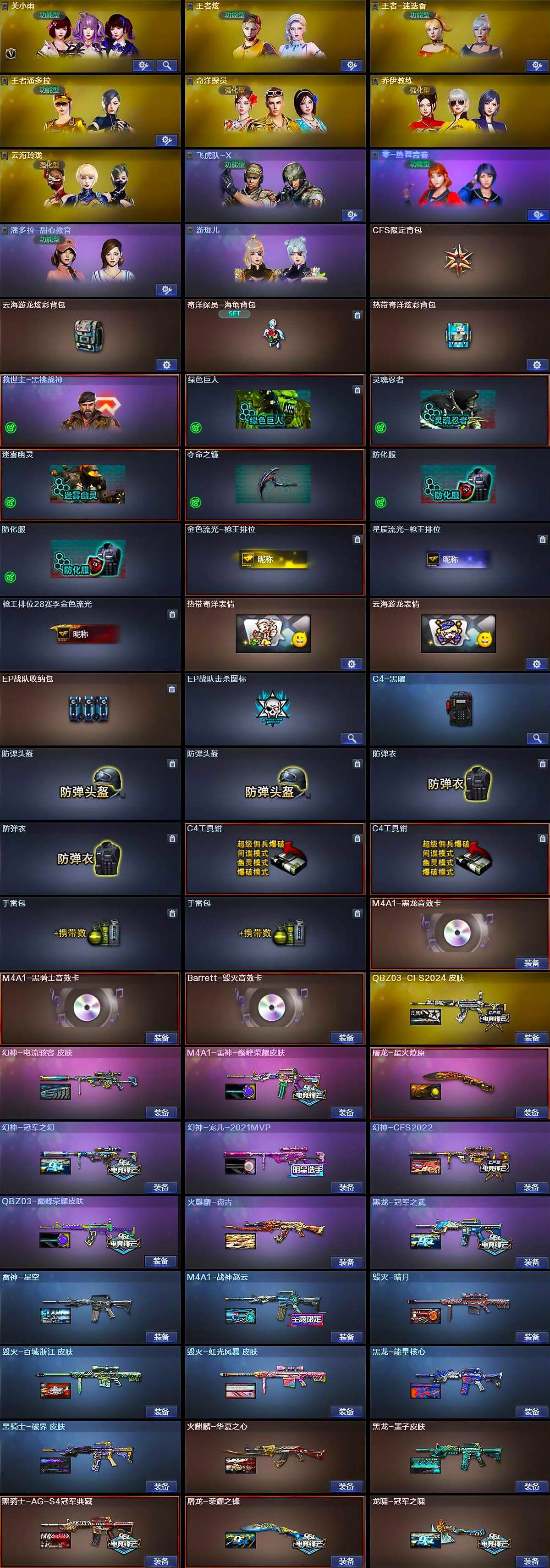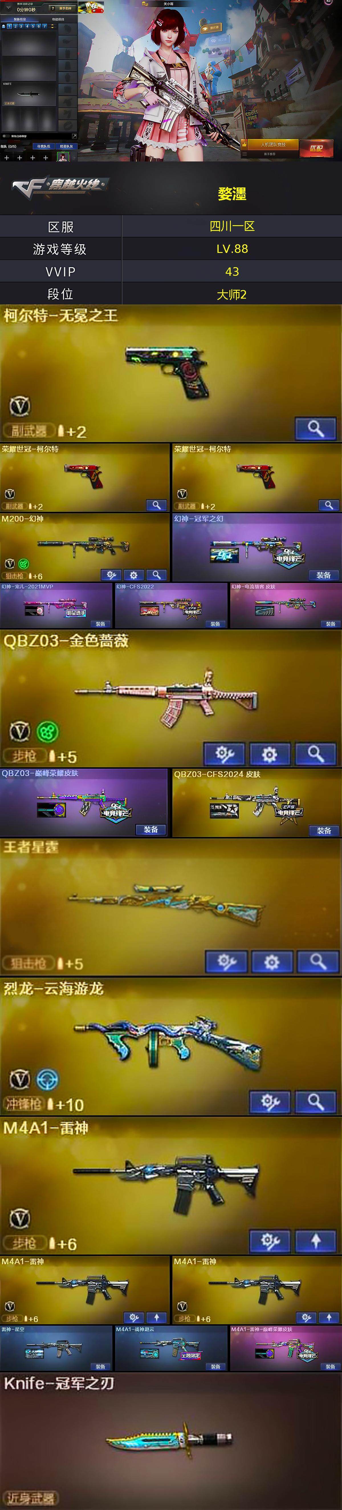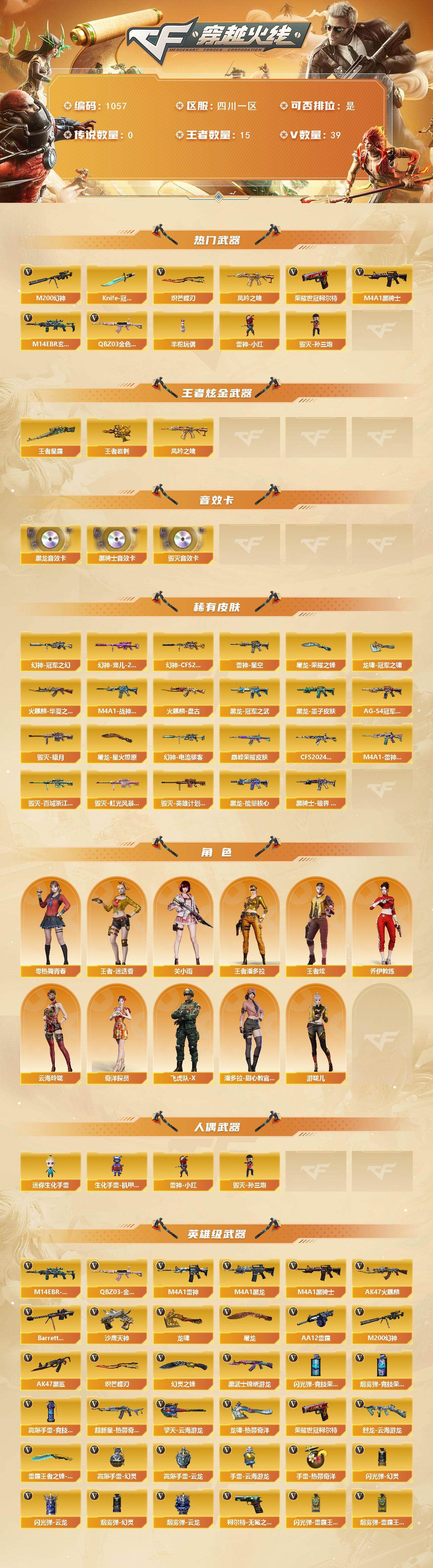 四川一区-39v-15王者-0炫金 【热门武器】:q03-金色蔷薇,m14ebr-玄武,m200-幻神,凤吟之魄,荣耀世冠-柯尔特2,m4a1-黑骑士,羊驼玩偶,雷神-小红,毁灭-孙三炮,knife-冠军之刃,炽芒蝶刃 【王者炫金武器】:凤吟之魄,王者星霆,王者岩刺 【音效卡】:m4a1-黑龙音效卡,m4a1-黑骑士音效卡,barrett-毁灭音效卡 【皮肤】:幻神-冠军之幻,幻神-宠儿