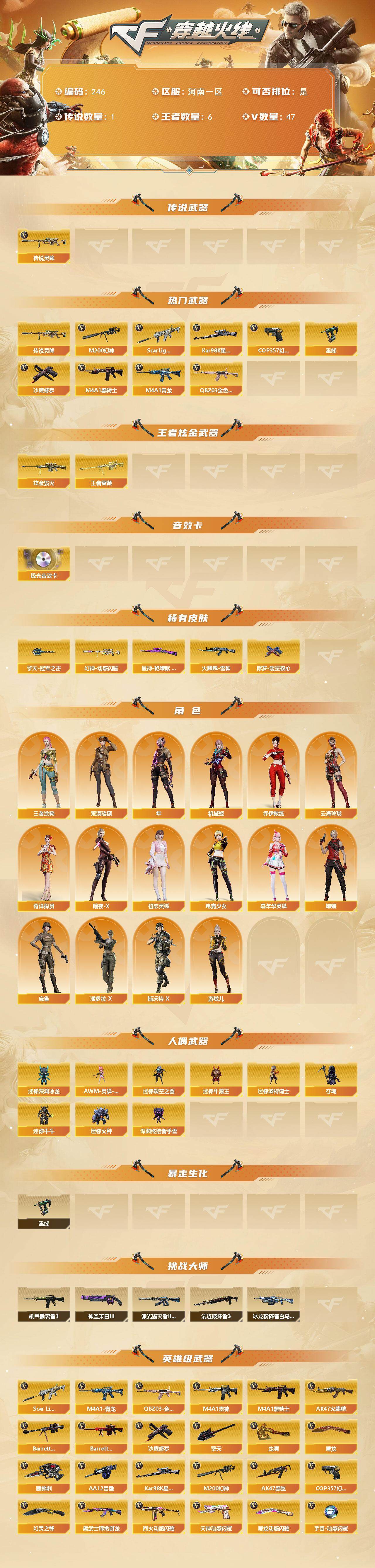 【246】特15663北部河南一区可排位可二次【河南一区/52v/vip6/1传说】【纯白无封号/哔哩哔哩名片/挑战爆破全能/传说灵眸/臻选次元套擎天柱9阶段/幻神带皮/星神带皮/烈龙毒蜂/主流武器/2四防角色】【m200-幻神/幻神-动感闪耀 皮肤】【kar98k-星神/星神-呛娘默 皮肤】【scar light-白虎】【q03-金色蔷薇】【隼/荒漠琉璃】【m4a1-雷神】【cop 357-幻灵】【barrett-毁灭/毁灭-云海游龙皮肤】【ak47-火麒麟/火麒麟-cfstar/火麒麟-雷神】【m4a1-黑骑士2】【黑武士-锦绣游龙】【barrett-极光/barrett-极光音效卡】【烈龙-云海游龙】【炼狱-悦蓝】【沙鹰-修罗3/修罗-cfstar/修罗-能量核心】【天神-动感闪耀】【麒麟刺】【擎天/擎天-冠军之击/擎天-云海游龙】【屠龙/屠龙-动感闪耀】【龙啸/龙啸-烈火龙威】【王者涂鸦/机械姬/王者涂鸦/暗夜-x/奇洋探员/云海玲珑/乔伊教练/超能特工/麻雀/妲己/娟娟/潘多拉-x/斯沃特-x/幻影/堕天使】【m4a1-青龙】【aa-12-雷霆/ak47-黑
