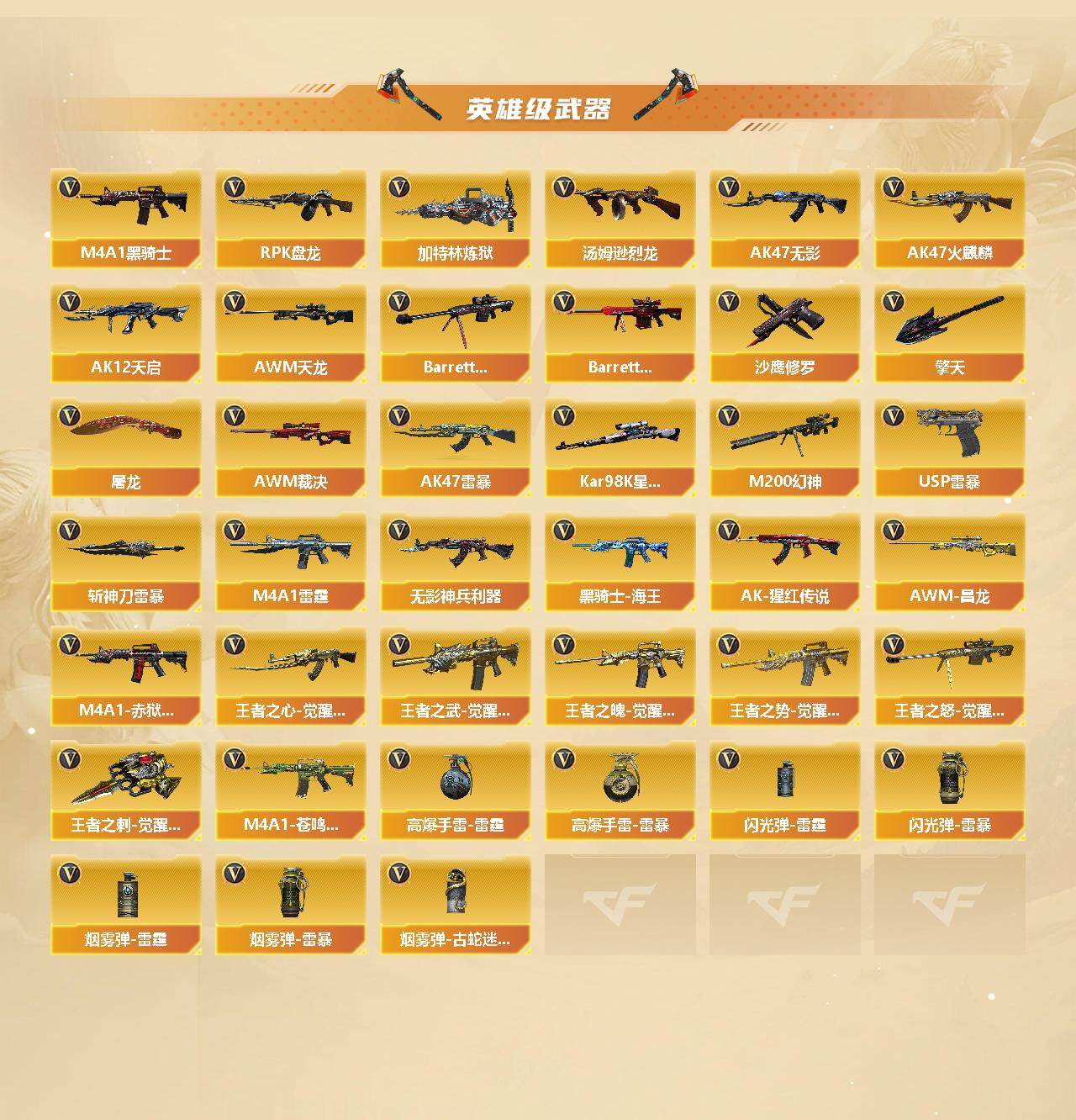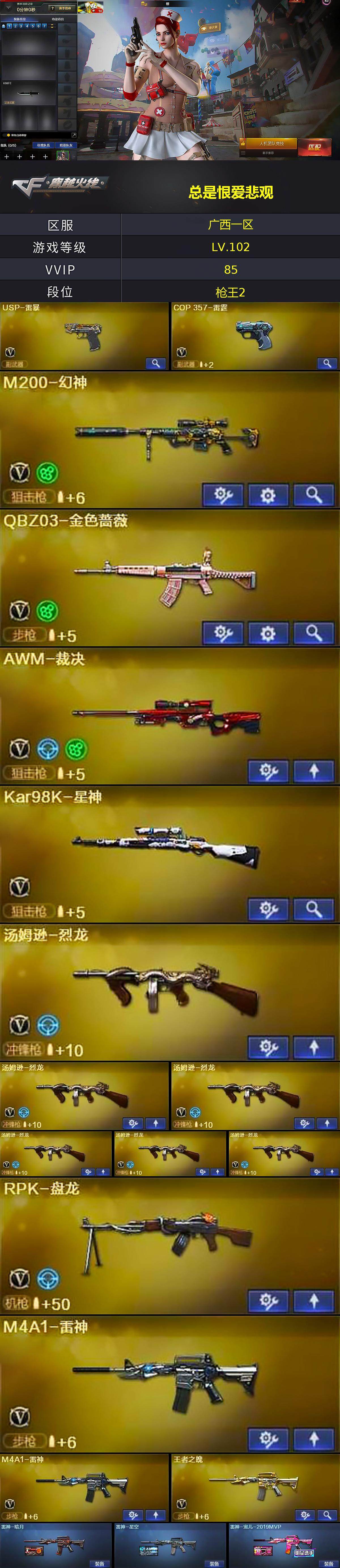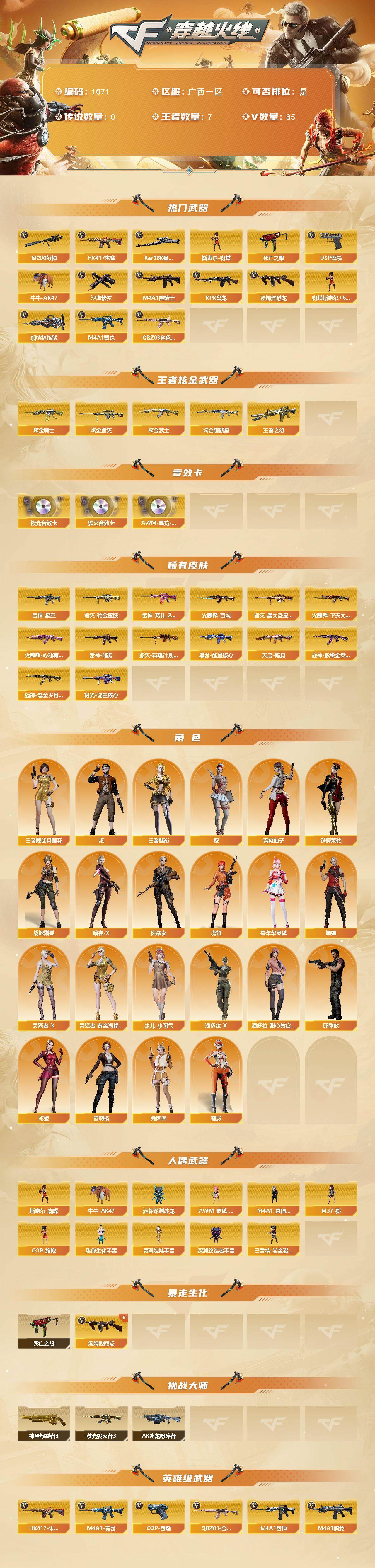 [14901076]广西一区-85v-7王者-4炫金 【热门武器】:q03-金色蔷薇,hk417-朱雀,m4a1-青龙,m200-幻神,死亡之眼,kar98k-星神,牛牛-ak47,m4a1-黑骑士2,汤姆逊-烈龙6,rpk-盘龙,加特林-炼狱,斯泰尔-蝴蝶,usp-雷暴,沙鹰-修罗3 【王者炫金武器】:王者之幻,炫金骑士,炫金武士,炫金超新星,炫金毁灭 【音效卡】:barrett-毁灭音效卡,barrett-极光音效卡,awm-昌龙-怀旧音效卡2 【皮肤】:雷神-暗月,雷神-星空,雷神-宠儿-2019mvp,火麒麟-平天大圣,火麒麟-百城,火麒麟-心动糖果,毁灭耀金皮肤,毁灭-黑大圣皮肤,毁灭-英雄计划 皮肤,黑龙-能量核心,天启-暗月,战神-紫绶金章皮肤,战神-流金岁月皮肤,极光-能量核心 【角色】:樱,炫,战地猎狐,王者-瞳-闭月羞花,王者-魅影,暗夜-x,风暴女,虎妞,嘉年华灵狐,娟娟,灵狐者-x,灵狐者-黄金海岸,龙儿-小淘气,潘多拉-x,潘多拉-甜心教官,邱刚敖,青霞仙子,蛇姬,铁骑荣耀,兔囡囡,雪莉杨,智影 【人偶武器】:m4a1-雷神-精英刀锋,斯泰尔-蝴蝶,awm-灵狐-15周年嘉年华,m37-葵,cop-旗袍,牛牛-ak47,迷你深渊冰龙,迷你生化手蕾,深渊终结者手蕾,芭蕾特-赏金猎人,灵狐娃娃手蕾 【暴走生化】:死亡之眼 【挑战大师】:神圣爆裂者iii,ak47-冰龙粉碎者,激光毁灭者iii 【英雄级武器】:ak47-火麒麟2,m4a1-黑龙,m4a1-雷神2,m4a1-黑骑士2,ak47-无影,ak12-天启,m4a1-雷霆,ak47-雷暴,m4a1-青龙,hk417-朱雀,无影-神兵利器,q03-金色蔷薇,王者之心-觉醒版,王者之武-觉醒版,王者之魄-觉醒版,王者之势-觉醒版,ak-47-猩红传说2,黑骑士-海王2,awm-天龙,barrett-毁灭,barrett-极光,awm-裁决,m200-幻神,kar98k-星神,王者之怒-觉醒版,rpk-盘龙,加特林-炼狱,汤姆逊-烈龙6,沙鹰-修罗3,usp-雷暴,cop-雷霆,屠龙5,擎天,斩神刀-雷暴,王者之刺-觉醒版,高爆手蕾-雷霆6,高爆手蕾-雷暴5,闪光丹-雷霆6,闪光丹-雷暴5,盐雾蛋-雷霆6,盐雾蛋-雷暴5,盐雾蛋-古蛇迷踪,m4a1-赤狱骑士,m4a1-